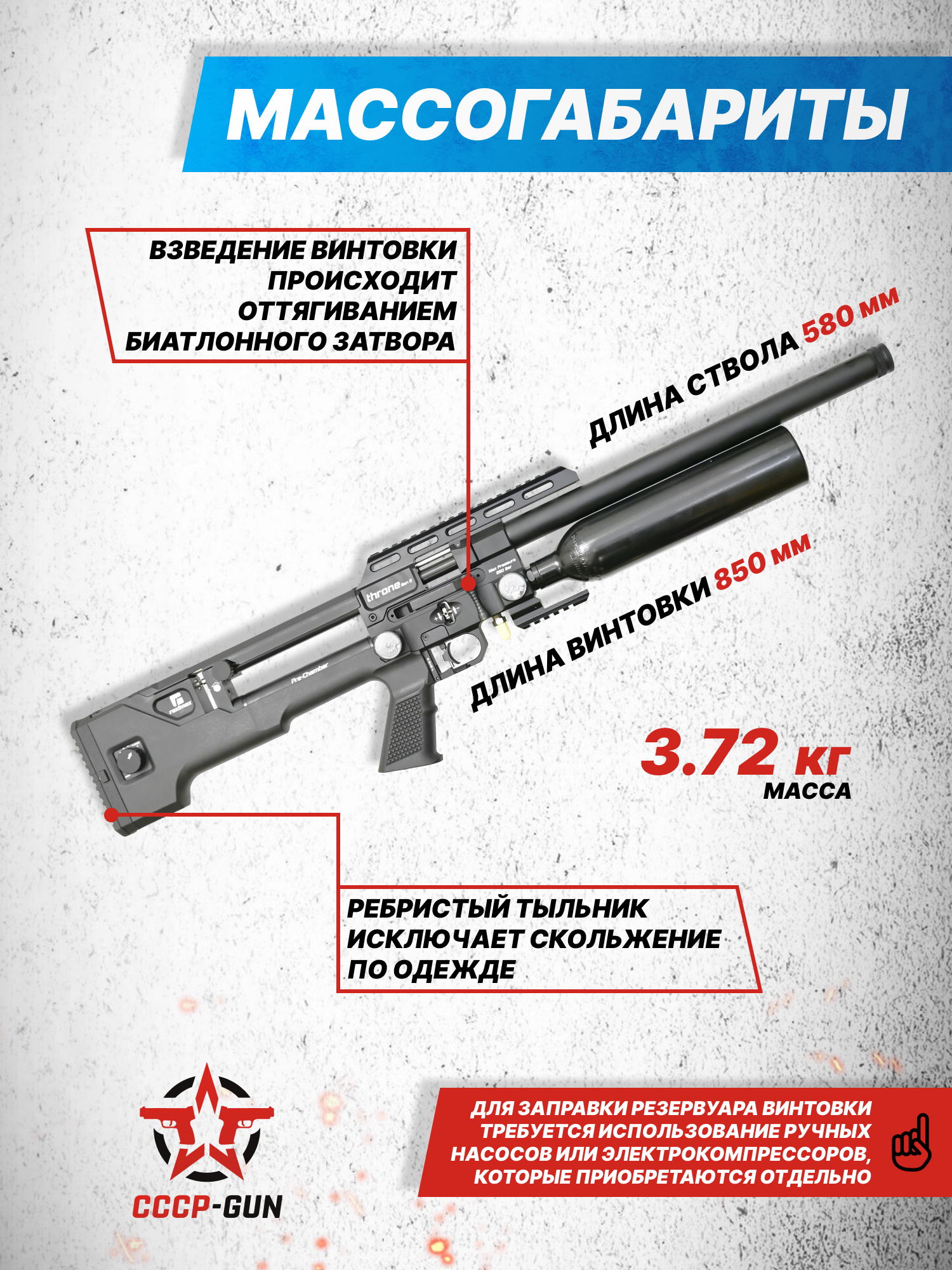 Для автономности пневматики изготовитель решил применить схему питания с увеличенным резервуаром - колба на 425 кубических сантиметров воздуха поможет раскрыть характеристики винтовки и при этом не ущемить себя в количестве возможных выстрелов. Верхняя граница заправки баллона, допустимая к эксплуатации - 250 Бар, при этом в резервуаре присутствует дополнительный запас прочности для безопасности.