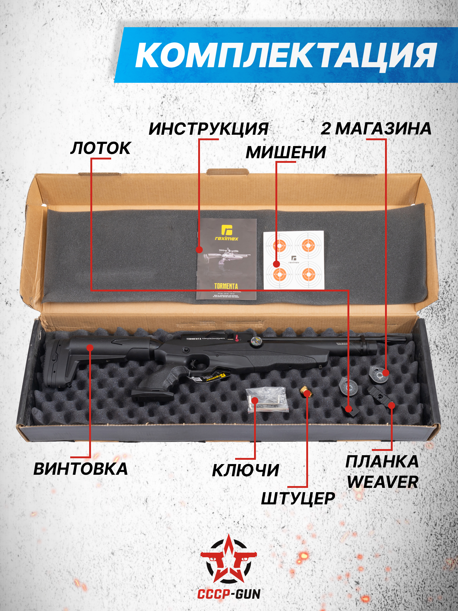 Представленная винтовка Reximex Tormenta 5.5 выделяется своими компактными размерами в 850 мм, несмотря на классическую компоновку конструкции. Главной особенностью пневматики с такими габаритами является наличие сразу двух резервуаров под сжатый воздух, а точнее колба на 380 кубических сантиметров и трубчатый ресивер на 250 кубических сантиметров. Для контроля показателя рекомендуемого давления, которое составляет двести пятьдесят Бар, оружие оснащено манометром.