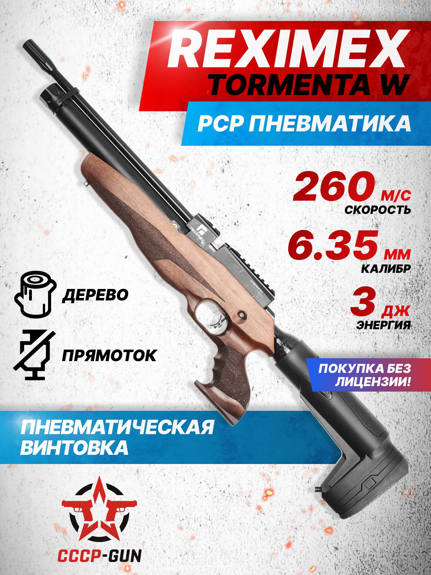 Reximex Tormenta Wood в представленной вариации разгоняет "воланчиковые" пули до скорости свыше 260 м/с, но на российский рынок производитель поставляет винтовки с фиксированной дульной энергией, разрешенной для свободной покупки. Поскольку указанная характеристика составляет 3 Джоуля, будущему владельцу при себе нужно иметь только паспорт, подтверждающий совершеннолетний возраст, а оружейная лицензия не понадобится. Стоит отметить, что модель дополнена ручным двухпозиционным предохранителем для безопасной эксплуатации изделия.