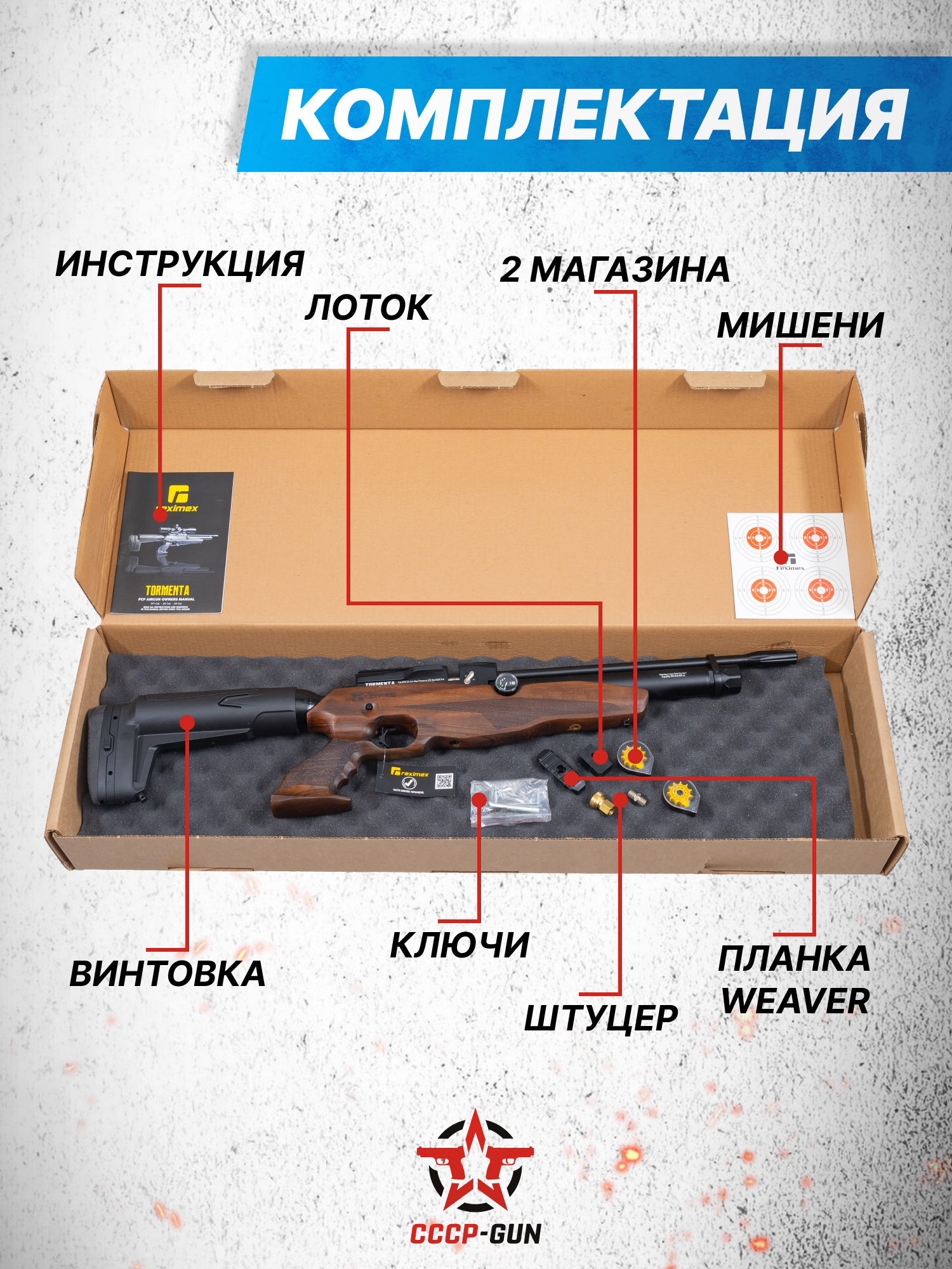 Конструкторы Reximex предусмотрели установку тюнинга и добавили в переднюю часть цевья под трубчатым ресивером резьбовое отверстие для фиксации планки Пикатинни, на которую и монтируются сошки, рукояти или другие специальные приборы. Также на винтовку добавлена гибридная направляющая типа Вивер 22 мм и «Ластохвост» 11 мм для того, чтобы у пользователя был больший выбор прицельных устройств с разным видом колец и моноблоков. Таким образом, стрелок может приобрести и установить понравившийся коллиматор или оптику для комфортной стрельбы.