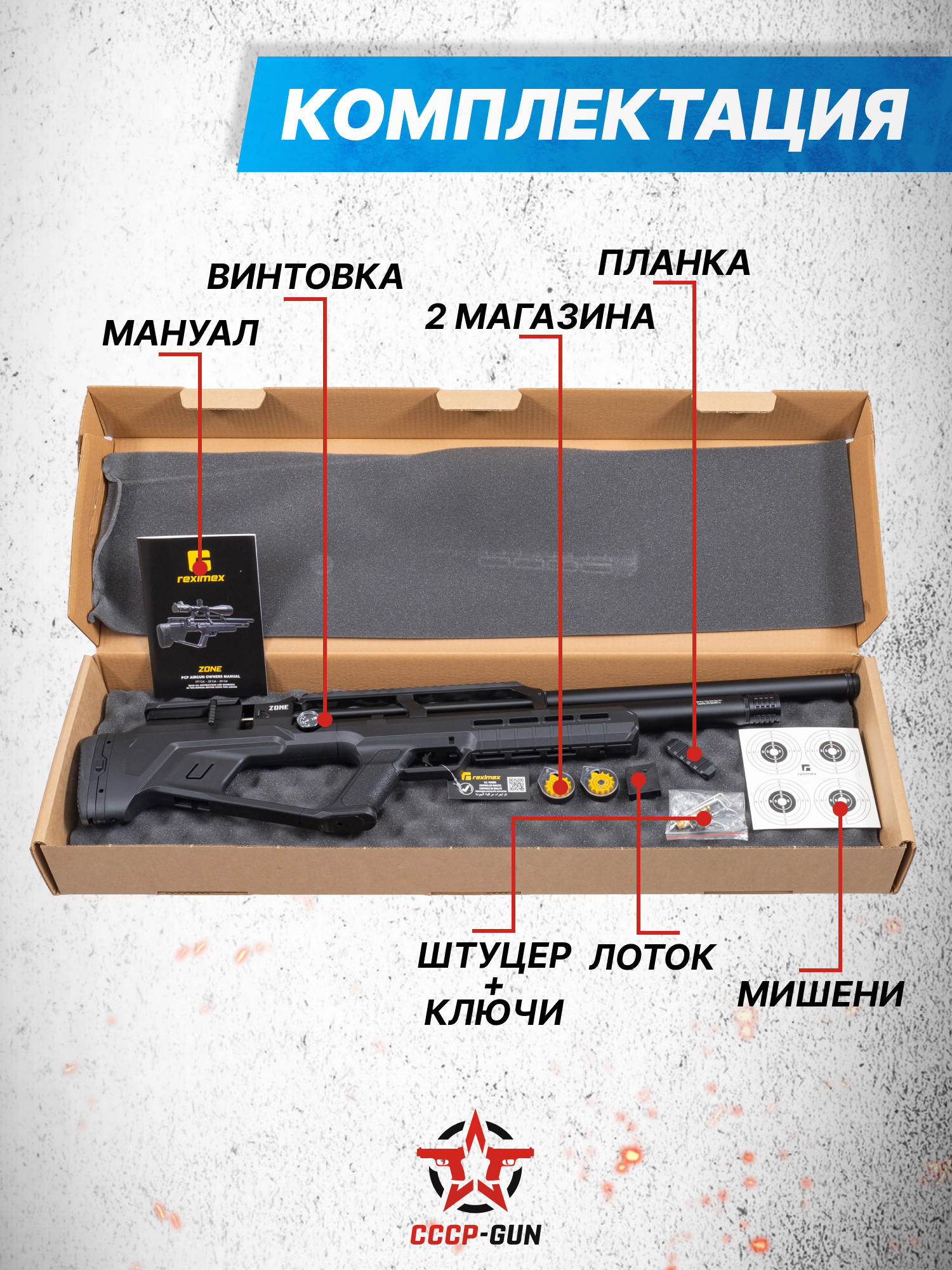 Обозреваемая винтовка Reximex Zone использует воланчиковые пули из свинца, которые заряжаются внутрь 12-слотвого магазина барабанного формата, автоматически прокручивающегося в момент взведения оружия. Точность достигается за счет установленного 58-сантиметрового ствола под калибр 5.5 мм, задающего верную траекторию снарядам. Для повышения удобства пользователя и ускорения темпа стрельбы рычаг взвода имеет плавный ход.