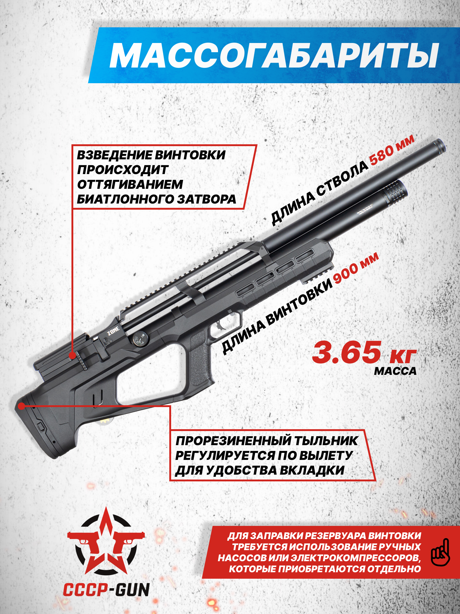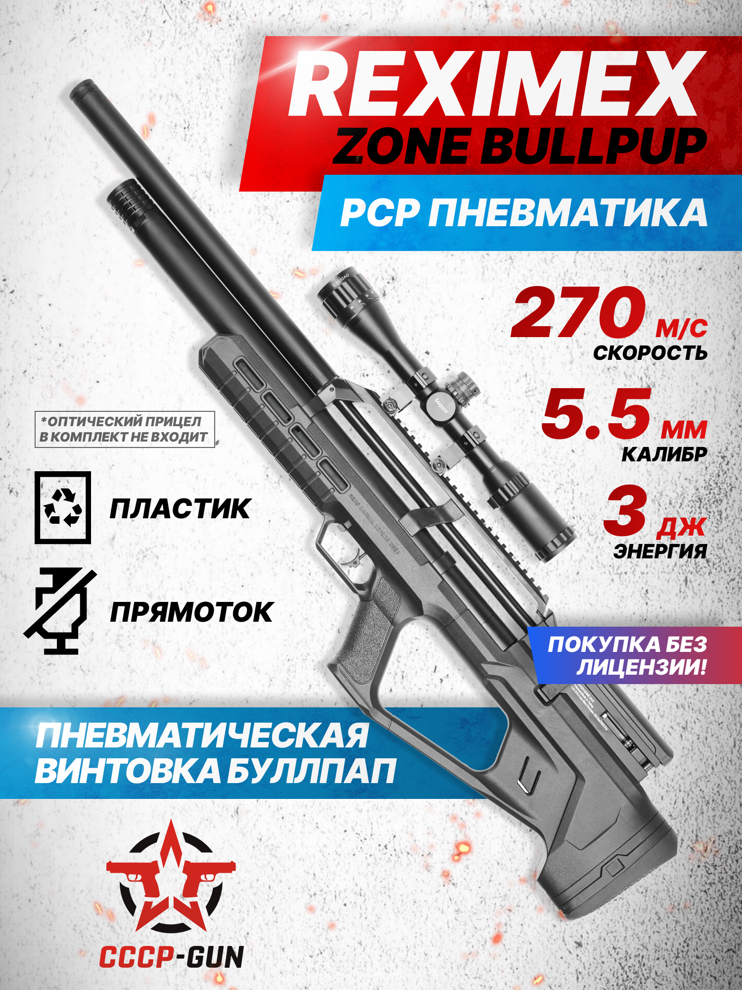 Модель Reximex Zone 5.5 относится к винтовкам с предварительной накачкой в компоновке формата Bull-Pup. Конструкция такого вида в комплексе с полимерной ложей позволяет сократить габариты изделия до 900 мм и сделать пневматику легче, снизив вес до 3.65 кг. Инженеры дополнили образец прикладом с регулируемым противоскользящим тыльником и настраиваемой по высоте щекой, а также реализовали пистолетную рукоять с шероховатой поверхностью для плотного хвата оружия.