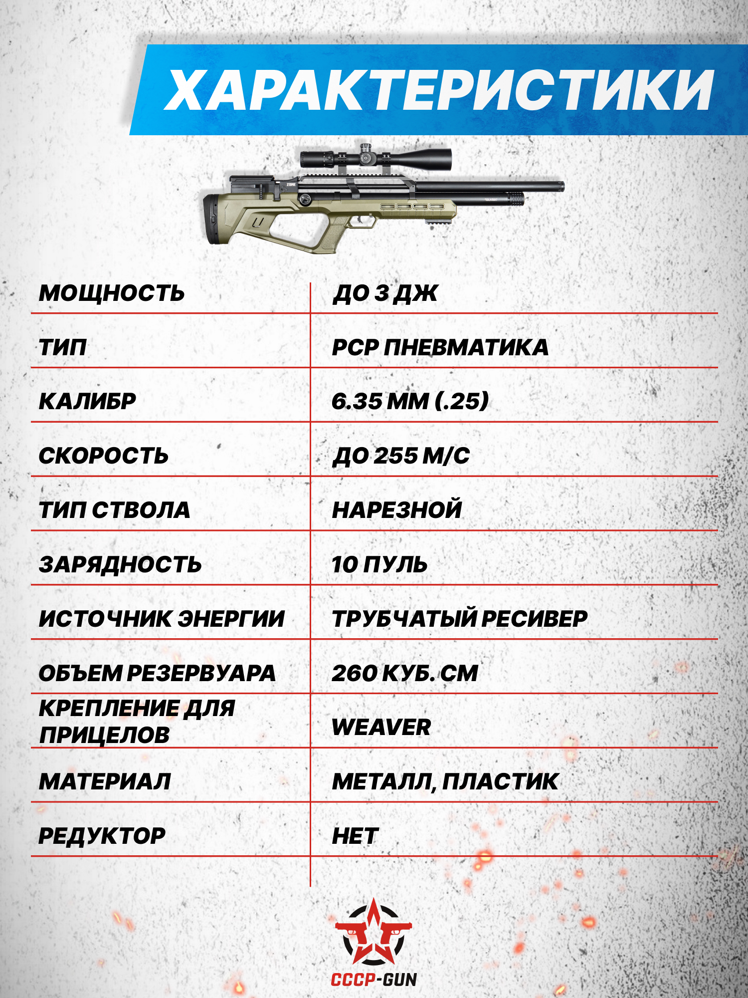 Разгоняются пули благодаря энергии сжатого воздуха, который закачивается в подствольный ресивер при помощи электрического компрессора. Объем резервуара составляет 260 кубических сантиметров, а рекомендуемое рабочее давление не должно превышать 250 Бар, поэтому для отслеживания данного параметра на винтовке спроектирован манометр. Функционирует пневматика по прямотоку, а благодаря регулировочному узлу пользователь может настраивать мощность высвобождения воздуха.