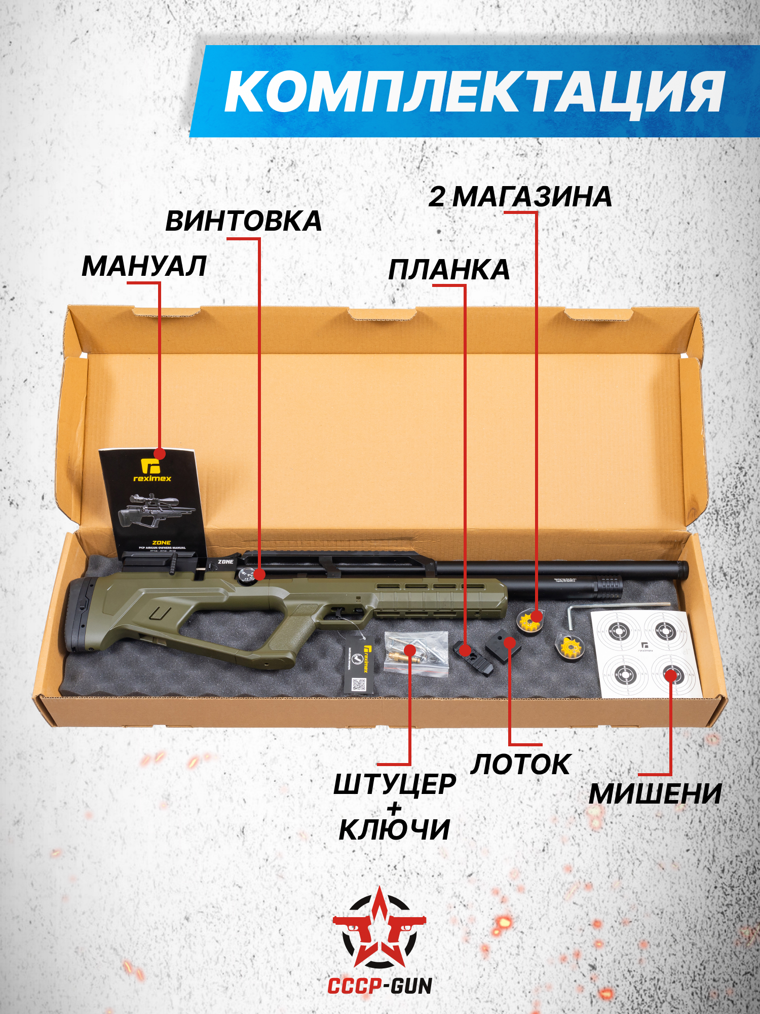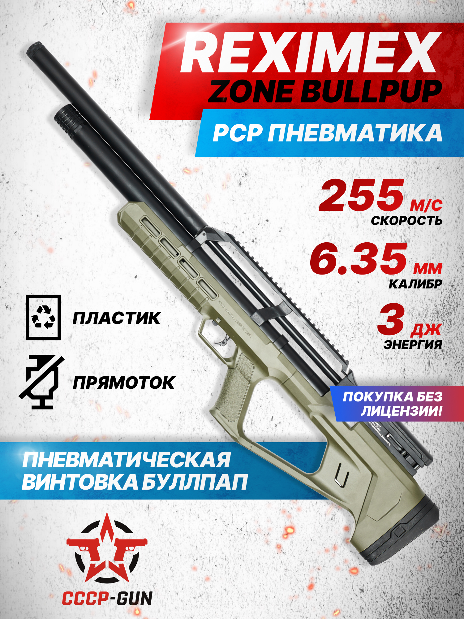Винтовка Reximex Zone 6.35 мм в окраске OD Green отличается полимерной ложей из ударостойкого материала, благодаря чему инженерам удалось снизить массу изделия до 3.6 кг. Компоновка Bull-Pup дала возможность сократить длину пневматики и получить габариты 90x20x50 см, что благоприятно влияет на компактность модели и помогает комфортно переносить оружие. Для повышения удобства пользователя производитель реализовал такие опции, как пистолетную рукоять, настраиваемый по высоте тыльник приклада и подщечник с функцией регулировки положения.