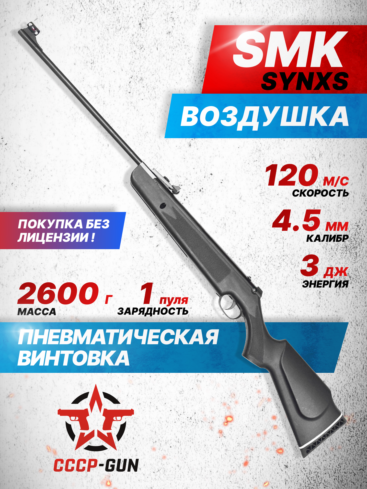 Представленная модель SMK Synxs 4.5 поставляется в Российскую Федерацию с дульной энергией равной 3 Джоулям, поэтому приобрести изделие получится при наличии паспорта без оформления дополнительных разрешений. Средний показатель скорости полета легких воланчиковых боеприпасов из свинца составляет порядка 250 метров в секунду. Таким образом винтовка подойдет любителям развлекательной стрельбы для плинкинга по импровизированным целям или специальным минитирам.