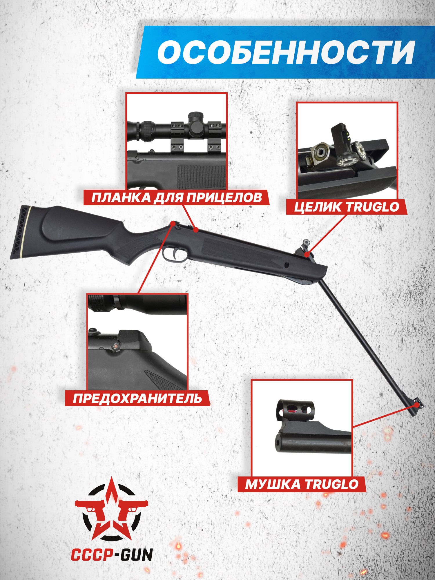 С завода винтовка оснащена мушкой и настраиваемым целиком, поэтому работать с пневматикой получится сразу из коробки. Чтобы прицельные маркеры выделялись на темном фоне инженеры добавили в их конструкцию фиброоптические стержни. Также стрелять из винтовки можно, используя оптику или коллиматоры, для установки которых спроектирована планка распространенного формата крепления типа «Ласточкин хвост» 11 миллиметров.