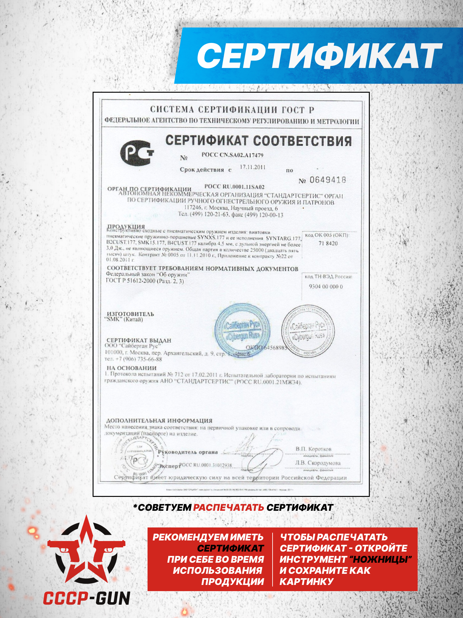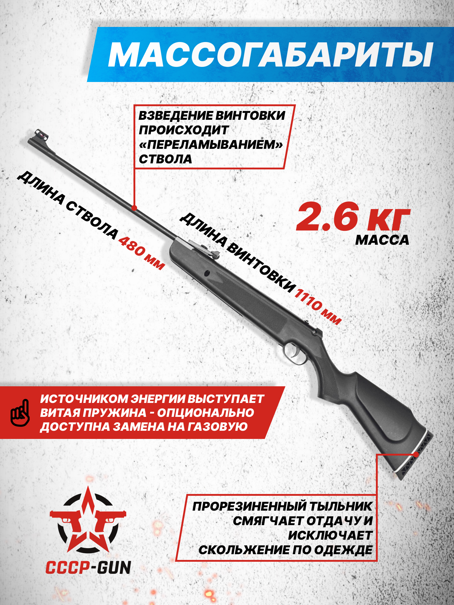 Внимание! Данная модель поставляется в разрешенной мощности для свободного приобретения на территории Российской Федерации. При этом в модели имеется возможность увеличения мощности путем замены части деталей или настройки конструкции, однако не стоит забывать о Федеральном законе «Об оружии» № 150 - ФЗ. В случае необходимости, опираясь на данный закон и руководствуясь им, возможно, потребуется получить разрешение от ЛЛР ГУ МВД России после вмешательства в конструкцию.