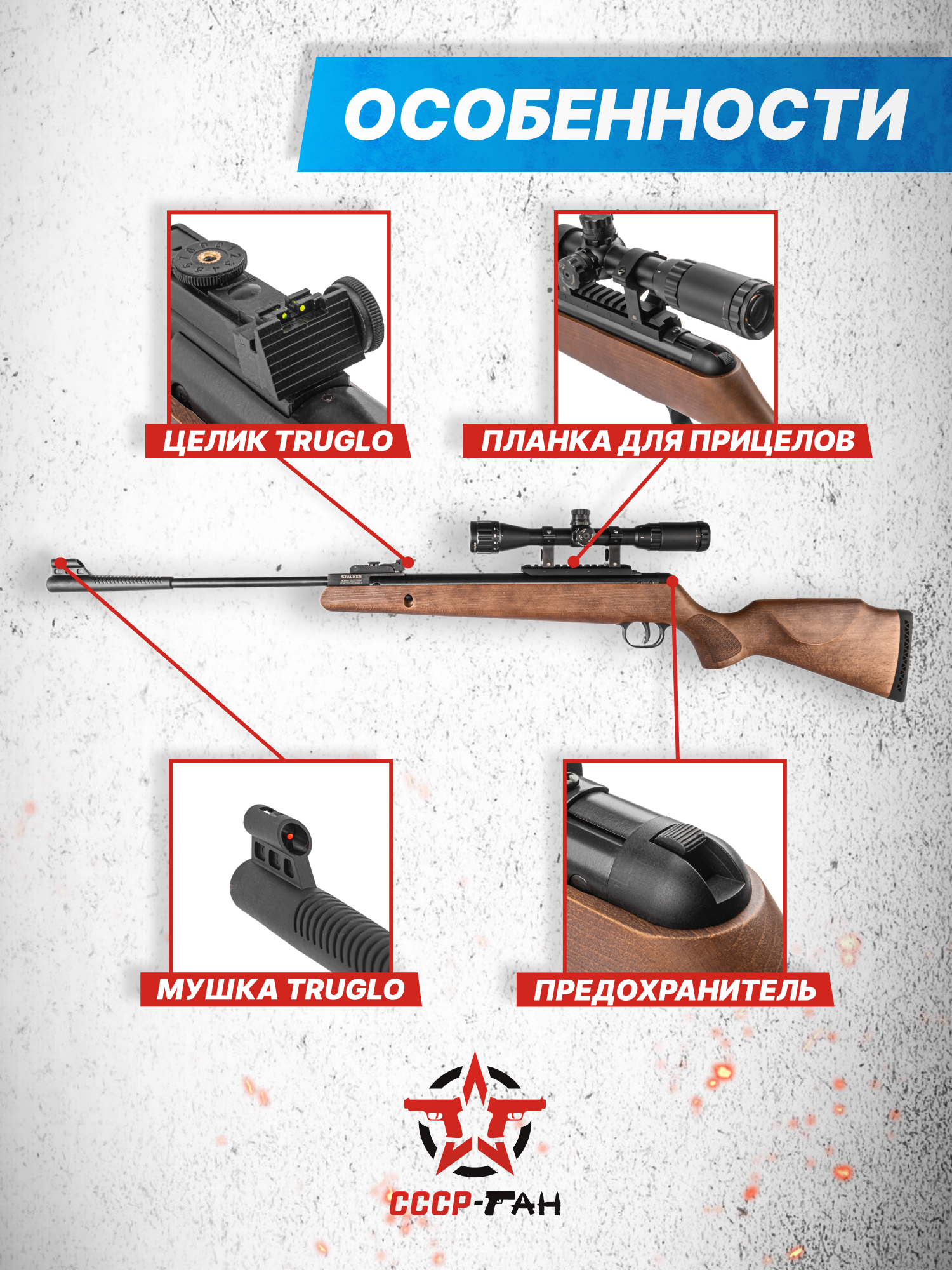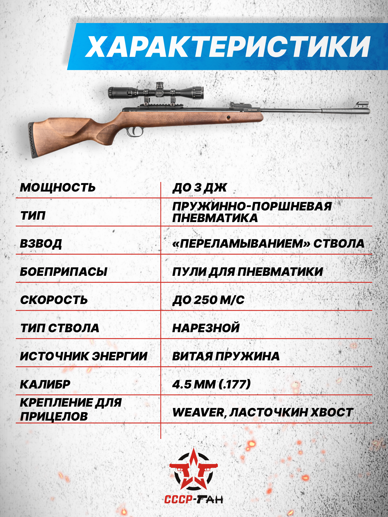 Внимание! Данная модель поставляется в разрешенной мощности для свободного приобретения на территории Российской Федерации. При этом в модели имеется возможность увеличения мощности путем замены части деталей или настройки конструкции, однако не стоит забывать о Федеральном законе «Об оружии» № 150 - ФЗ. В случае необходимости, опираясь на данный закон и руководствуясь им, возможно, потребуется получить разрешение от ЛЛР ГУ МВД России после вмешательства в конструкцию.