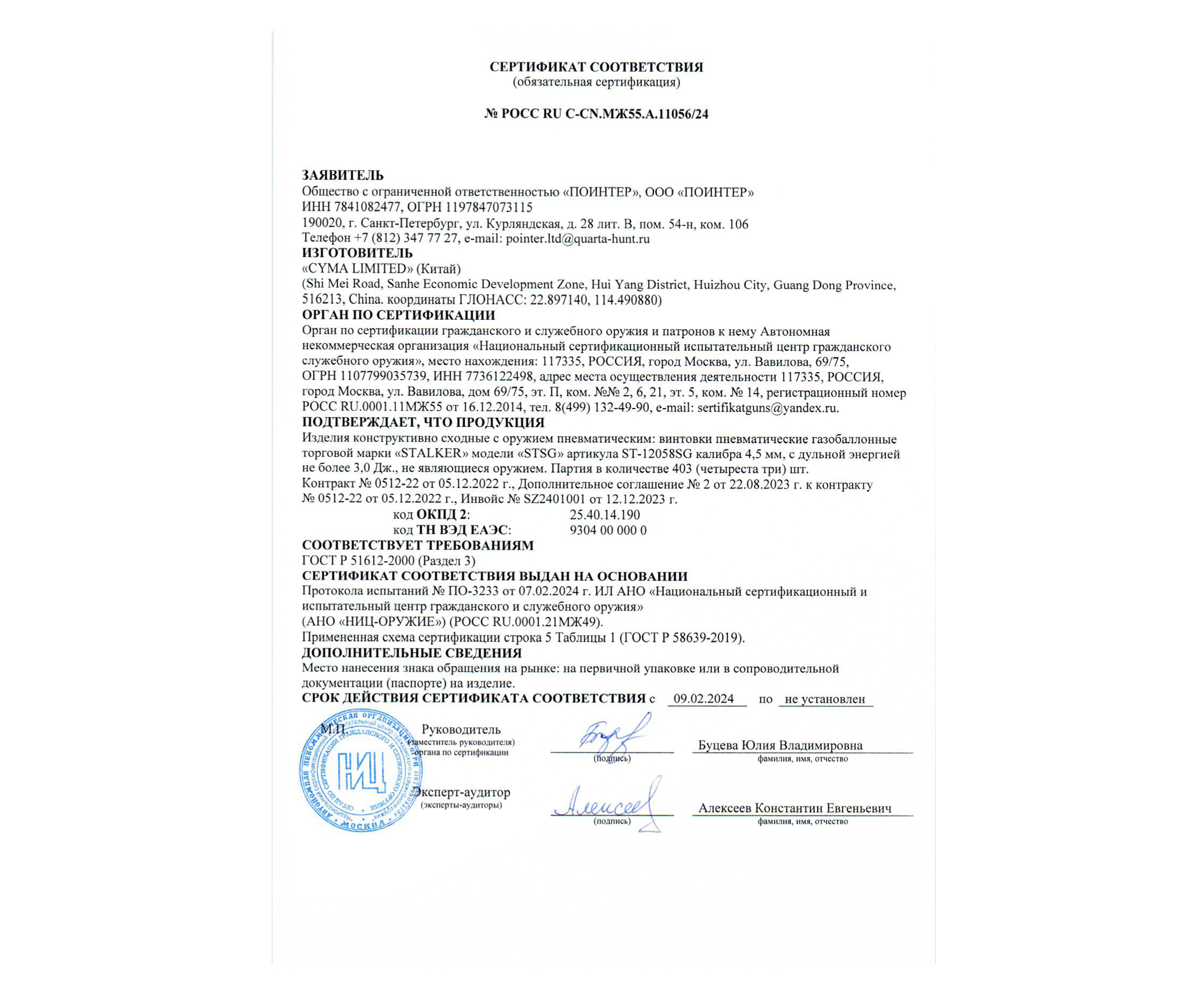 В России купить Stalker Shotgun 4.5 можно без оформления лицензии, поскольку изделие относится к категории КСОИ ввиду дульной энергии, не превышающей допустимой нормы. Несмотря на то, что мощность модели составляет 3 Дж, скорость до которой представленный дробовик разгоняет снаряды составляет 125 метров в секунду. Таким образом, пневматика подходит для плинкинга и развлекательной стрельбы на отдыхе.