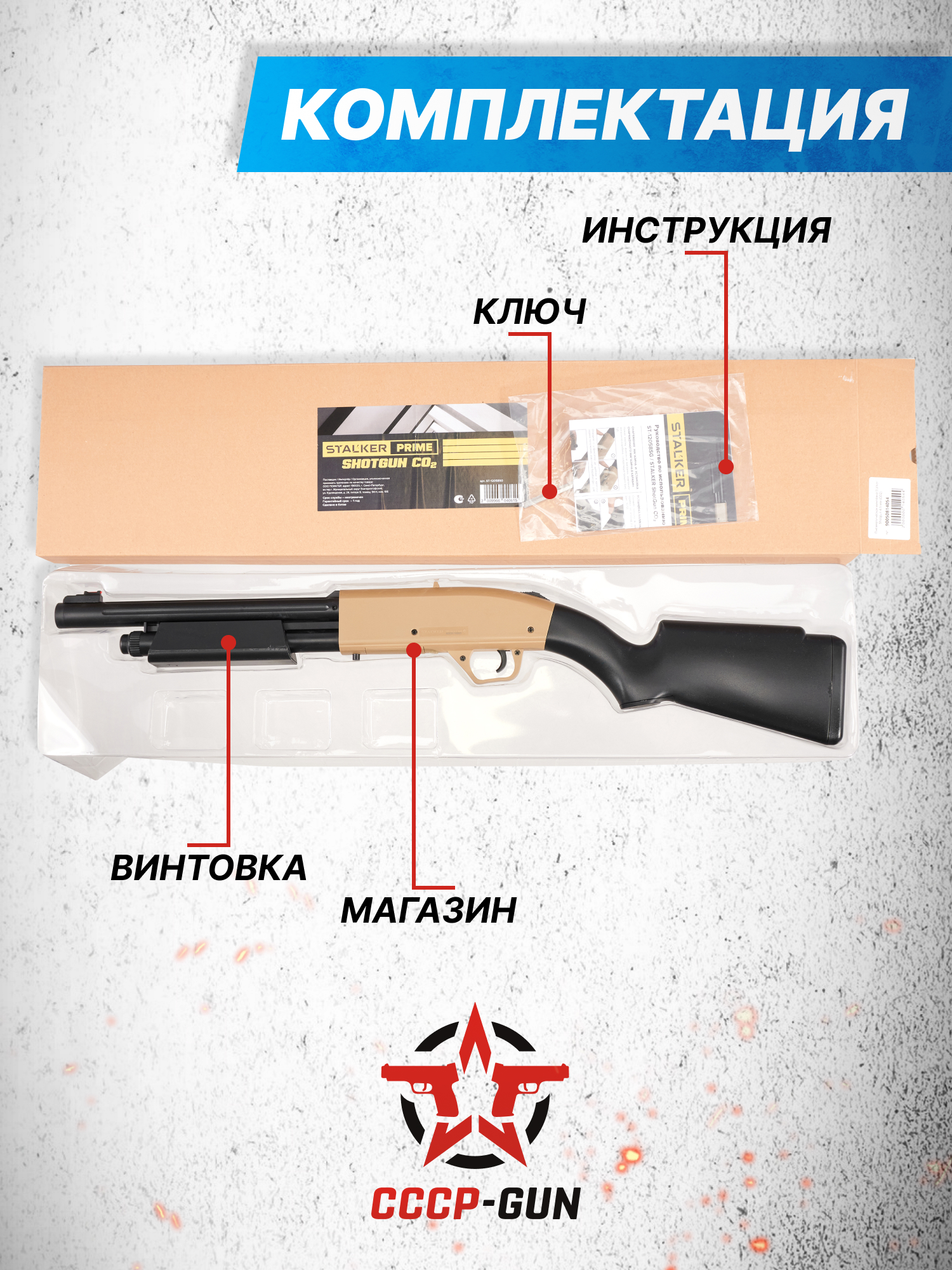 Stalker Shotgun CO2 4.5 мм представляет собой пневматическую винтовку, выполненную в образе короткой вариации дробовика Remington 870 с использованием черного и песочного цвета для окраса корпуса. Конструкторы неспроста вдохновлялись этим культовым экземпляром, поскольку данное помповое ружье использовалось на территории США с 1950-х армией, полицейскими, охотниками, а также гангстерами. Сейчас оружие применяется спецслужбами и группами быстрого реагирования в ряде стран.