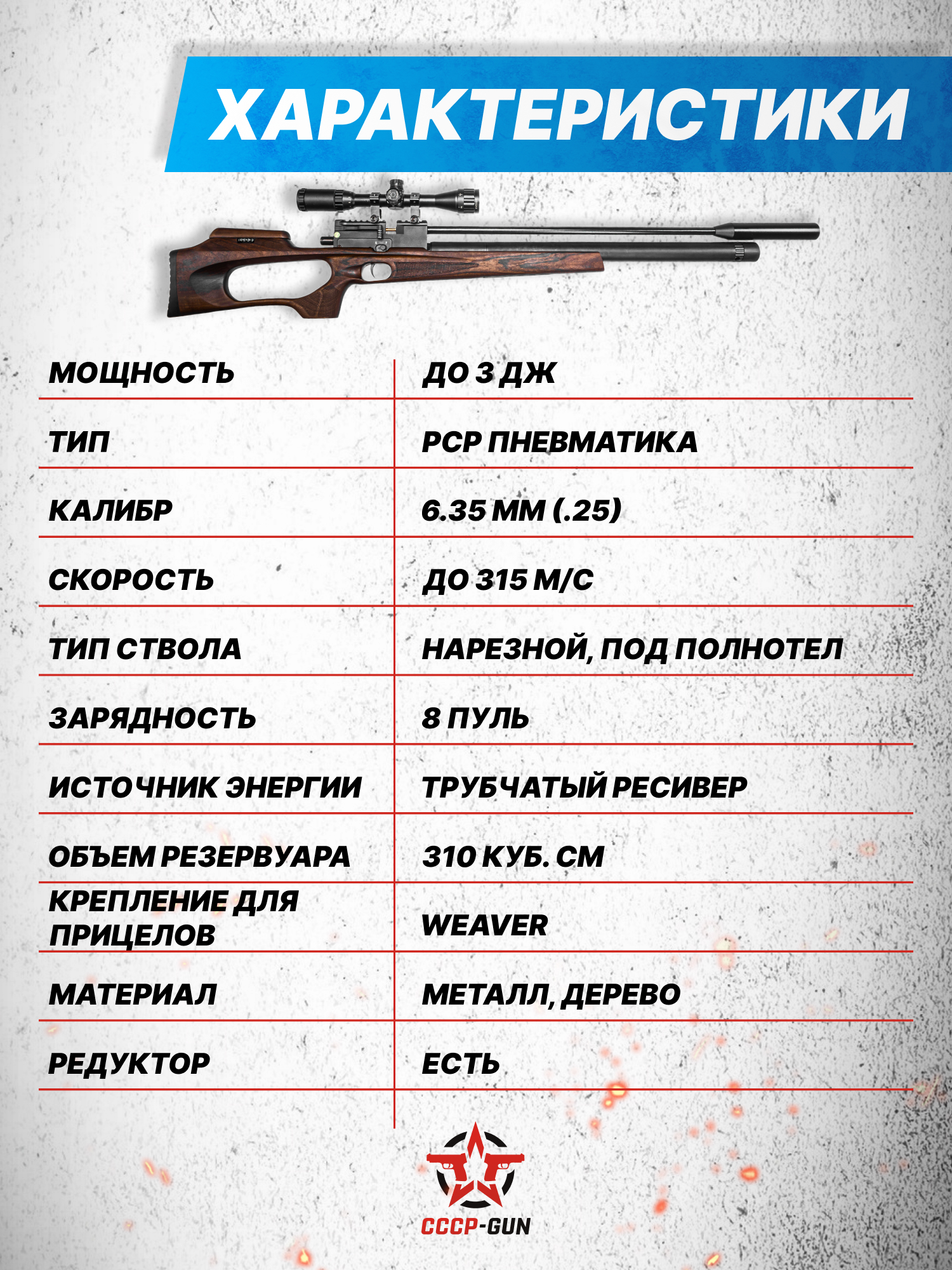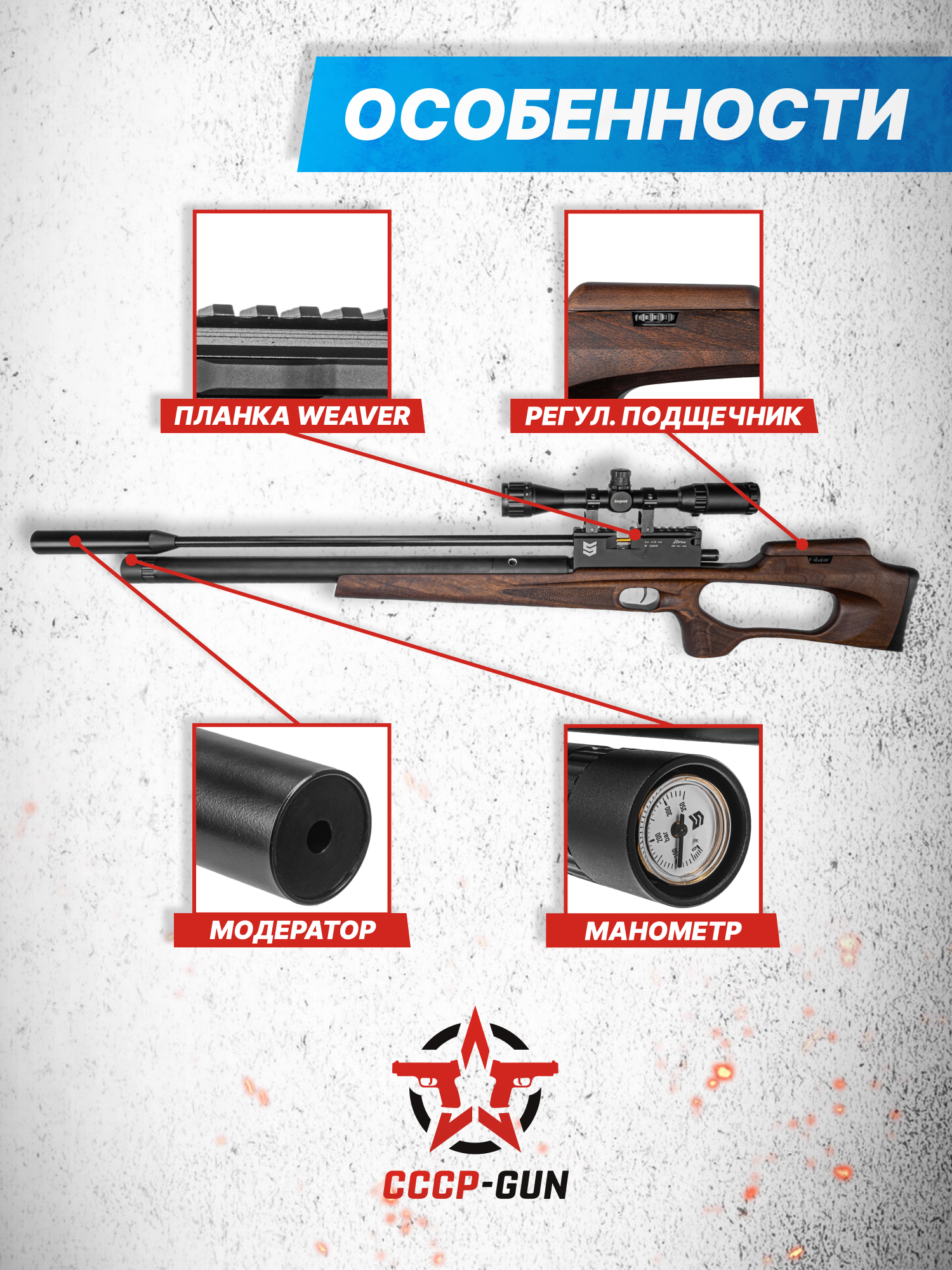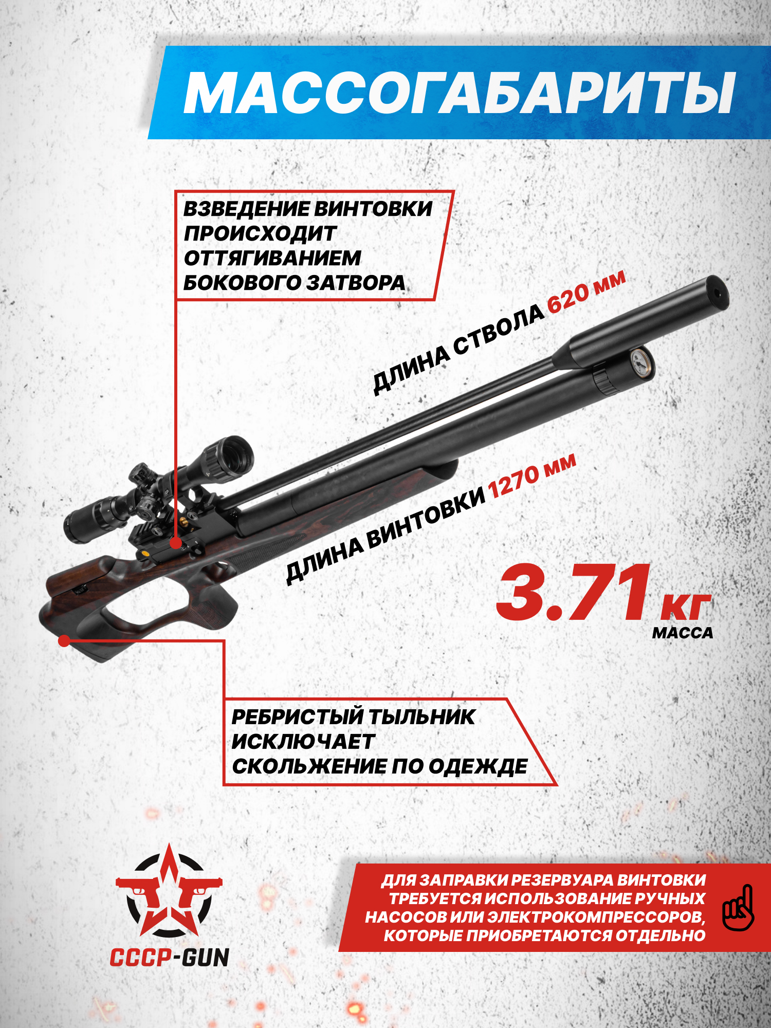 Максимально разрешенный уровень давления при наполнении равен 250 Бар. Реальное значение удобно отслеживать с помощью интегрированного измерительного прибора - манометр размещен под цевьем. Образец выполнен в ложе, изготовленной из цельной древесины - исполнение отличается эргономичной анатомически сформированной прикладной частью, которая включает подщечник с регулировкой, что дает возможность адаптировать вкладку.