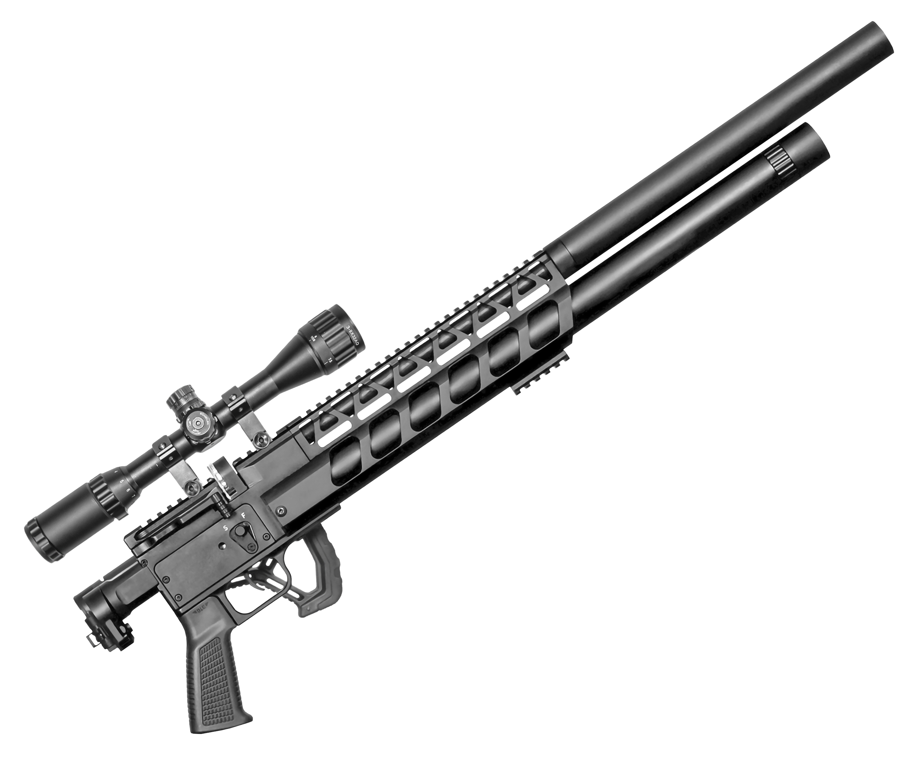 Повышенная кучность стрельбы обеспечивается за счет использования нарезного бланка длиной 55 см - учитывая его внутренний диаметр, для метания допускаются боеприпасы калибра 5.5 мм. Ствол изготовлен без какого-либо сужения на выходе, что дает возможность задействовать полнотелые тяжелые снаряды - дополнительно конструкция оснащается съемным модулем в виде модератора, предназначенным для снижения громкости звука при выстреле.