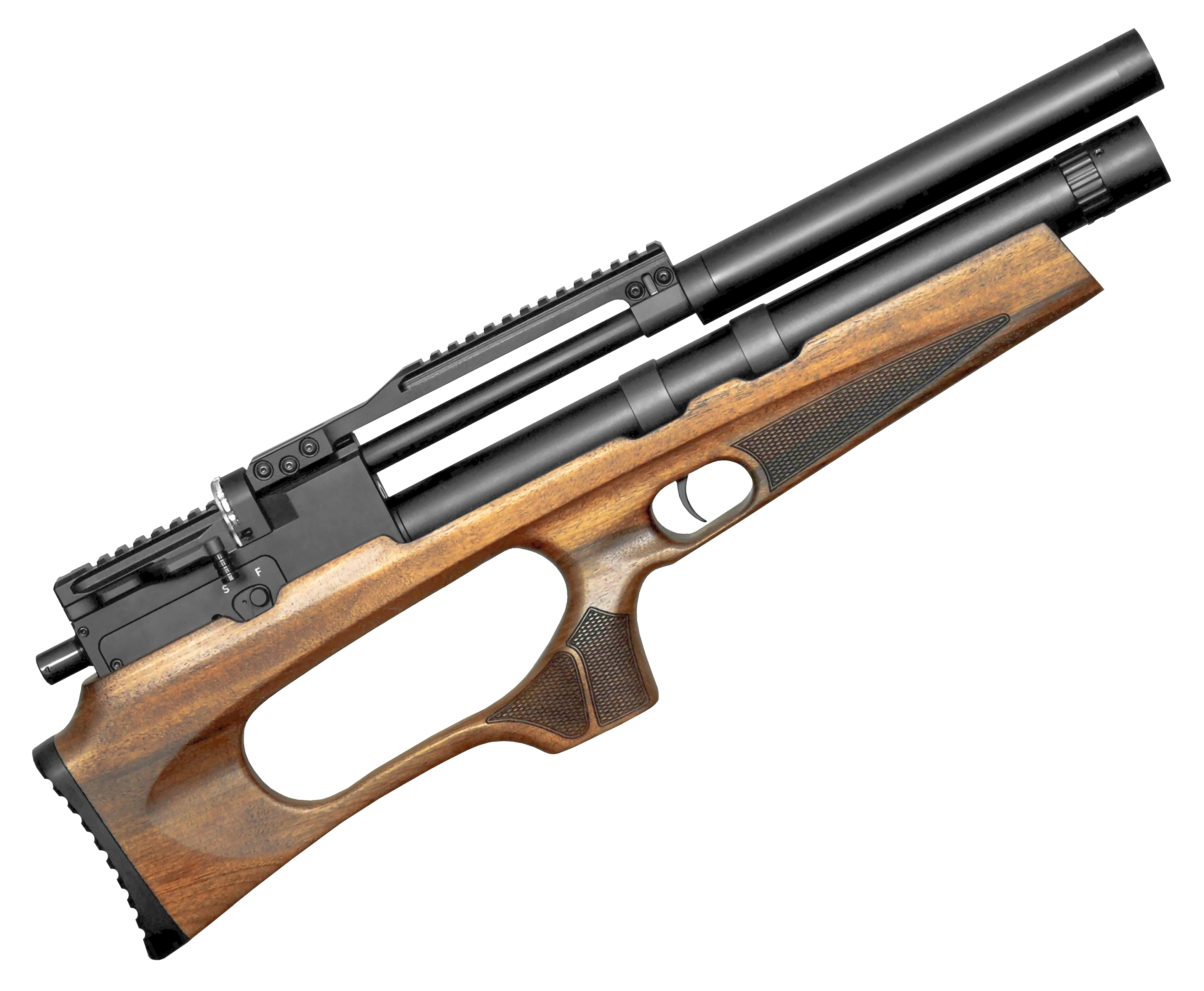 Несмотря на скромные размеры винтовки, конструкторам удалось разместить в ней полноценный баллон цилиндрической формы. Резервуар обладает полезным объемом 220 кубических сантиметров - для заправки применяются специальные ручные насосы или компрессоры, а для подключения шлангов предусмотрен штуцер в комплекте.