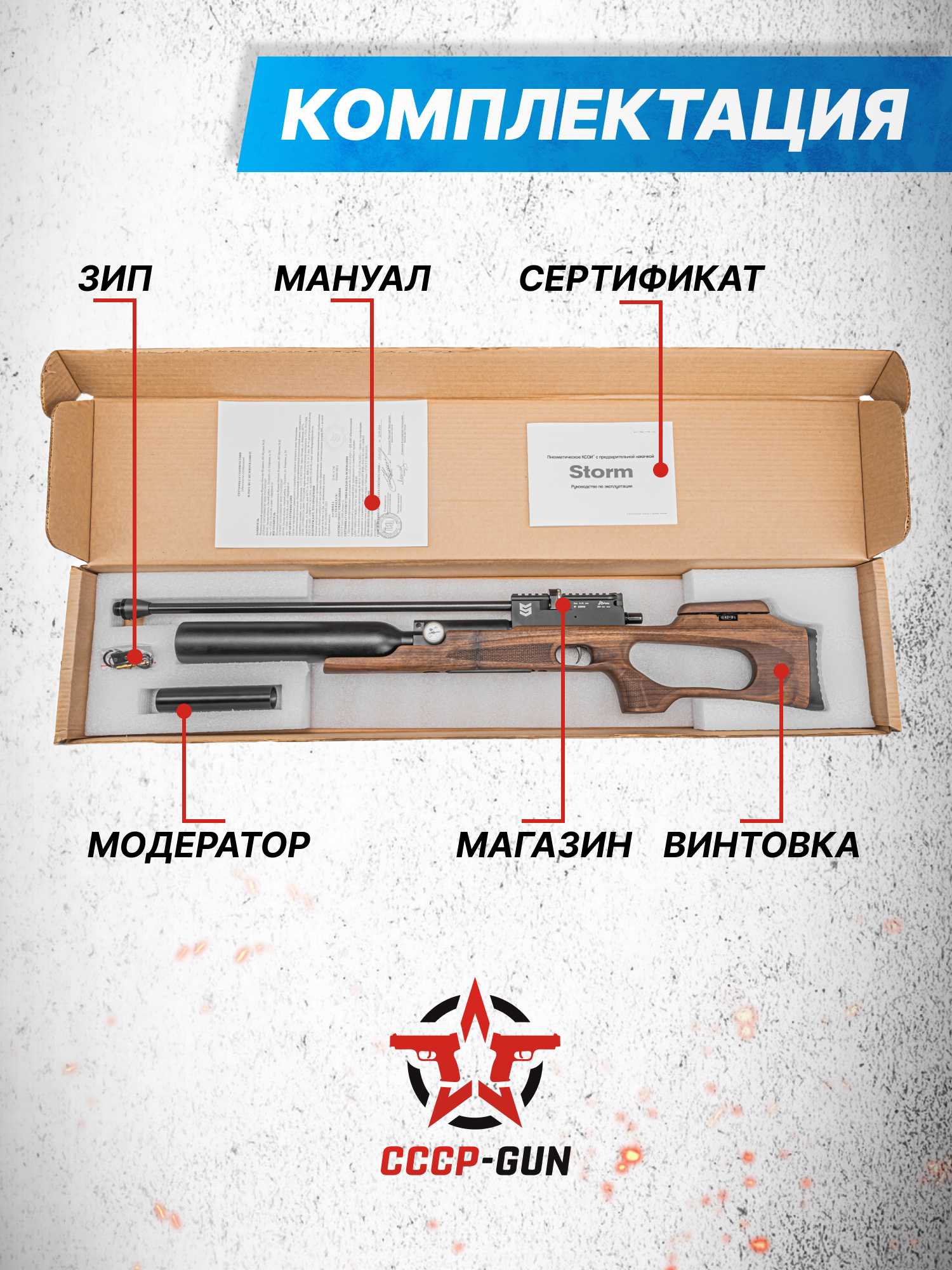 Одним из производителей пневматического оружия формата PCP выступает российская компания Шторм. Фирма выпускает качественную пневматику со всевозможным функционалом и разной компоновкой - будь то Булл-Пап или классика. Кроме прочего, образцы этого предприятия выступают предпочитаемым решением для первого опыта в стрельбе на расстоянии и эксплуатации полнотелых зарядов, с которыми некоторые экземпляры изготовителя совместимы.
