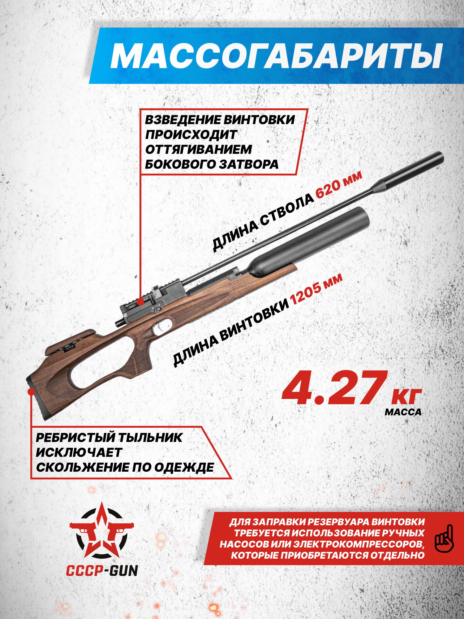 В этом варианте исполнения пневматика получила емкость в виде колбы, которая выделяется по сравнению с обычным резервуаром большей вместимостью - полезное пространство для закачки воздуха увеличилось до 500 кубических сантиметров, а работает винтовка по принципу прямой подачи газа. Наполнение указанного баллона производится с помощью специального оборудования ВД, такого, как ручной насос или электрический компрессор - подключение выполняется через штуцер, а контролировать процедуру дает возможность встроенный манометр стрелочного типа.