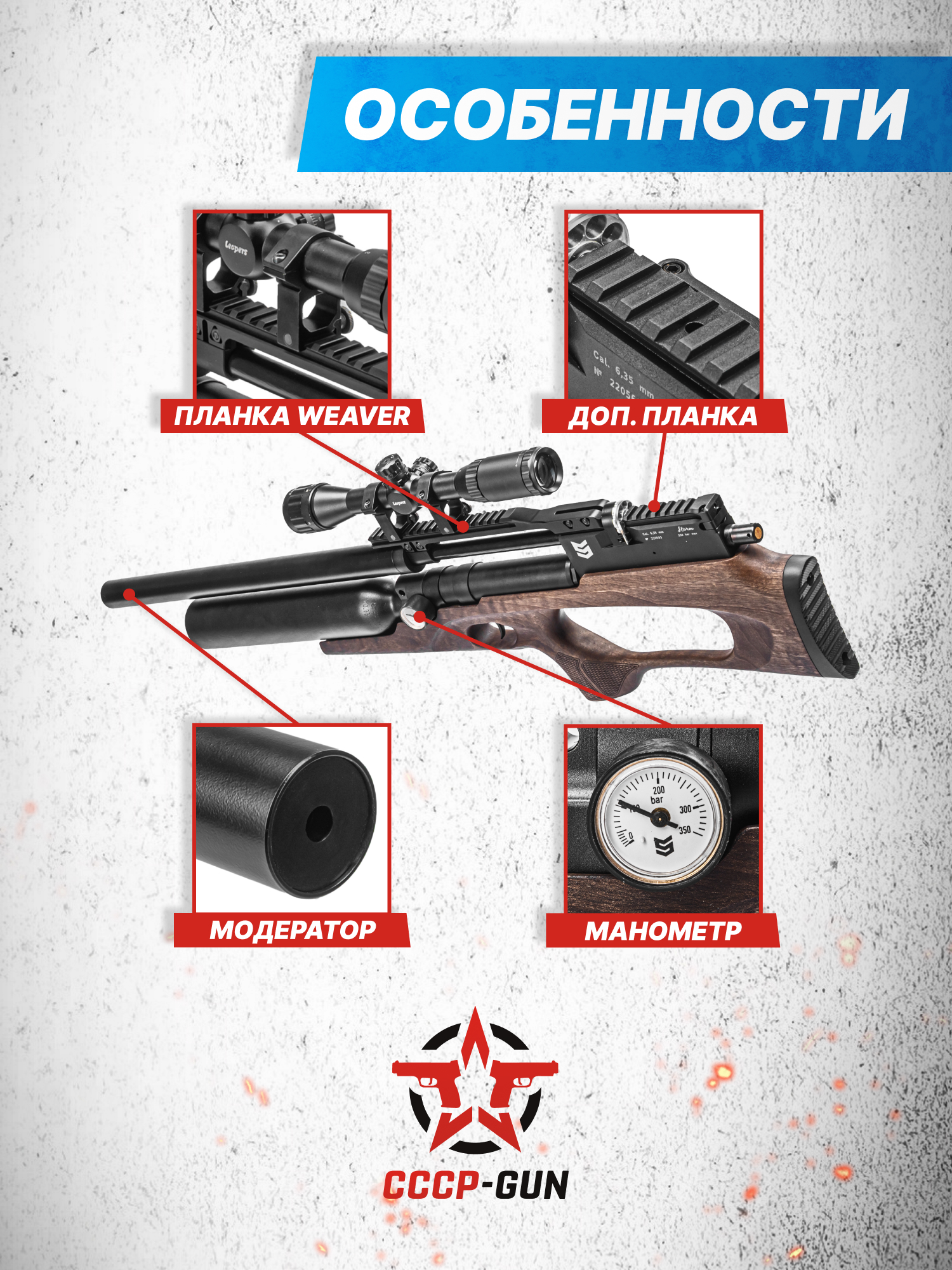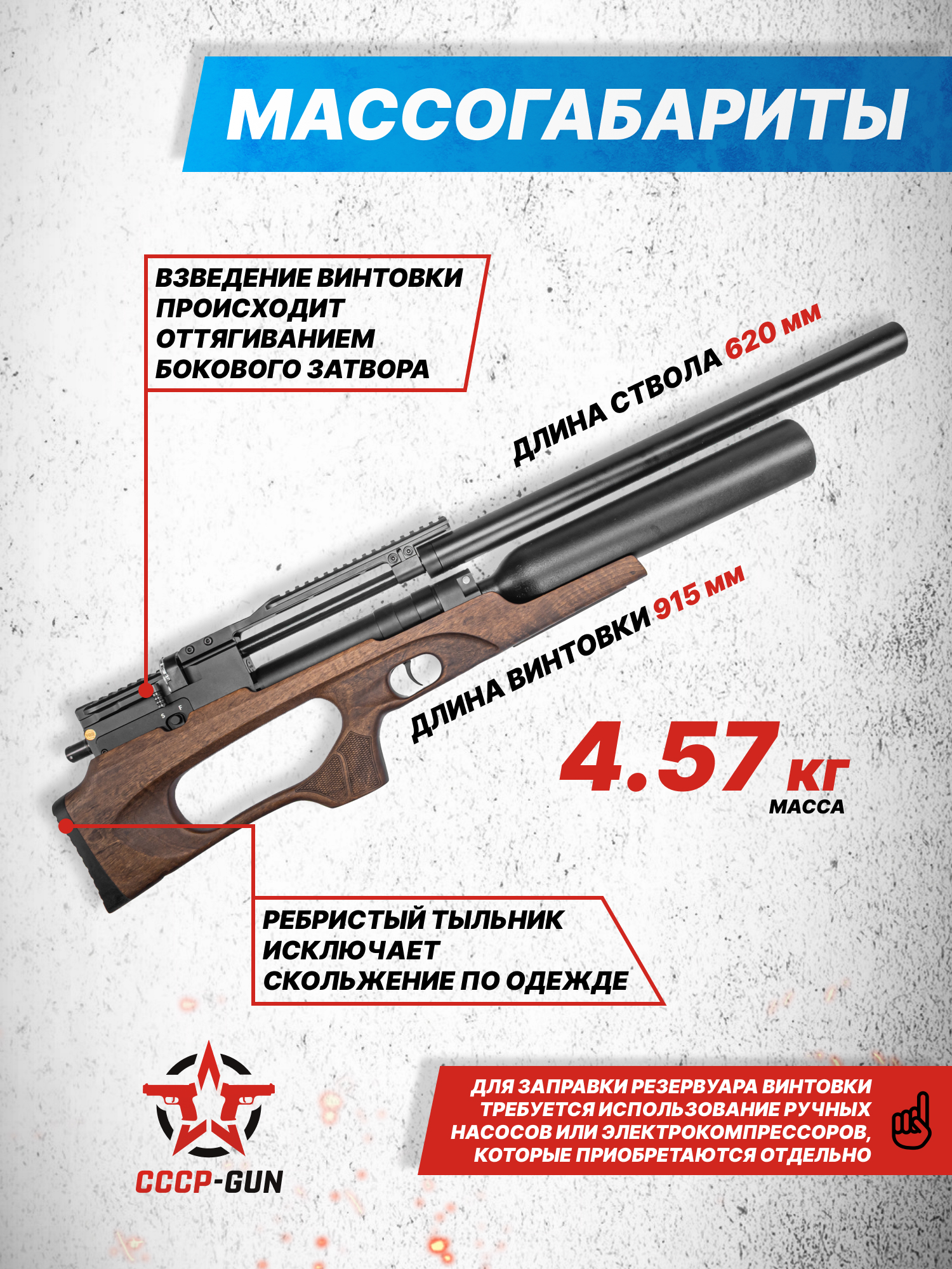 Винтовка Шторм пневматика PCP выполнена по компоновке Буллпап калибра 6.35 мм - она отличается меньшими габаритами в сравнении с традиционной конструкцией. При неизменной длине ствола полные внешние размеры экземпляра сократились до 915 мм, что ощутимо облегчило процесс перевозки и хранения оружия.