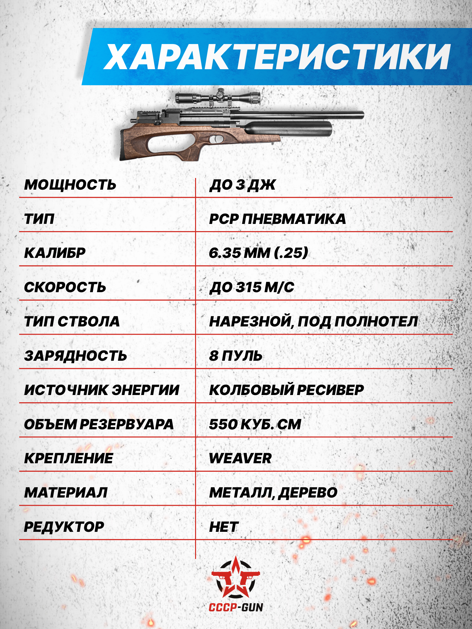 PCP винтовки калибра 6.35 представленной линейки выступают многозарядными, с ручным взведением - владельцу нужно будет каждый раз досылать пули из барабанного магазина с помощью соответствующего рычага. Также включен предохранитель для предотвращения непреднамеренного выстрела. Платформой для установки оптики и коллиматоров является планка Вивер 22 мм на отдельном мостике - база такого же типа присутствует также ближе к плечевому упору.