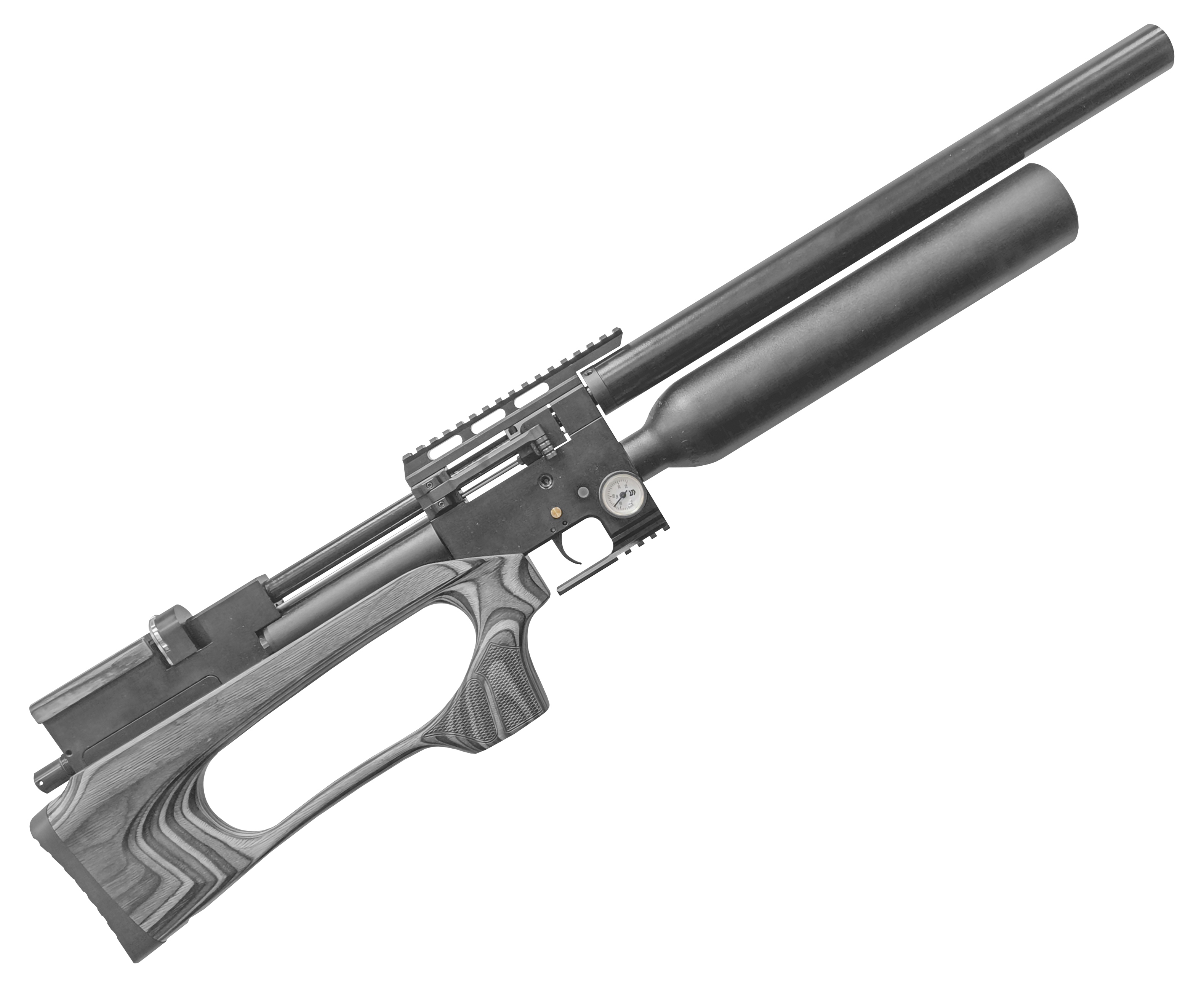 Также рядом разместился предохранитель с манометром - последний показывает текущий уровень наполненности 550 куб. см. резервуара. Колба работает на давлении до 300 Бар - поверочный показатель ощутимо больше рабочего, в соответствии с чем для ресивера характерно наличие запаса прочности на случай нештатных ситуаций.