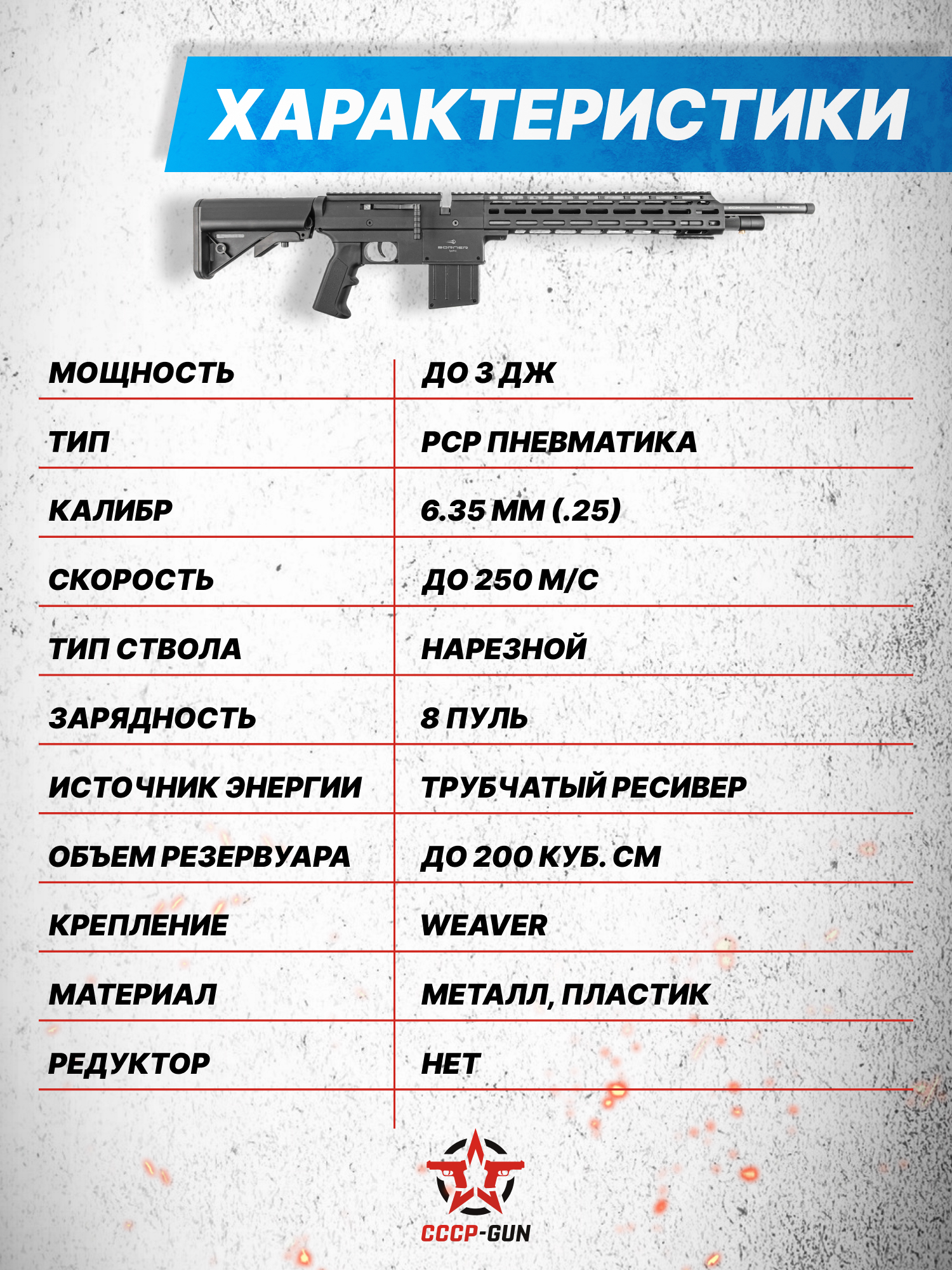 Прототипом для этой ПСП 6.35 мм послужила американская SR 25 винтовка, представляющая собой модификацию классической М4 под винтовочный патрон. Следовательно, помимо эффектного внешнего вида пневматика также интересна эргономикой - управлять ей становится легче и интереснее. При этом конструктивная часть здесь осталась стандартной - винтовка построена по схеме с подствольным ресивером.
