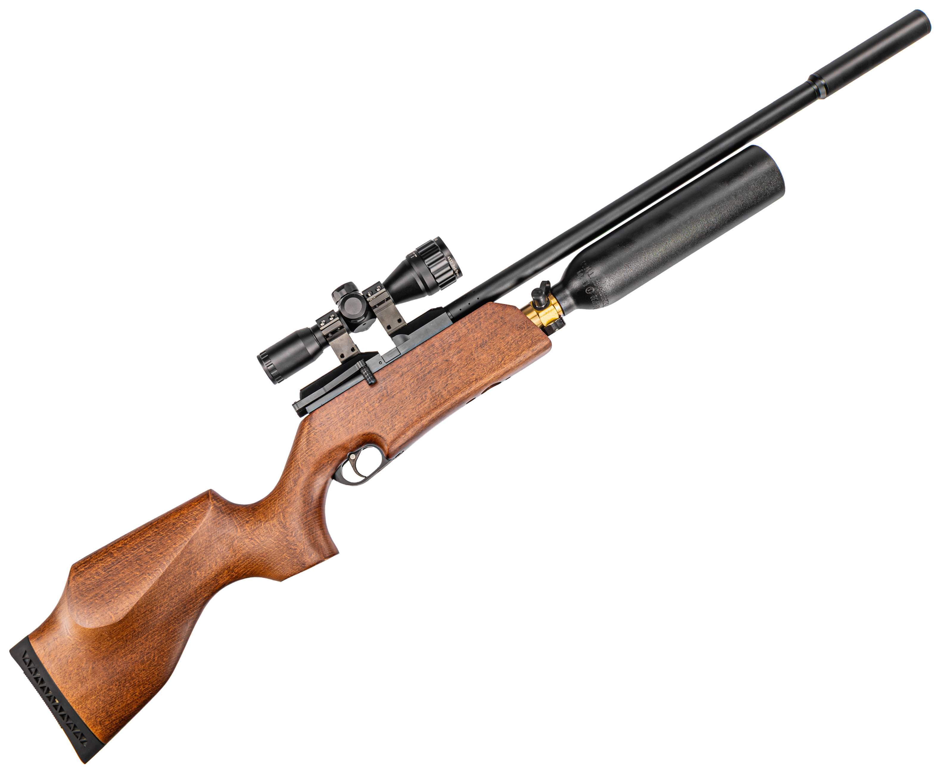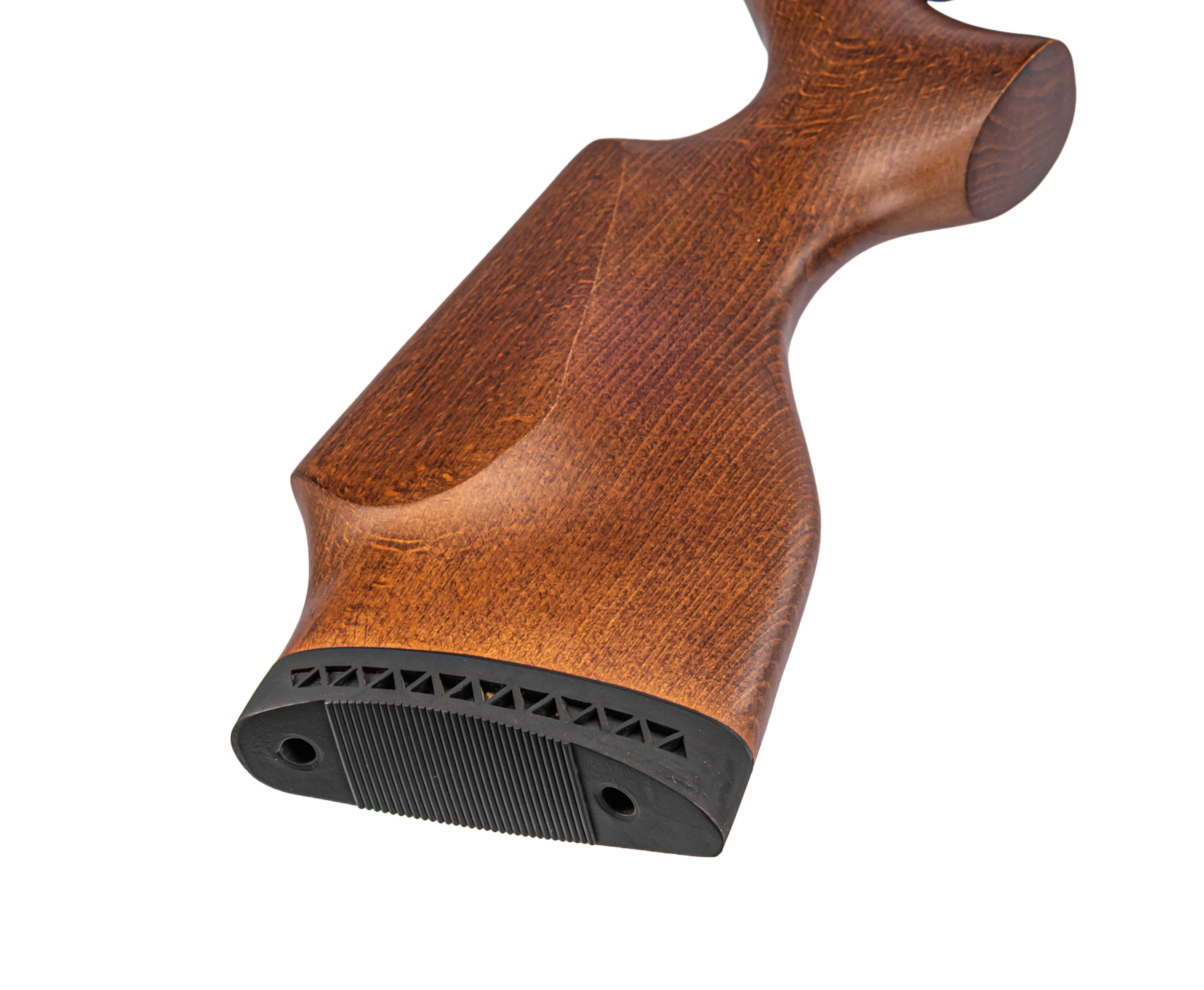 PCP пневматика 4.5 изготавливается из металла, если не брать в учет фурнитуру - для ее производства производитель использует бук и эластичный полимер, из которого выполняют затыльник приклада. Несмотря на внешнюю внушительность оружие получилось эргономичным - масса 3.62 килограмма делает воздушку сопоставимой по комфорту с моделями, которые комплектуют линейным резервуаром. Вместо стандартных прицельных изделие дополнили планкой «Ласточкин хвост» 11 мм под оптику, более востребованную в PCP образцах.