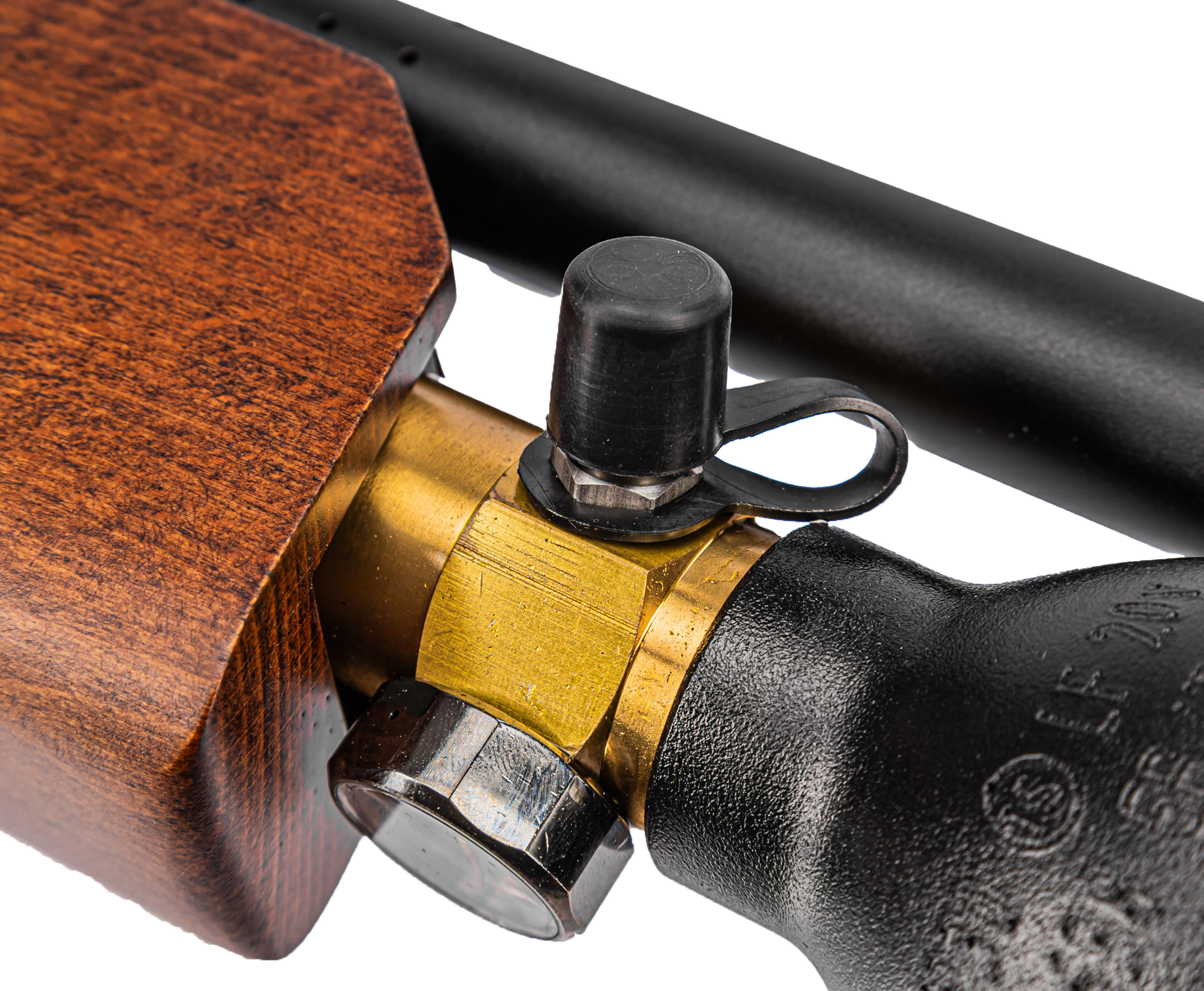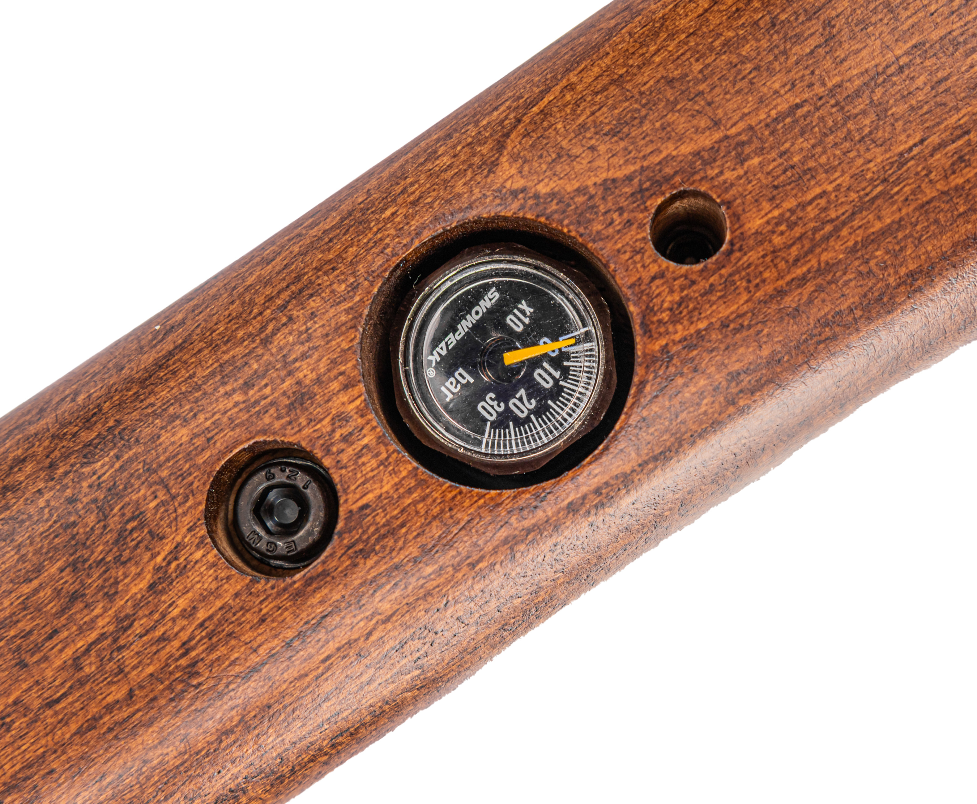 Пневматика с баллоном высокого давления способна работать в условиях, когда верхнее значение давления равно показателю 250 Bar - причем фактический показатель устойчивости на разрыв кратно выше указанного, соответственно изделие безопасно при соблюдении этого параметра. Следить за нормой давления предполагается с помощью манометра стрелочного типа, разместившегося на соединительном со ствольной коробкой узле - под ним же штатно расположили порт для соединения с заправочным шлангом.