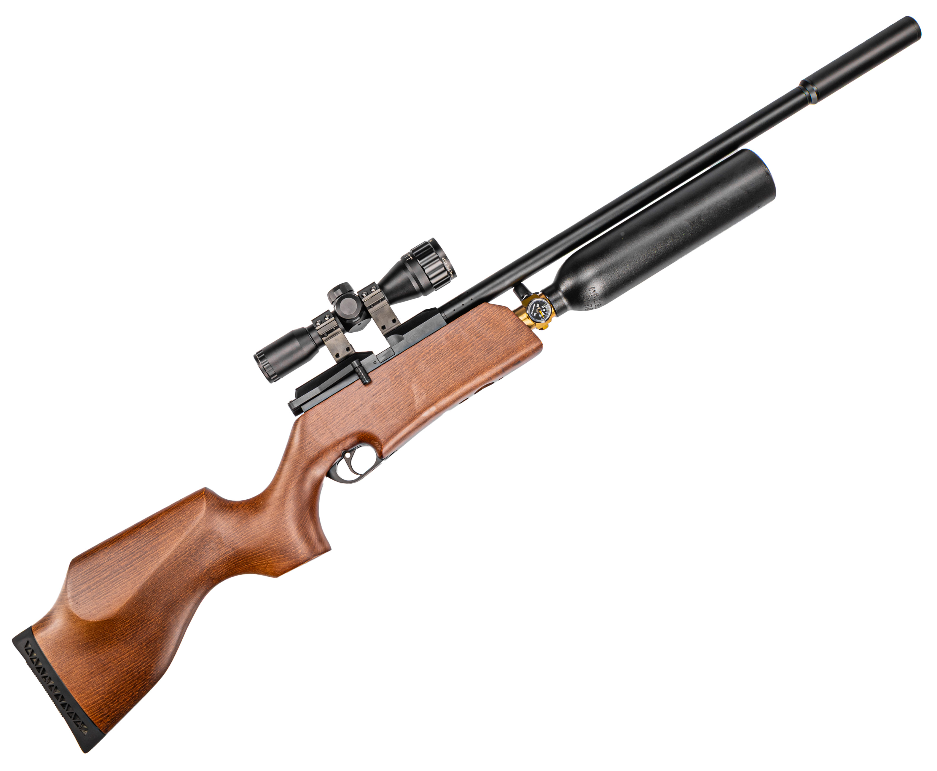Потенциал разгона пневматики может упираться не только в конструктивные возможности клапана и проходных размеров - помимо этого винтовка должна обладать достаточным запасом воздуха. В противном случае даже при развитых характеристиках удобство эксплуатации такого оружия может свестись к минимуму из-за быстрого окончания газа в баллоне. Исправить это помогает замена линейного резервуара на более объемную колбу.