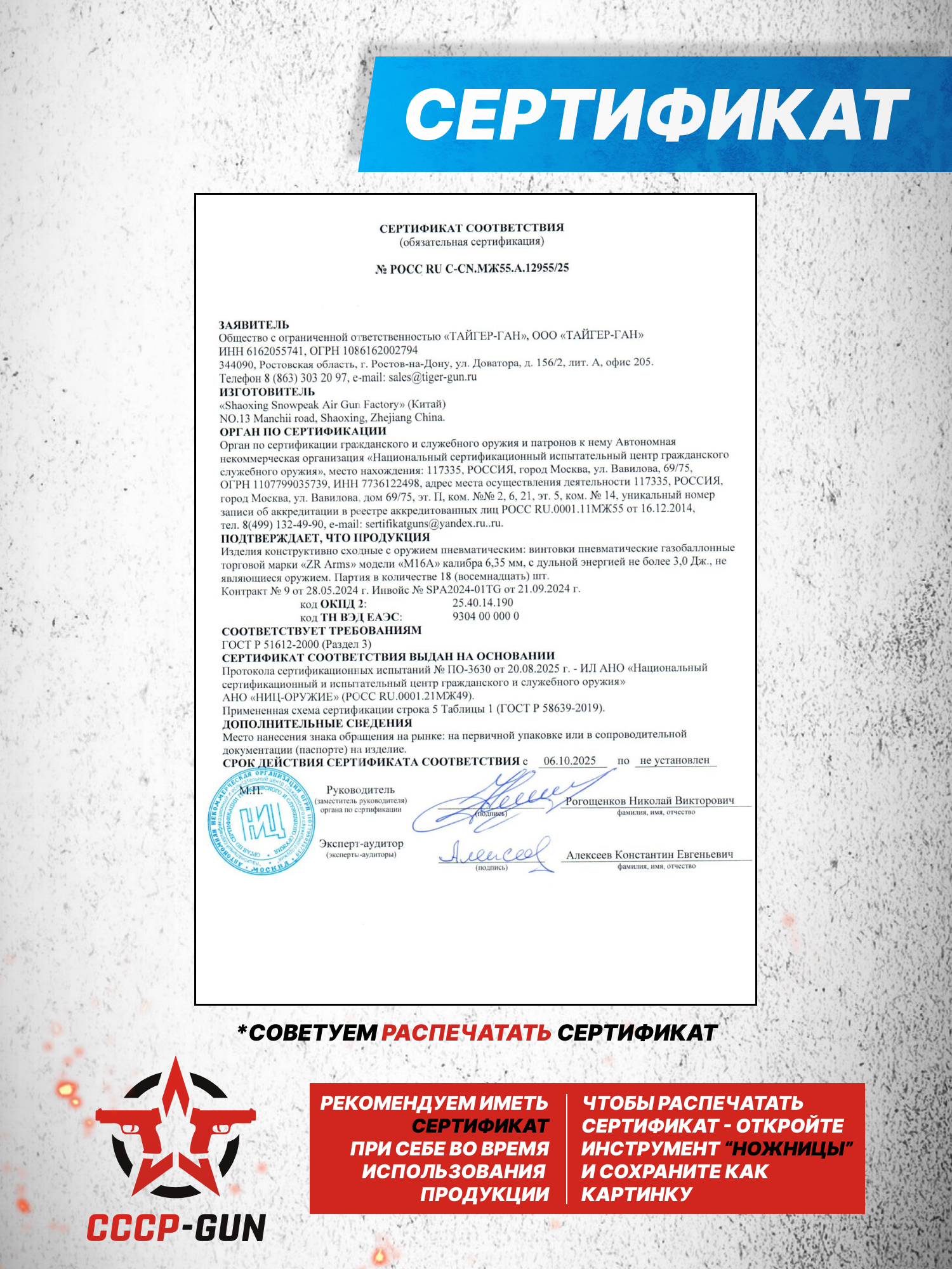Внимание! Данная модель поставляется в разрешенной мощности для свободного приобретения на территории Российской Федерации. При этом в модели имеется возможность увеличения мощности путем замены части деталей или настройки конструкции, однако не стоит забывать о Федеральном законе «Об оружии» № 150 - ФЗ. В случае необходимости, опираясь на данный закон и руководствуясь им, возможно, потребуется получить разрешение от ЛЛР ГУ МВД России после вмешательства в конструкцию.