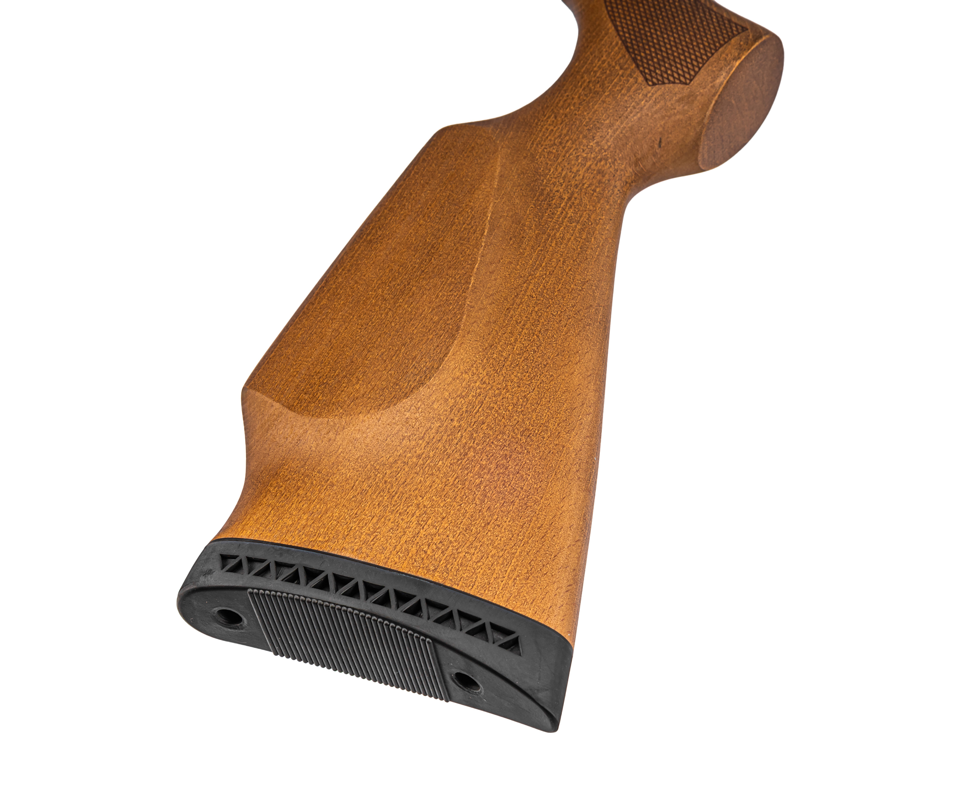 Кроме того, экземпляр оборудован ложей, изготовленной из буковой древесины - масса изделия на этом фоне составила 3.55 килограмма. В области рукояти присутствует текстура от скольжения ладони пользователя, а тыльник при этом прорезинен для предотвращения проскальзывания по поверхности верхней одежды.