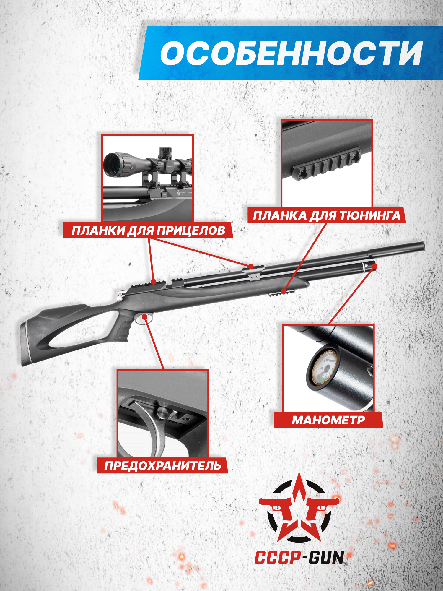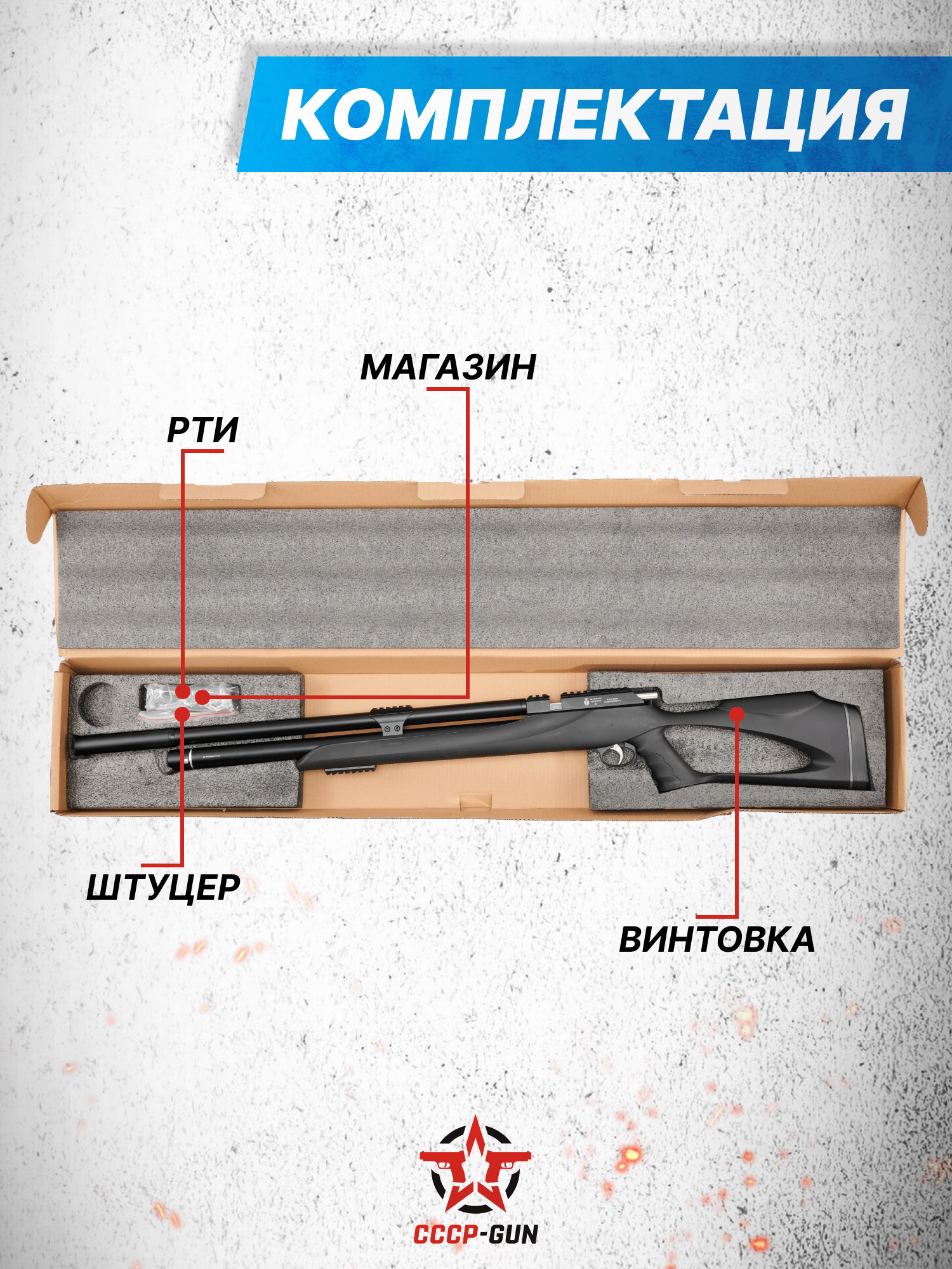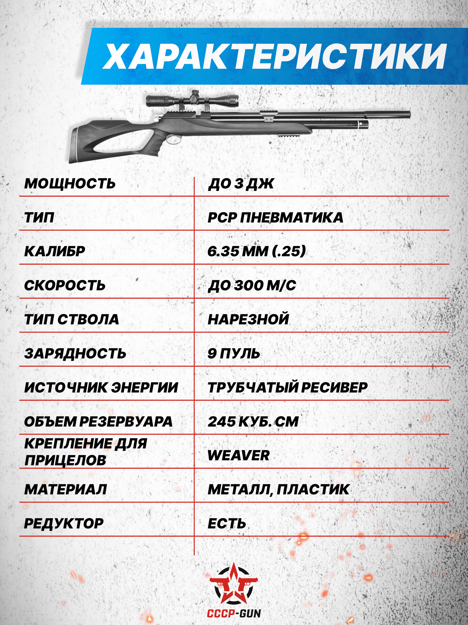 Внимание! Данная модель поставляется в разрешенной мощности для свободного приобретения на территории Российской Федерации. При этом в модели имеется возможность увеличения мощности путем замены части деталей или настройки конструкции, однако не стоит забывать о Федеральном законе «Об оружии» № 150 - ФЗ. В случае необходимости, опираясь на данный закон и руководствуясь им, возможно, потребуется получить разрешение от ЛЛР ГУ МВД России после вмешательства в конструкцию.
