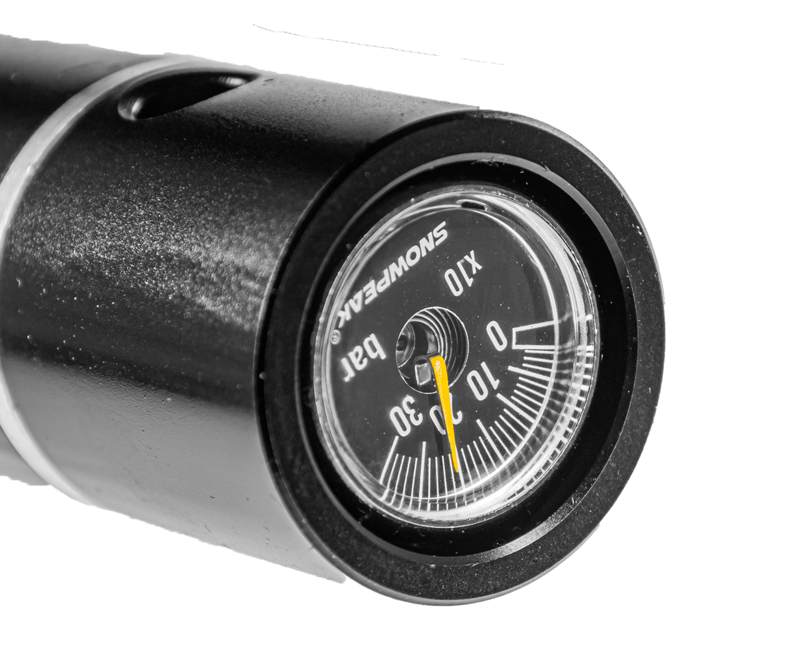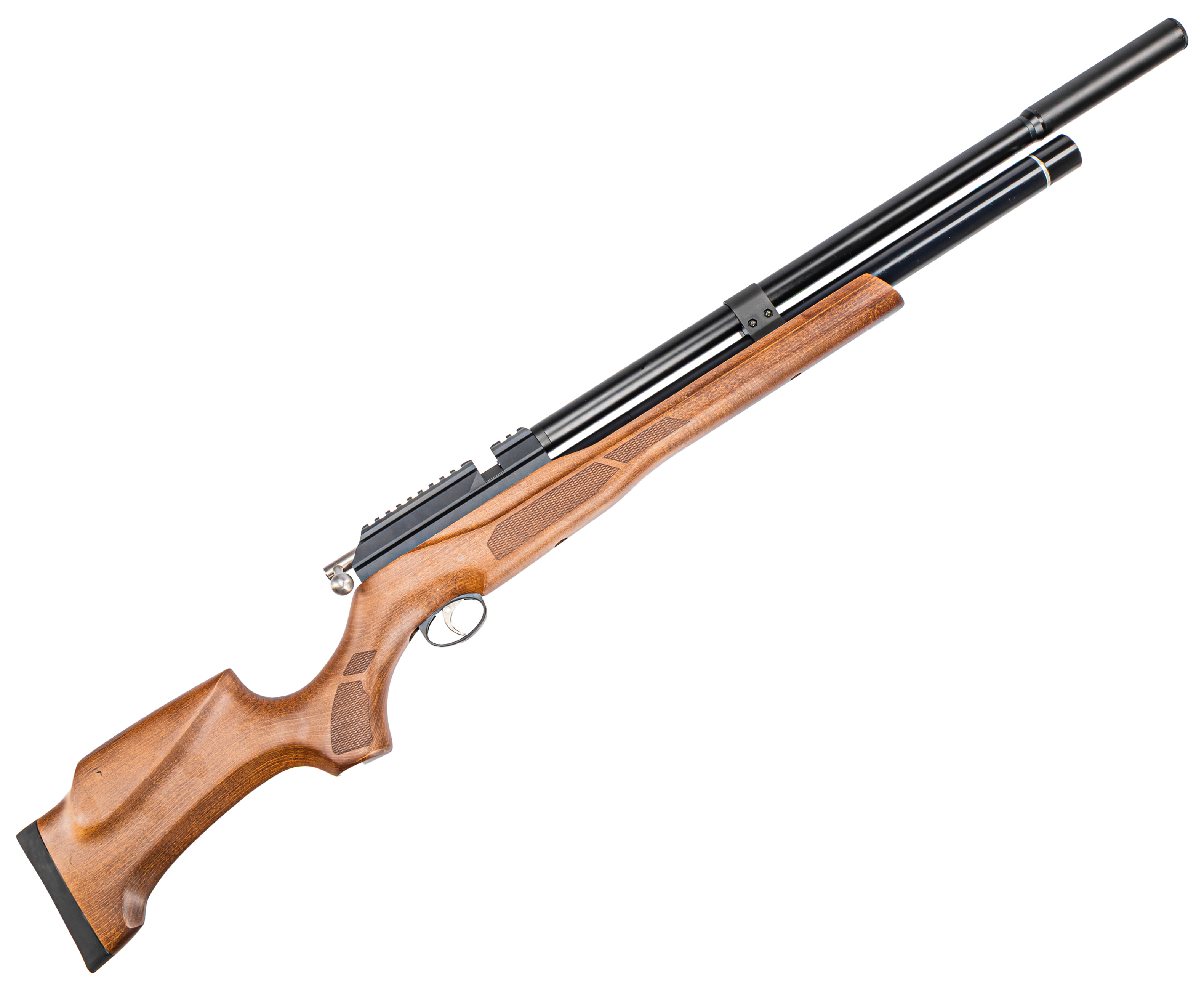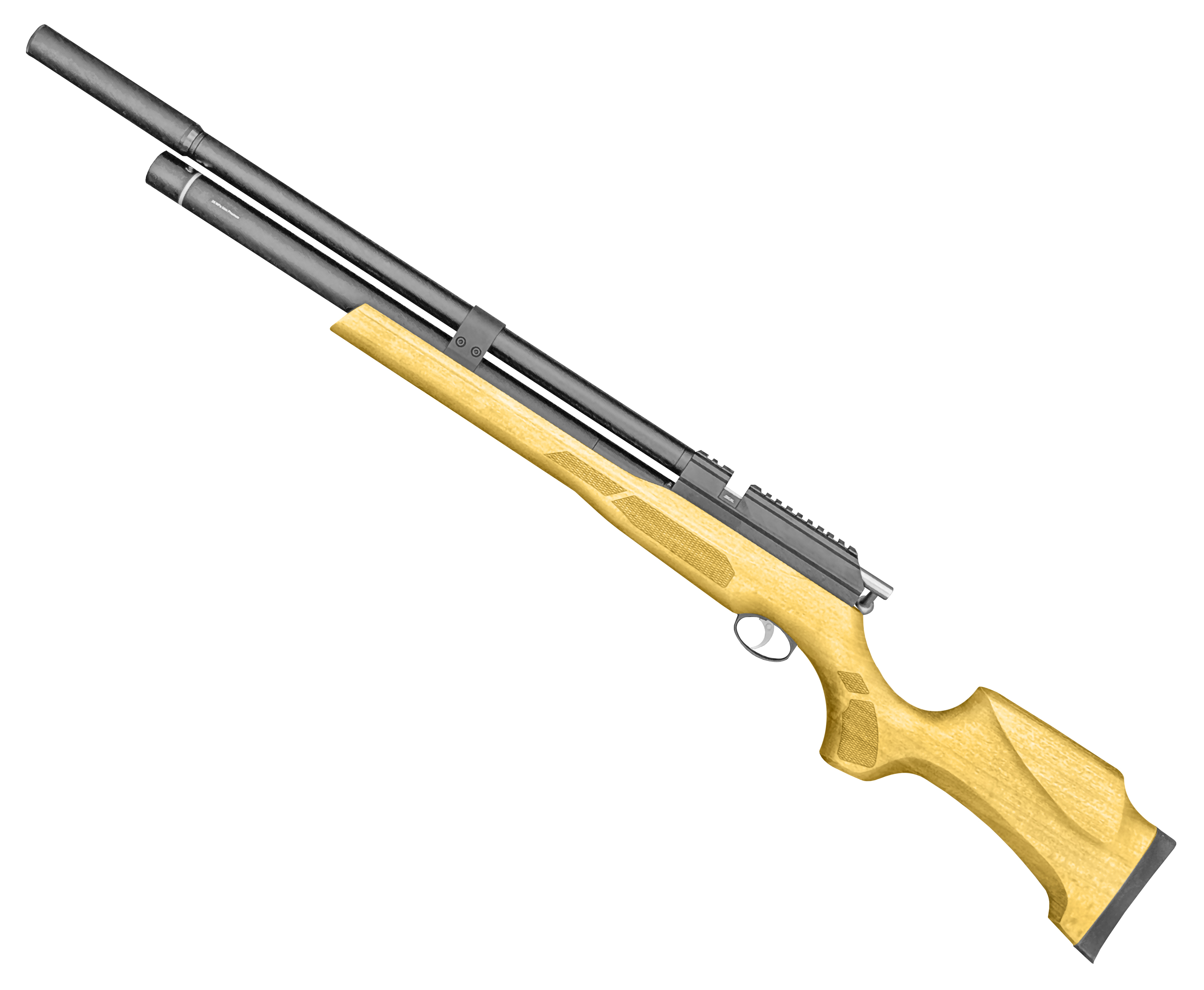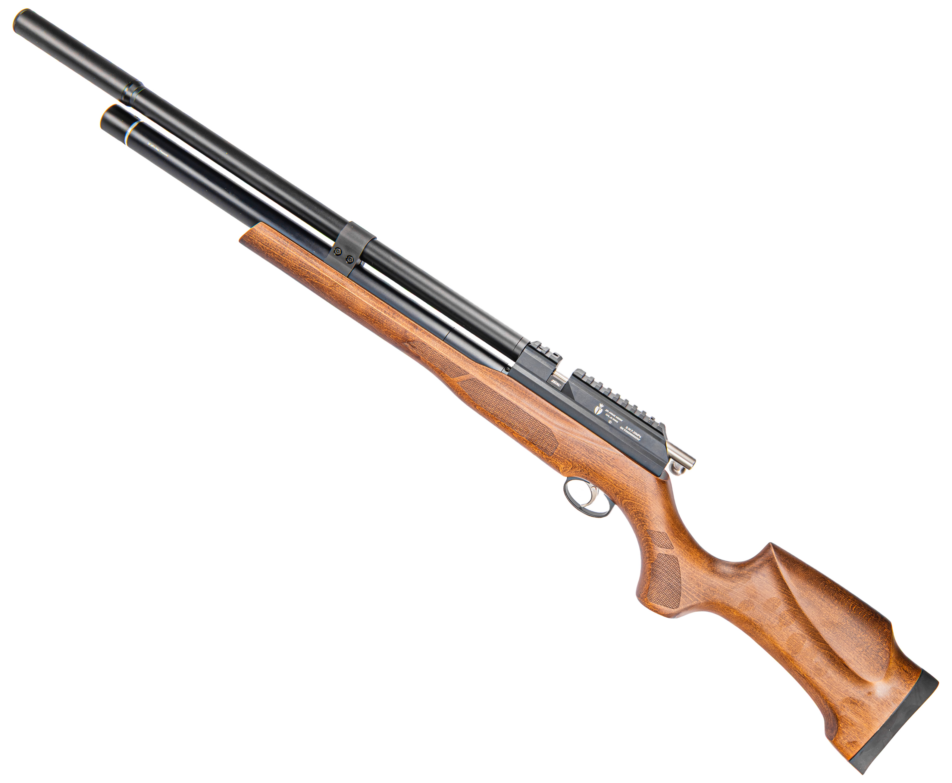 В торцевой части баллона разместили стрелочный указатель - прибор поможет осуществлять оперативный контроль степени наполненности ресивера. В механизме также имеется редуктор. Монтаж этого элемента позволил экономично расходовать воздух - с ним винтовка способна работать при больших показателях давления, чем в прямоточном режиме.
