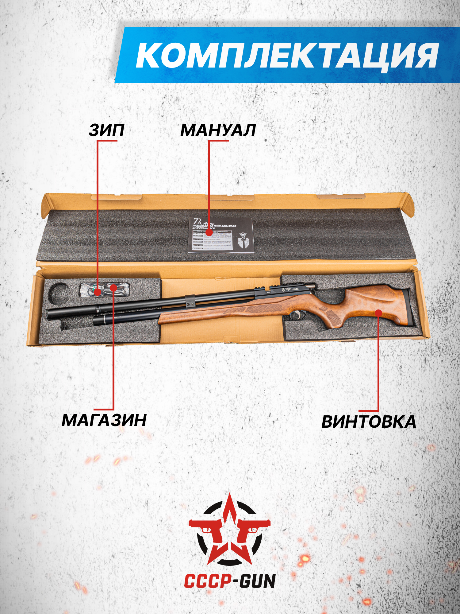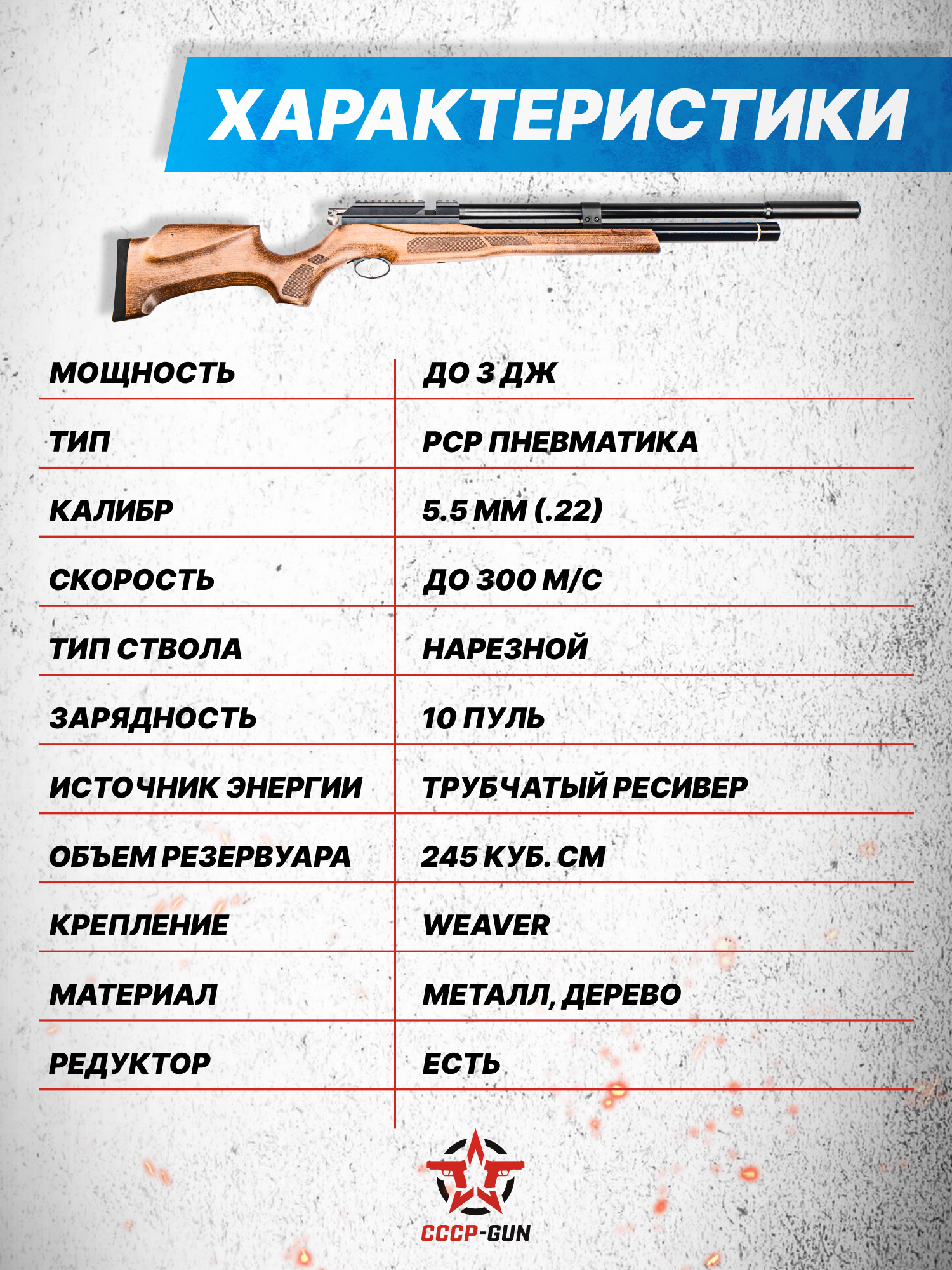 Внимание! Данная модель поставляется в разрешенной мощности для свободного приобретения на территории Российской Федерации. При этом в модели имеется возможность увеличения мощности путем замены части деталей или настройки конструкции, однако не стоит забывать о Федеральном законе «Об оружии» № 150 - ФЗ. В случае необходимости, опираясь на данный закон и руководствуясь им, возможно, потребуется получить разрешение от ЛЛР ГУ МВД России после вмешательства в конструкцию.