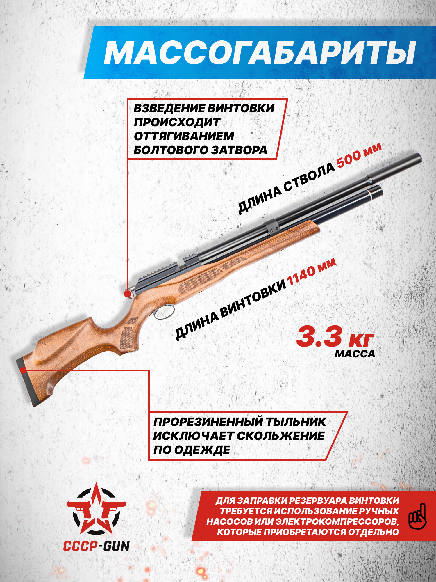 Производитель использовал в качестве материала для фурнитуры на пневматические винтовки дерево - в частности задействовали бук, что сделало ложу прочнее и эстетичнее. Габарит винтовки 1140 мм, а масса 3300 килограмма, что немного для пневматики такого уровня.