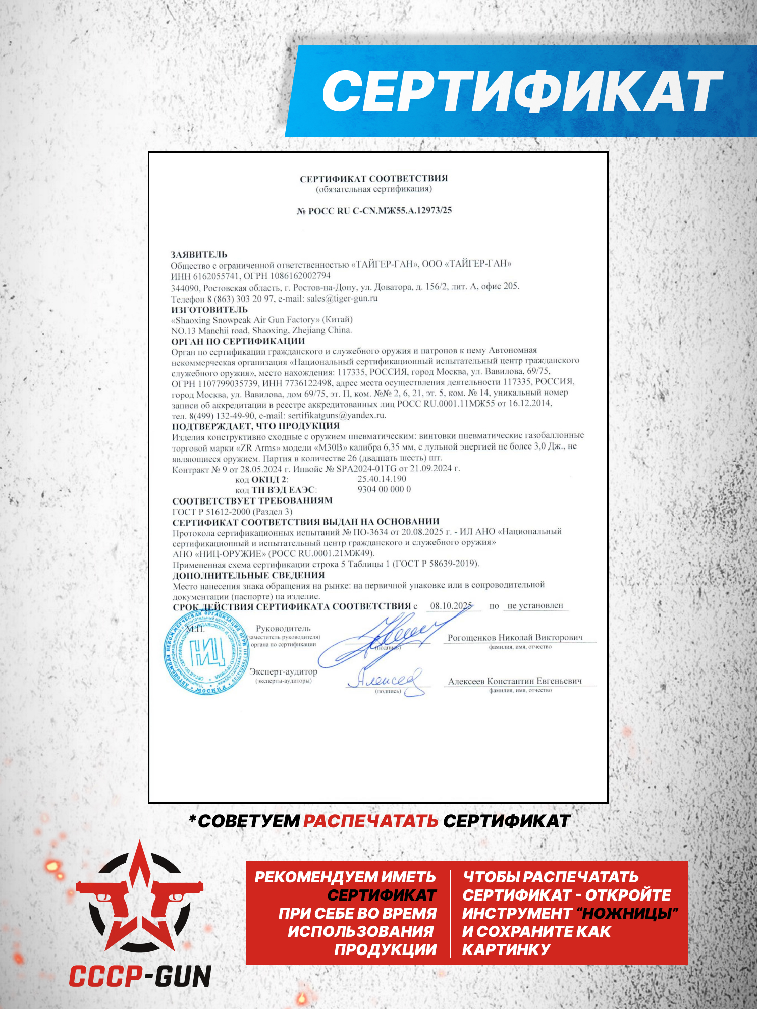 Внимание! Данная модель поставляется в разрешенной мощности для свободного приобретения на территории Российской Федерации. При этом в модели имеется возможность увеличения мощности путем замены части деталей или настройки конструкции, однако не стоит забывать о Федеральном законе «Об оружии» № 150 - ФЗ. В случае необходимости, опираясь на данный закон и руководствуясь им, возможно, потребуется получить разрешение от ЛЛР ГУ МВД России после вмешательства в конструкцию.