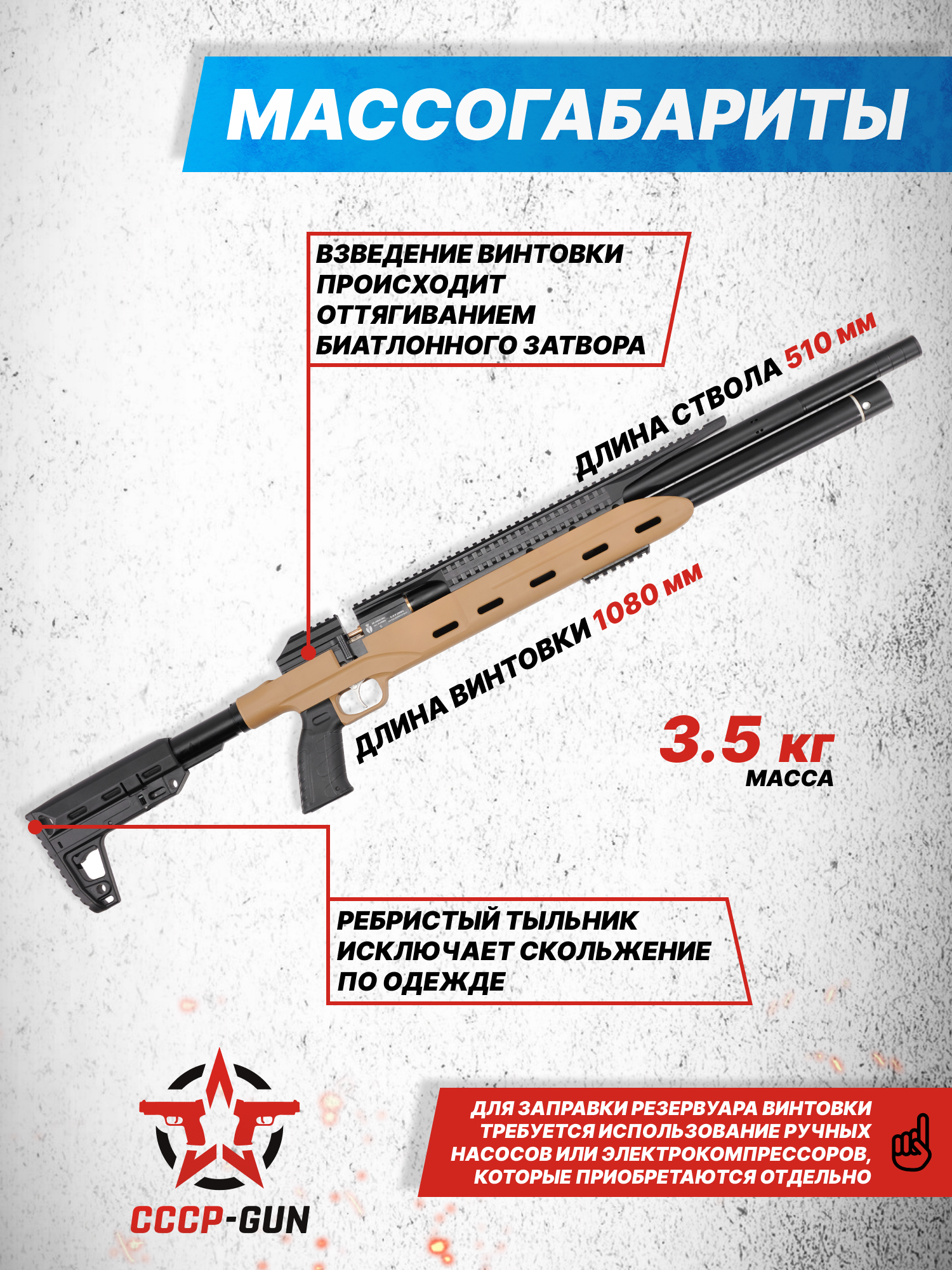 В обозреваемой PCP модели реализована полимерная ложа классического форм-фактора в вариации цвета Tan. Масса оружия при этом составляет всего три с половиной килограмма, а длина 1080 миллиметров, делая винтовку небольшим и легким образцом, что играет положительную роль в хранении и переноске. Для комфортной работы с пневматикой конструкторы предусмотрели пистолетную рукоять, ухватистое цевье и телескопический приклад с противоскользящим затыльником.