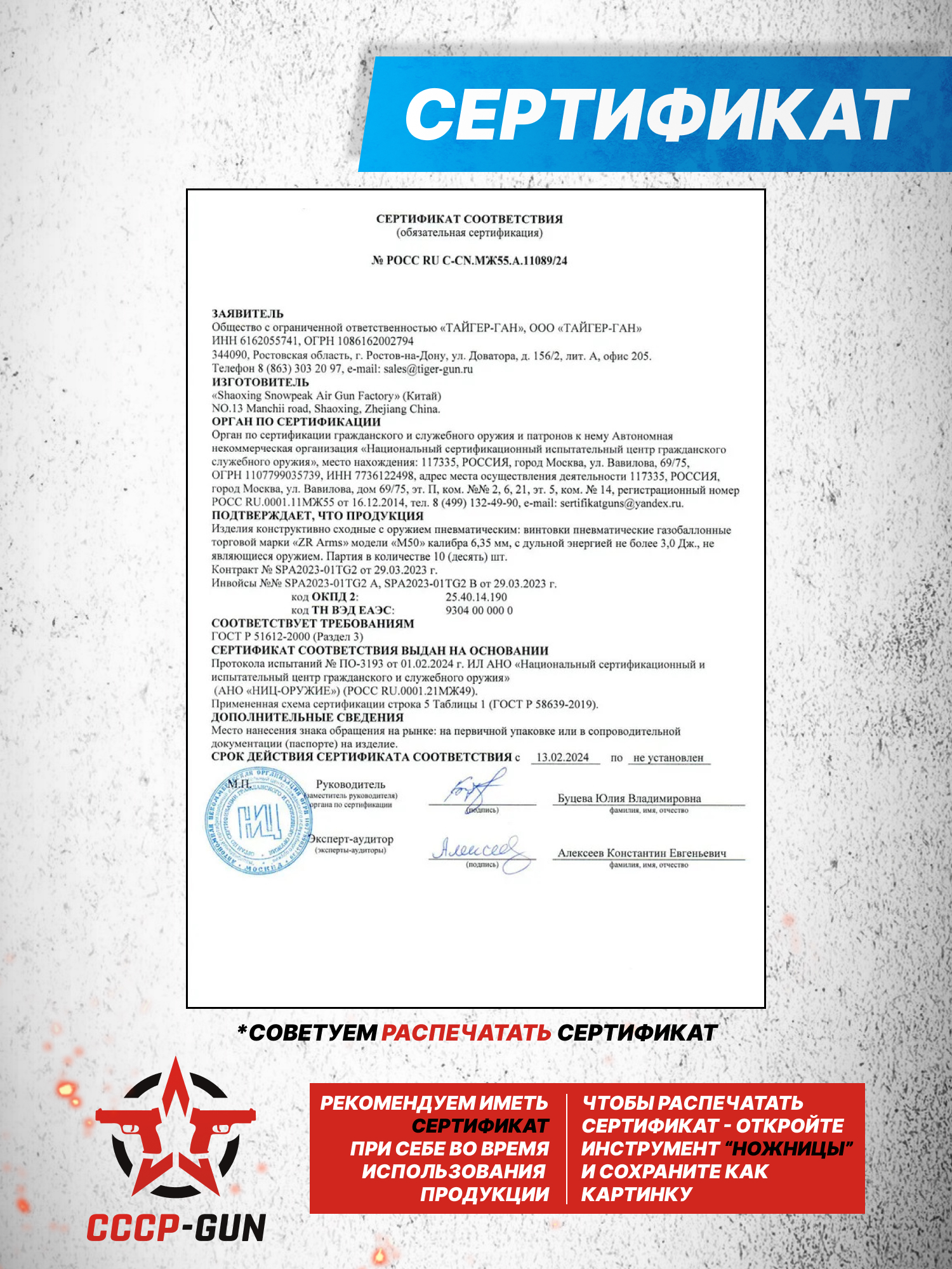 Винтовка ZR Arms M50 6.35 поставляется в Россию с дульной энергией до 3 Дж, поэтому относится к категории КСОИ и не требует от покупателя оформления оружейной лицензии. После усиления модель возвращается к заводским параметрам и будет демонстрировать показатель скорости полета пули, приравненный к 280 метрам в секунду. Стоит отметить, что в целях повышения безопасности пользователя, производитель дополнил спусковой крючок изделия двухпозиционным предохранителем.