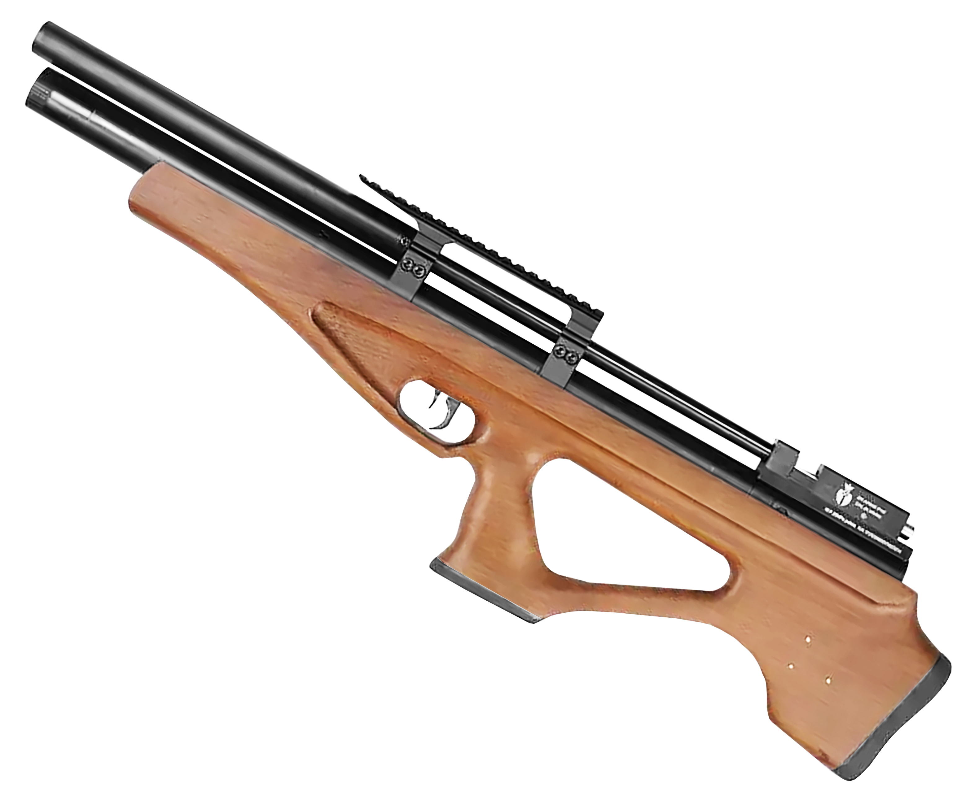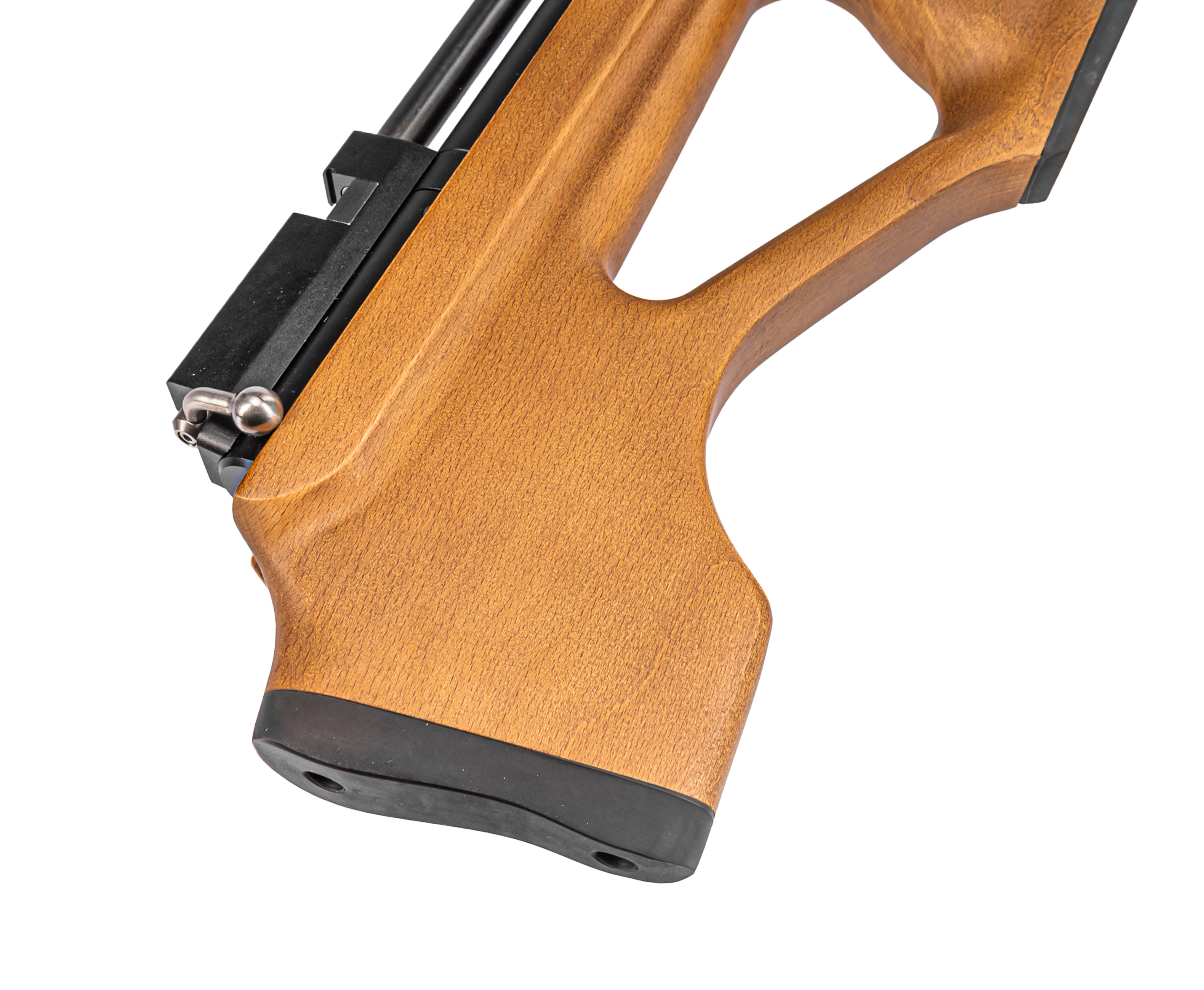 Рассматриваемая пневматическая винтовка выполнена в схеме Буллпап, соответственно она обладает уменьшенными размерами - длина модели составляет 740 мм, благодаря чему экземпляр порадует будущего пользователя легкостью при перевозке. Одновременно с этим такое инженерное решение дало возможность оставить неизменным размер ствольного блока.
