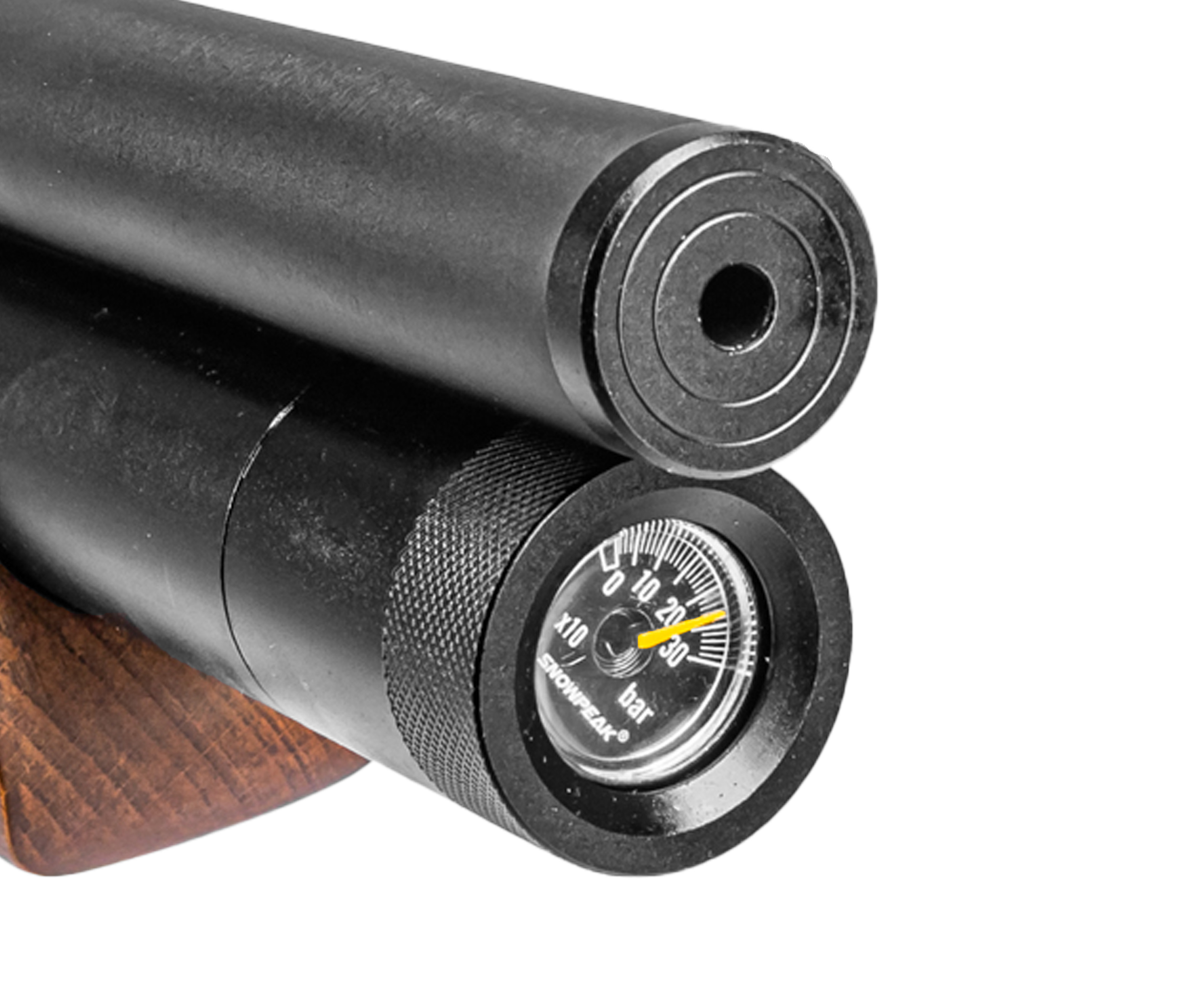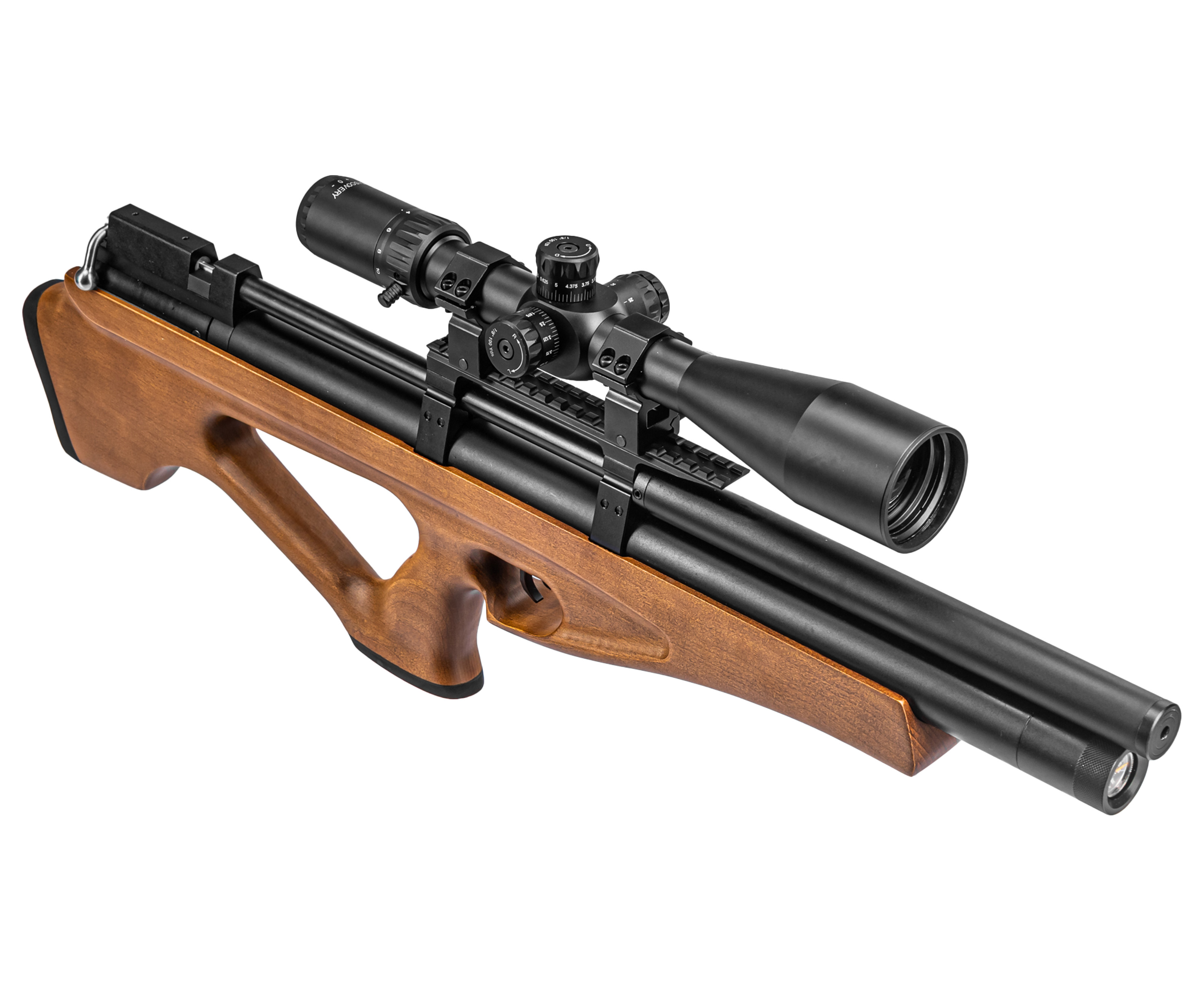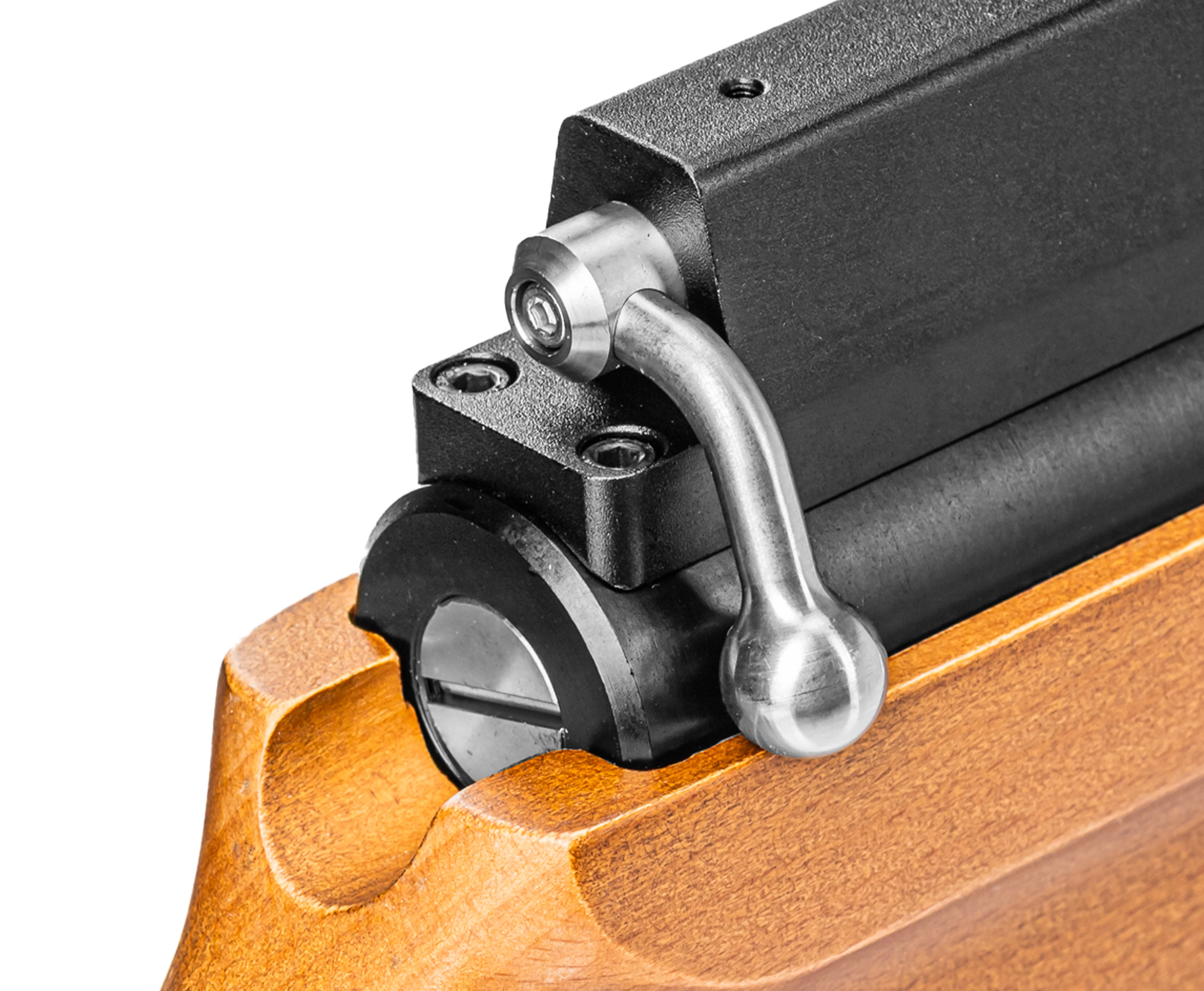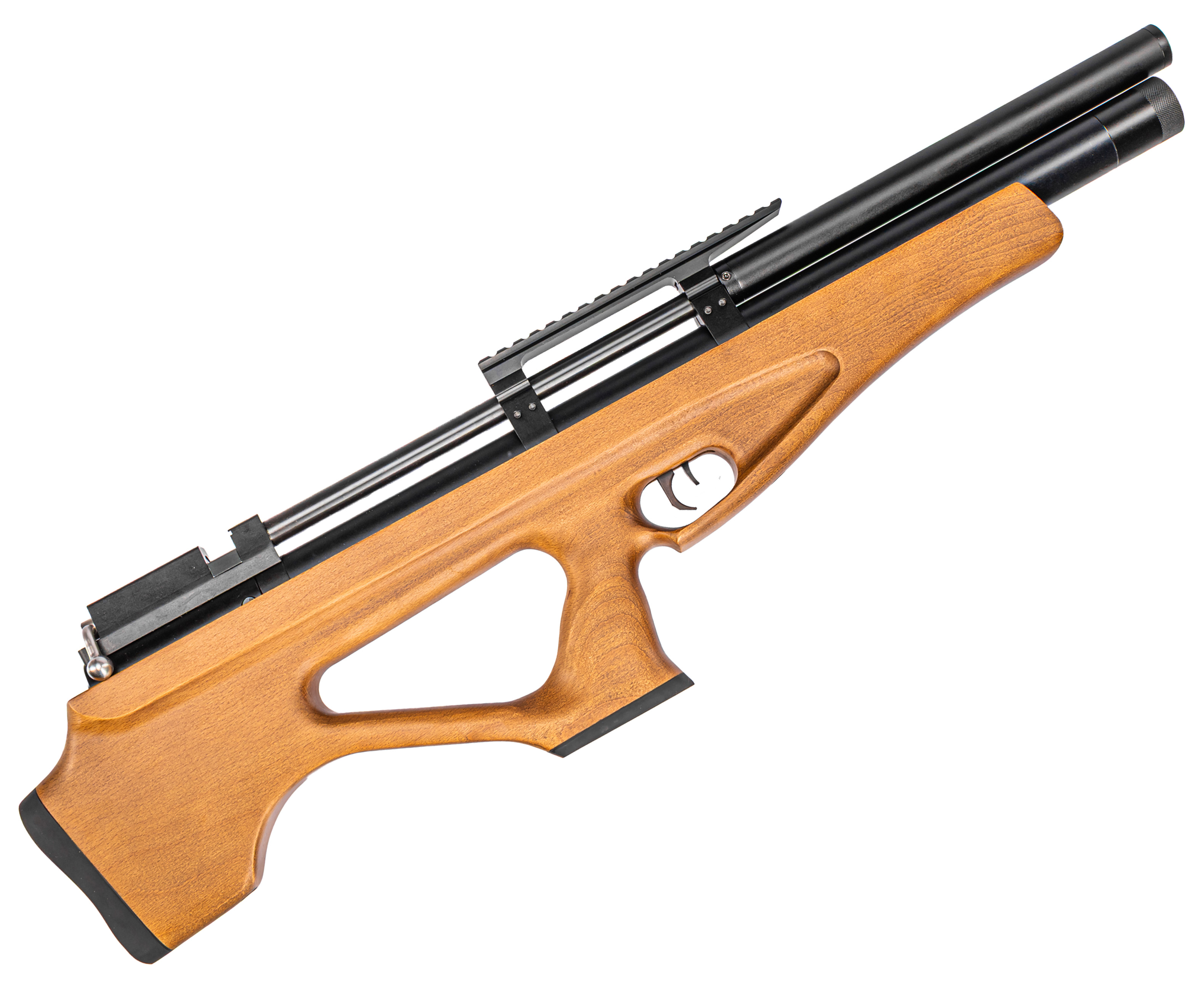 Поскольку пневматическая винтовка PCP 4 5 принадлежит к категории экземпляров с предварительной накачкой, для работы потребуется заполнить сжатым воздухом встроенный ресивер. Штатный резервуар трубчатого форм-фактора предполагает объем 350 куб см. Такая вместимость дает возможность выполнить большее число выстрелов без необходимости повторной заправки.