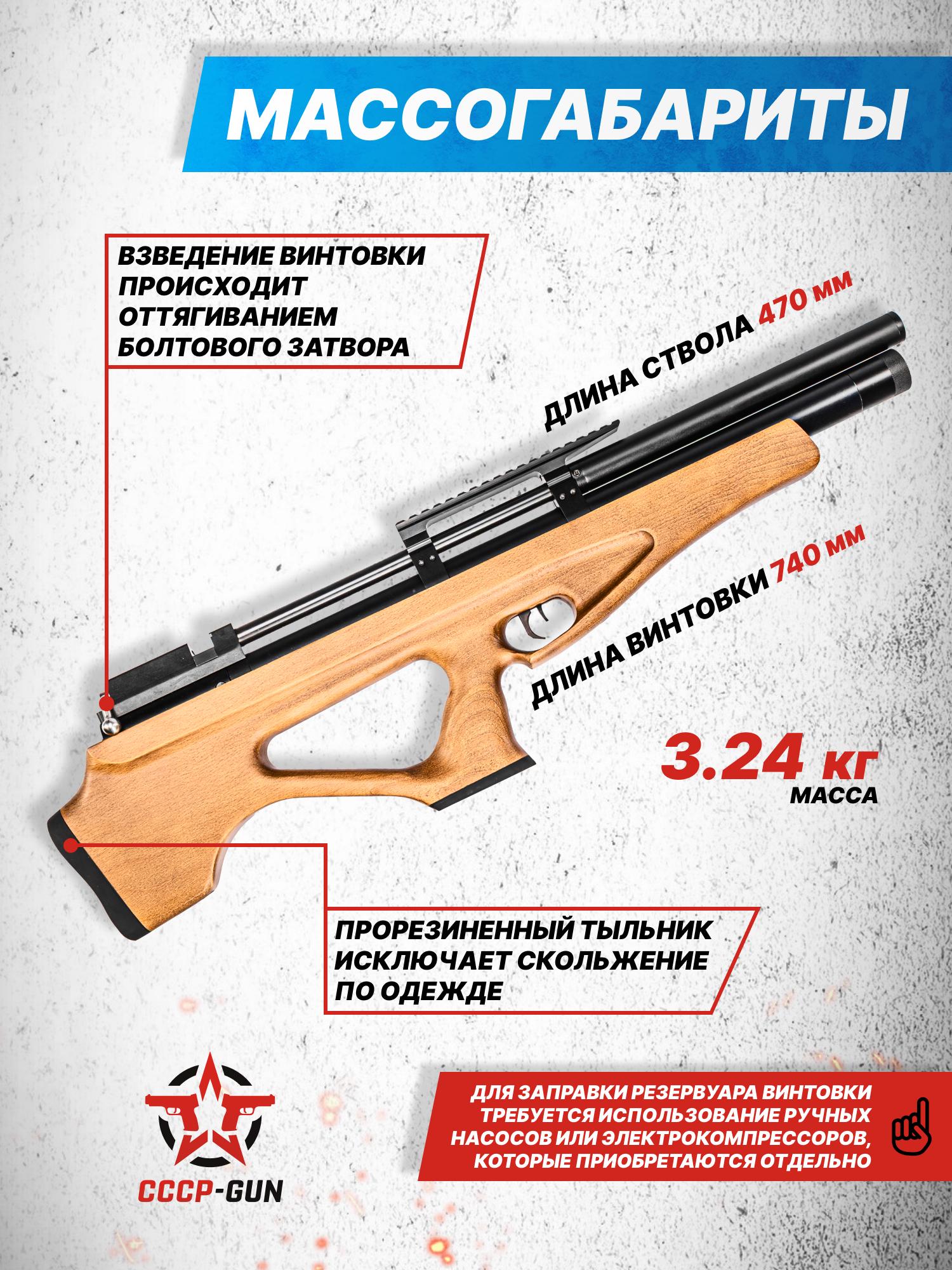 Внимание! Данная модель поставляется в разрешенной мощности для свободного приобретения на территории Российской Федерации. При этом в модели имеется возможность увеличения мощности путем замены части деталей или настройки конструкции, однако не стоит забывать о Федеральном законе «Об оружии» № 150 - ФЗ. В случае необходимости, опираясь на данный закон и руководствуясь им, возможно, потребуется получить разрешение от ЛЛР ГУ МВД России после вмешательства в конструкцию.