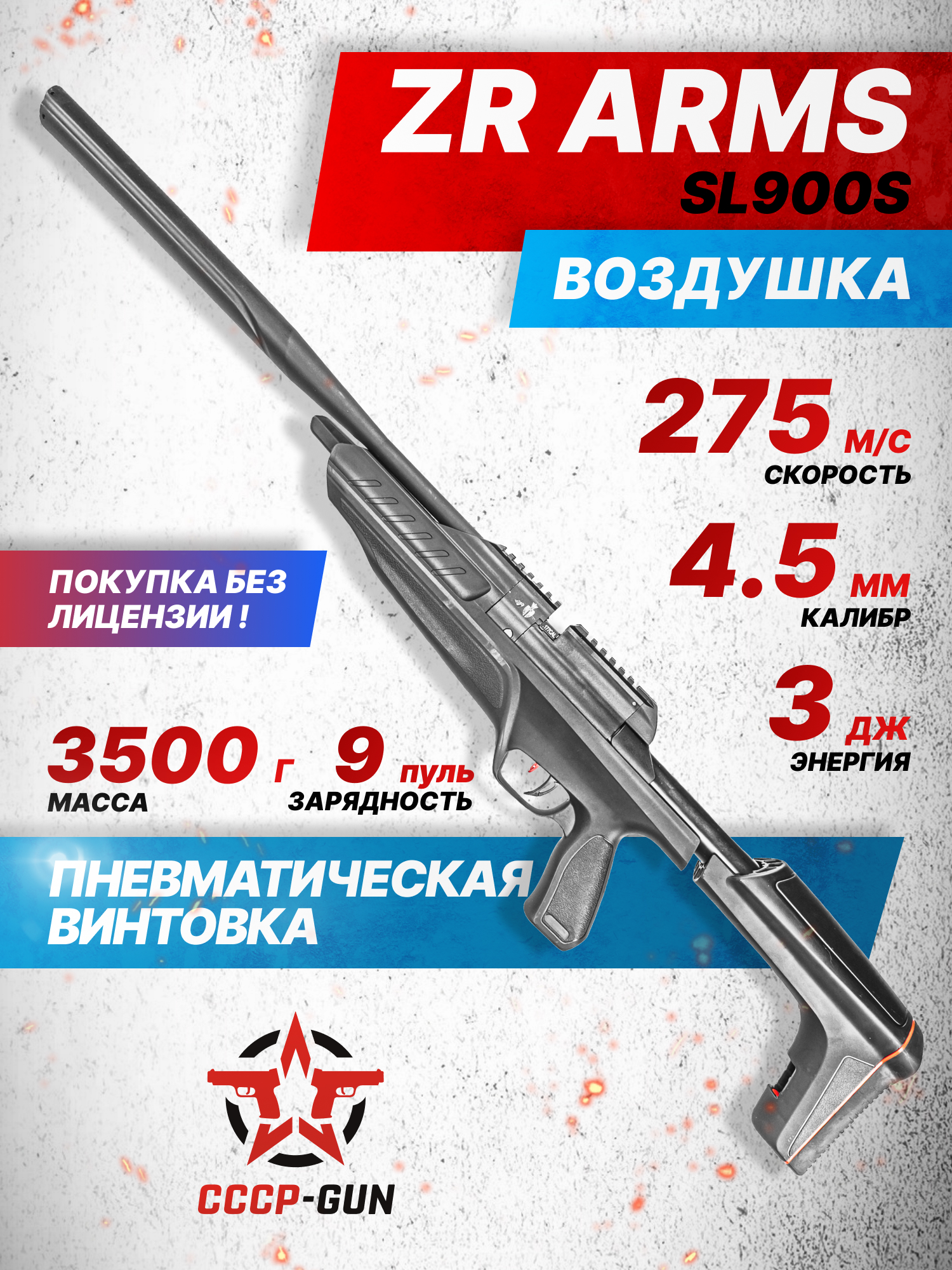 Это изделие в плане последних перестала быть учебным оружием со скромной мощностью - винтовка от ЗР Армс получила конструктивную возможность придания пуле ускорения до 275 м/с. При этом указывается, что в пневматике для использования в России присутствует ограничение, не позволяющее ей выйти за установленный в законодательстве предел дульной энергии, составляющий 3J. Следовательно, эта модель доступна к владению без оформления.