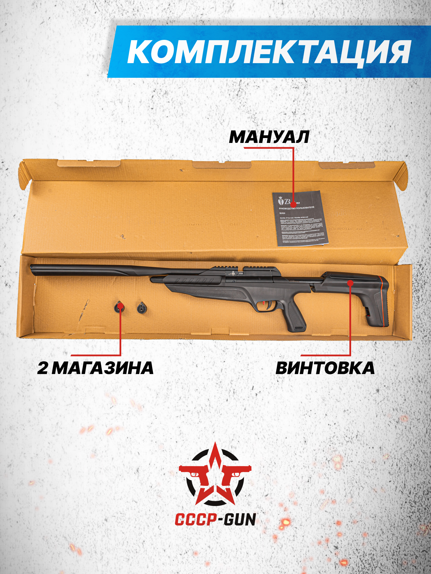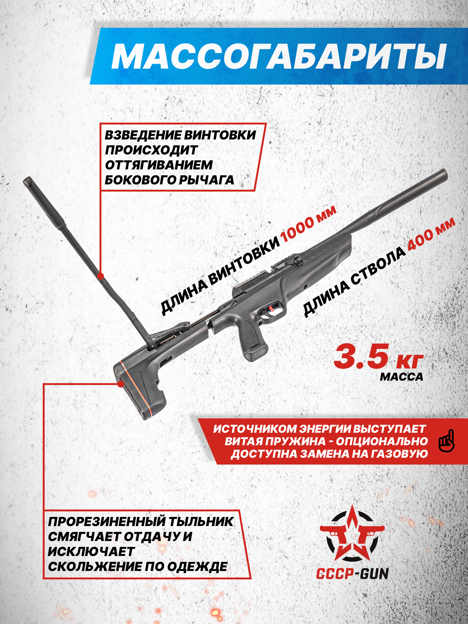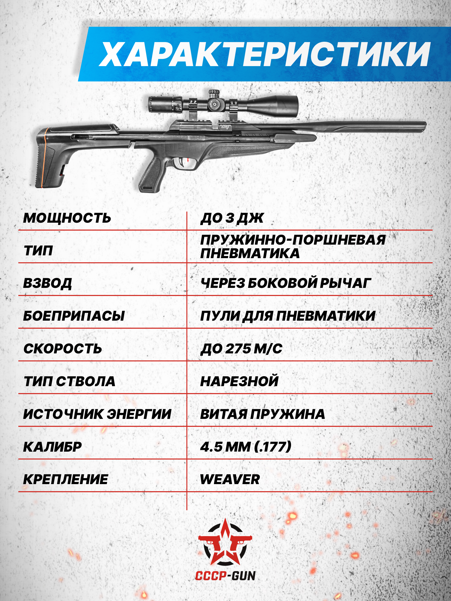 Внимание! Данная модель поставляется в разрешенной мощности для свободного приобретения на территории Российской Федерации. При этом в модели имеется возможность увеличения мощности путем замены части деталей или настройки конструкции, однако не стоит забывать о Федеральном законе «Об оружии» № 150 - ФЗ. В случае необходимости, опираясь на данный закон и руководствуясь им, возможно, потребуется получить разрешение от ЛЛР ГУ МВД России после вмешательства в конструкцию.