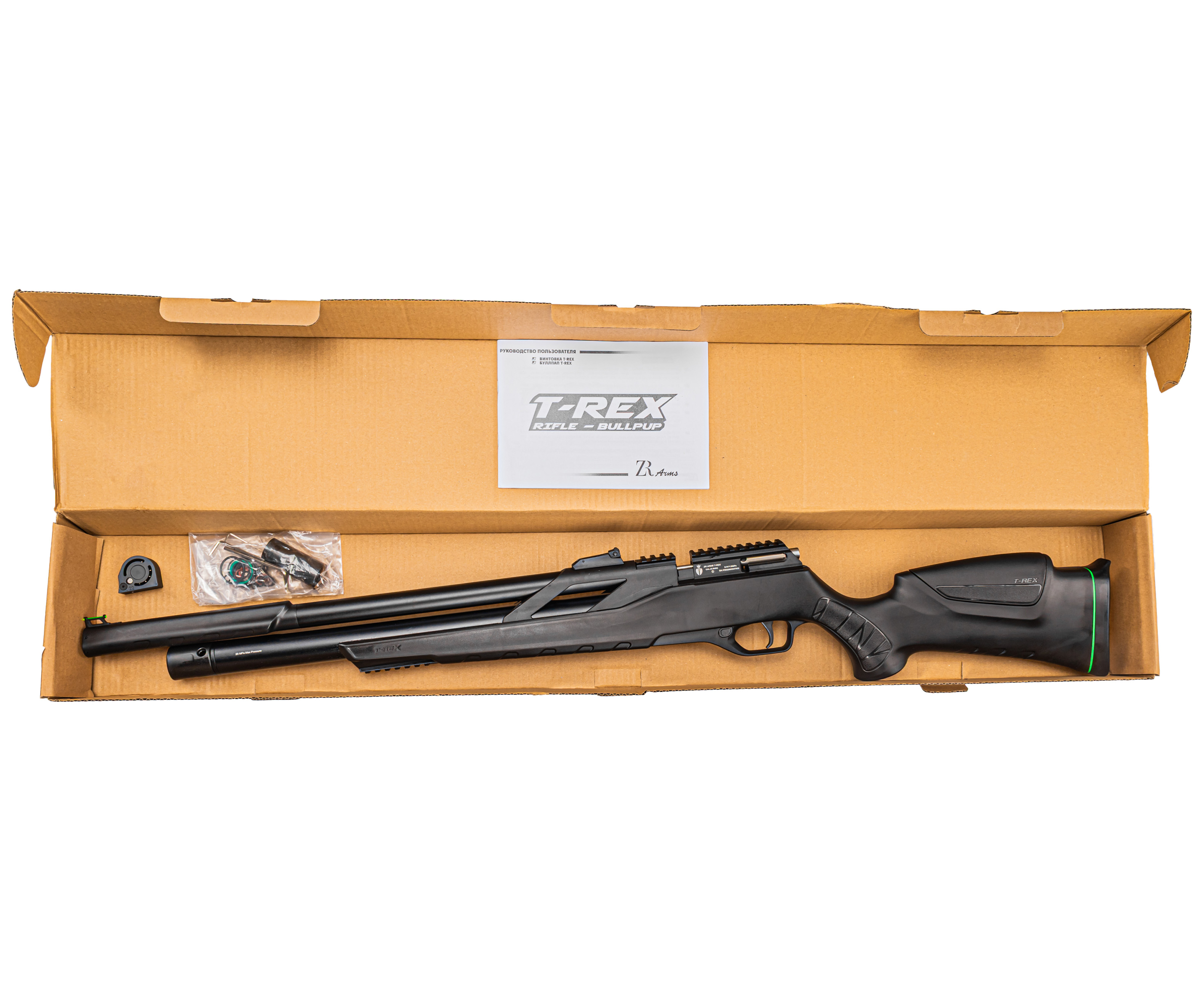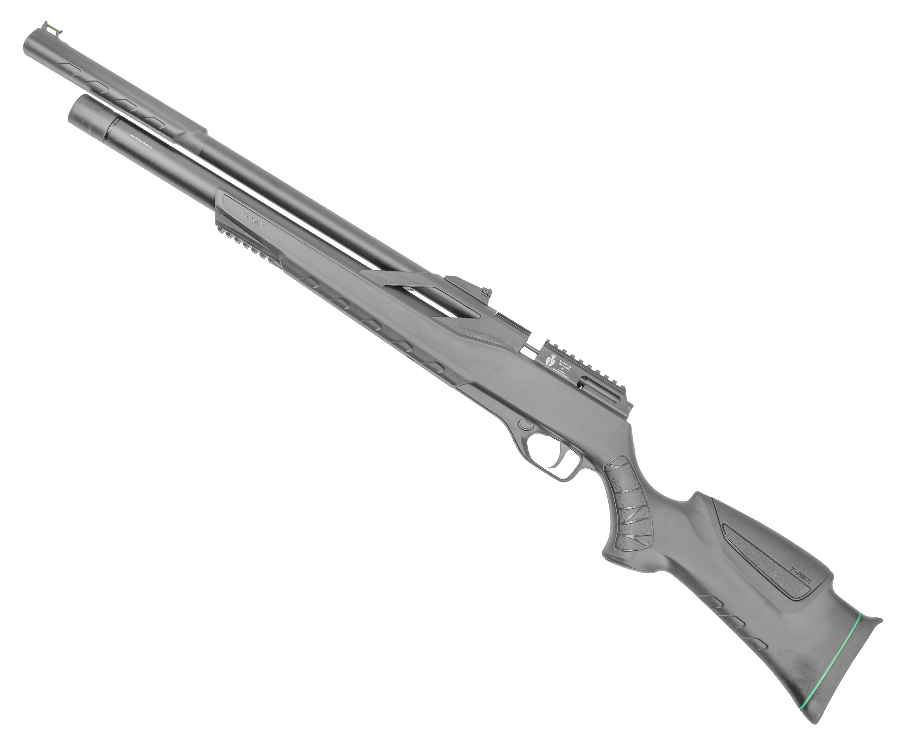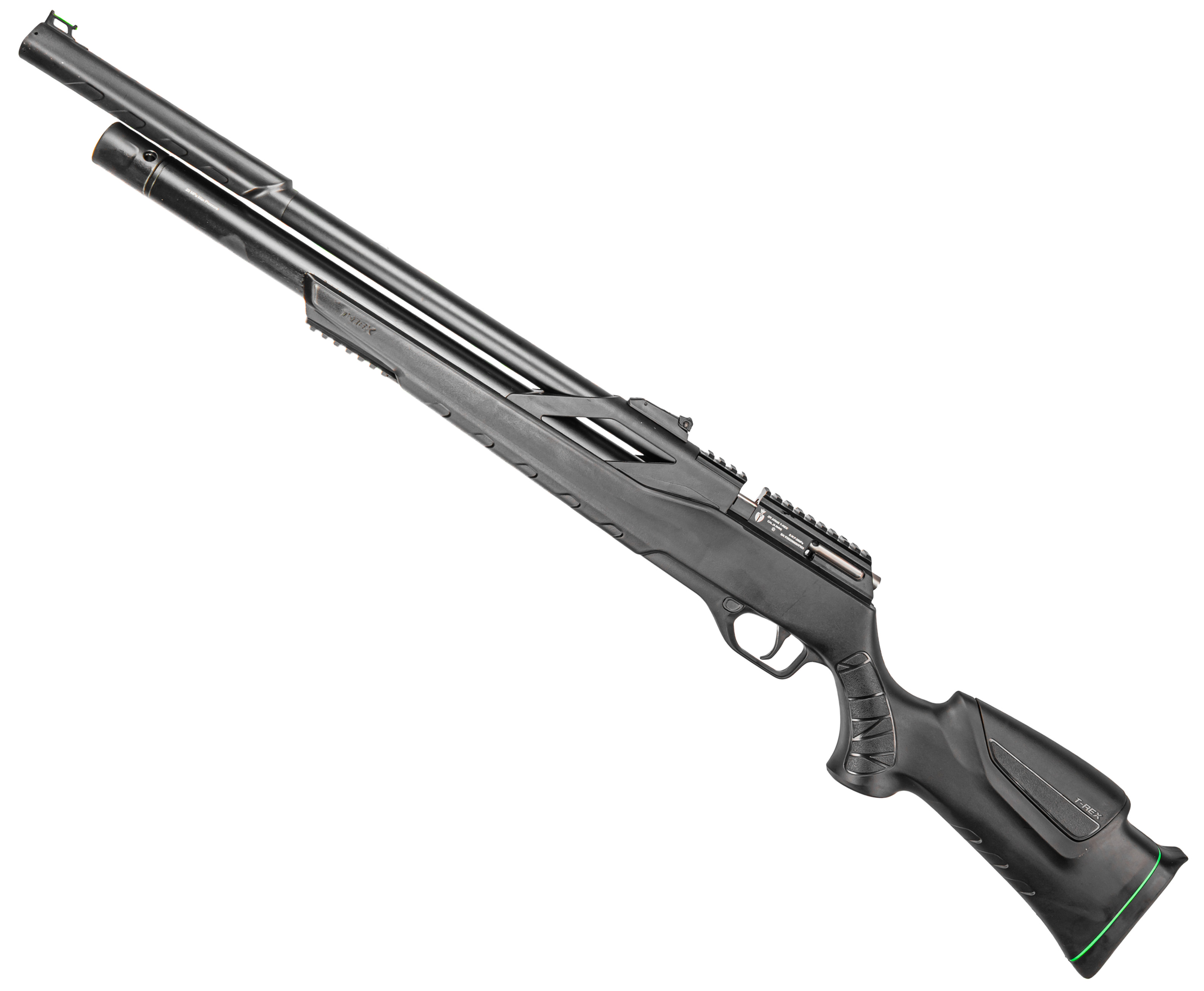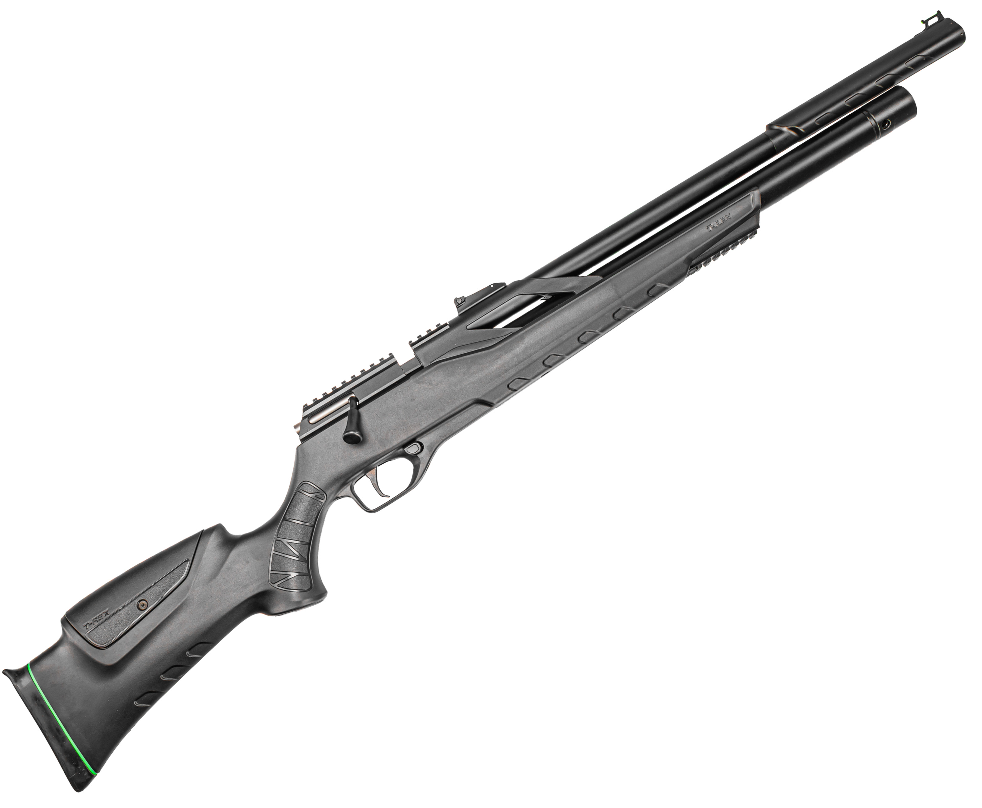 Модельный ряд T-Rex выпускают в двух устоявшихся форм-факторах - в этом случае оружие представили в классической винтовочной компоновке с ложей из полимера, получившей тактический дизайн. Представленная фурнитура благоприятно отражается на комфорте вкладки, вместе с чем позволяет дооснастить пневматику тюнингом - под него в передней части предусмотрели планку. Стандарт последней - Вивер 22 мм, такой же, как и у рельсы для оптических прицелов на ствольной коробке.