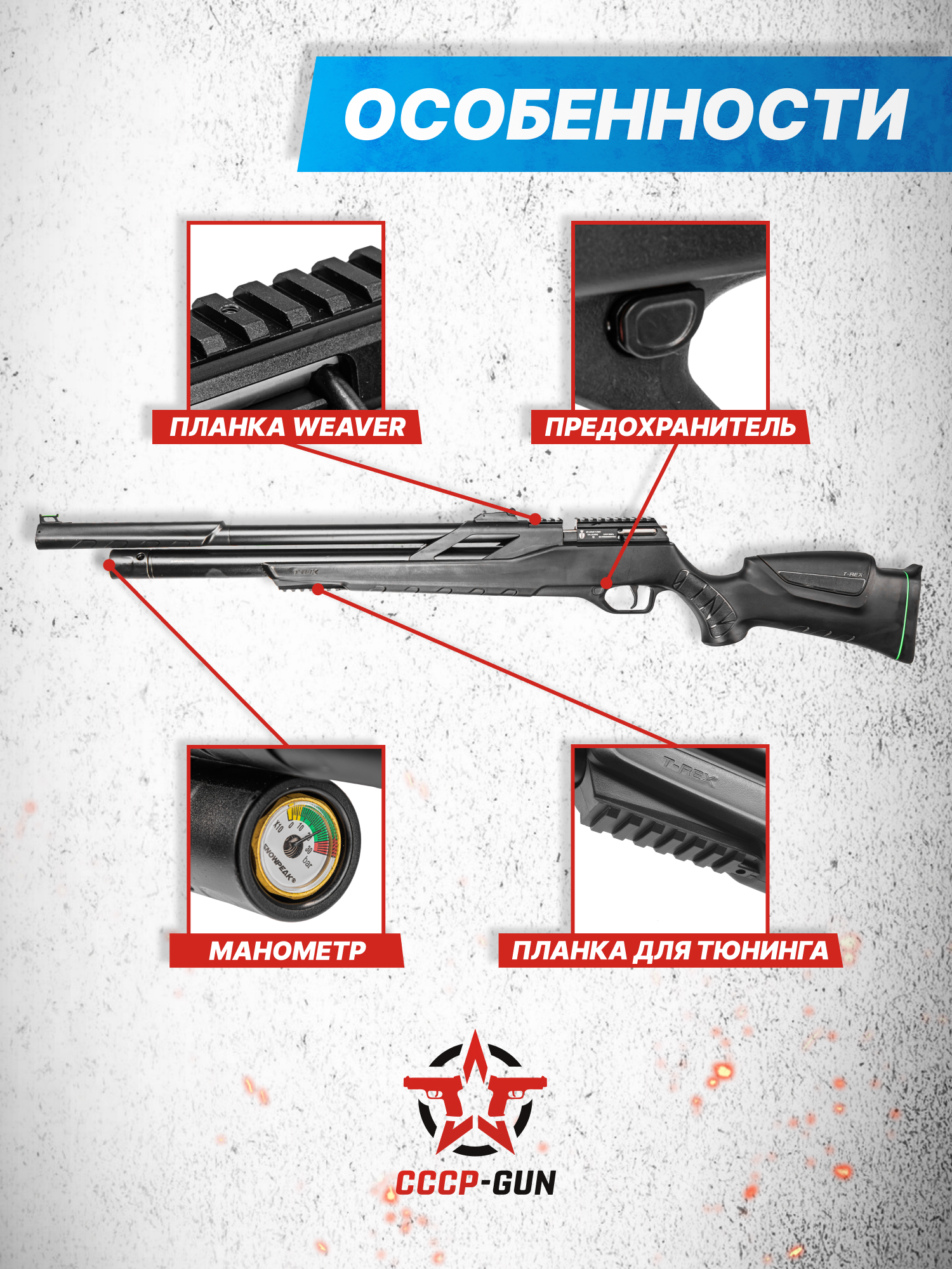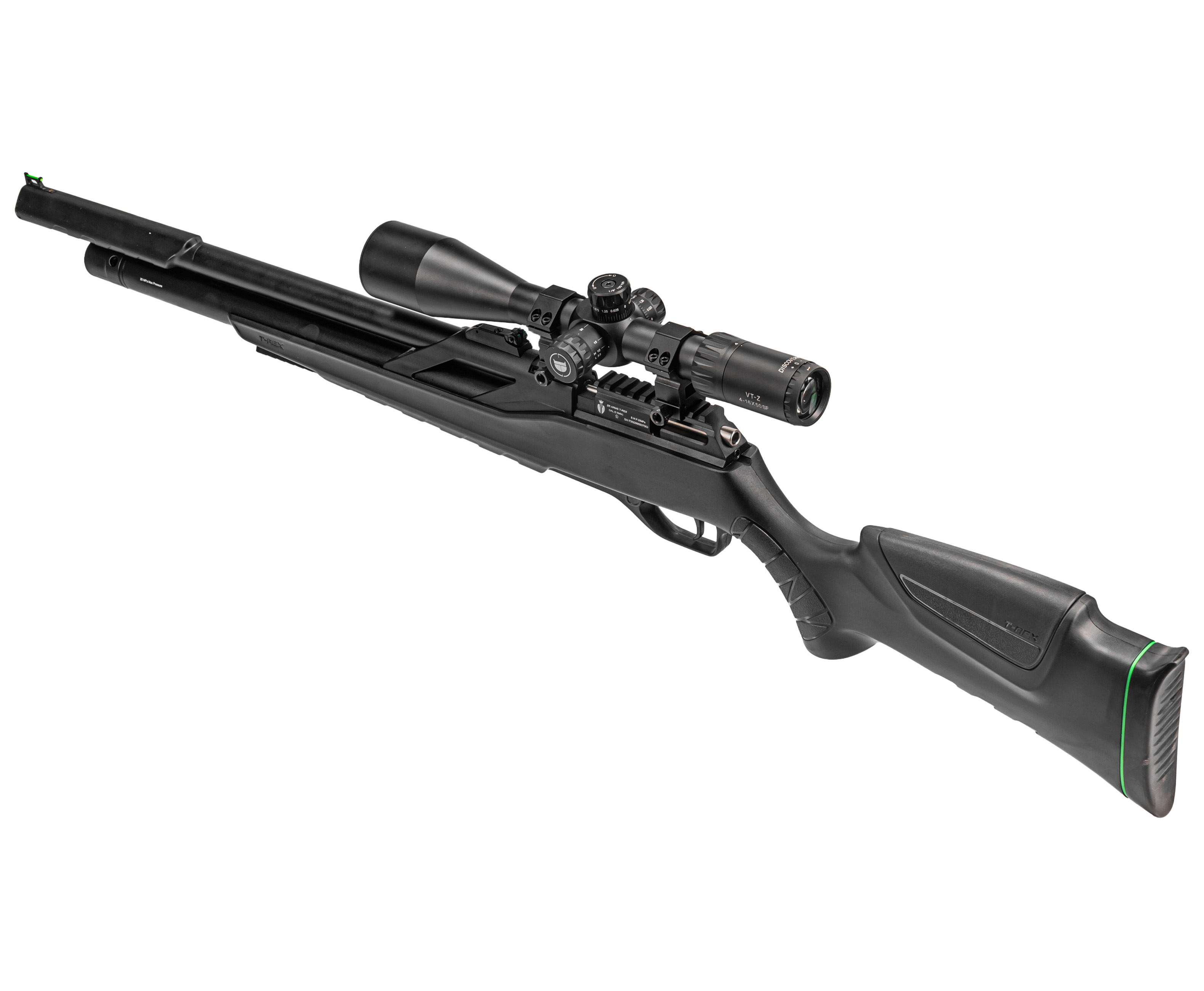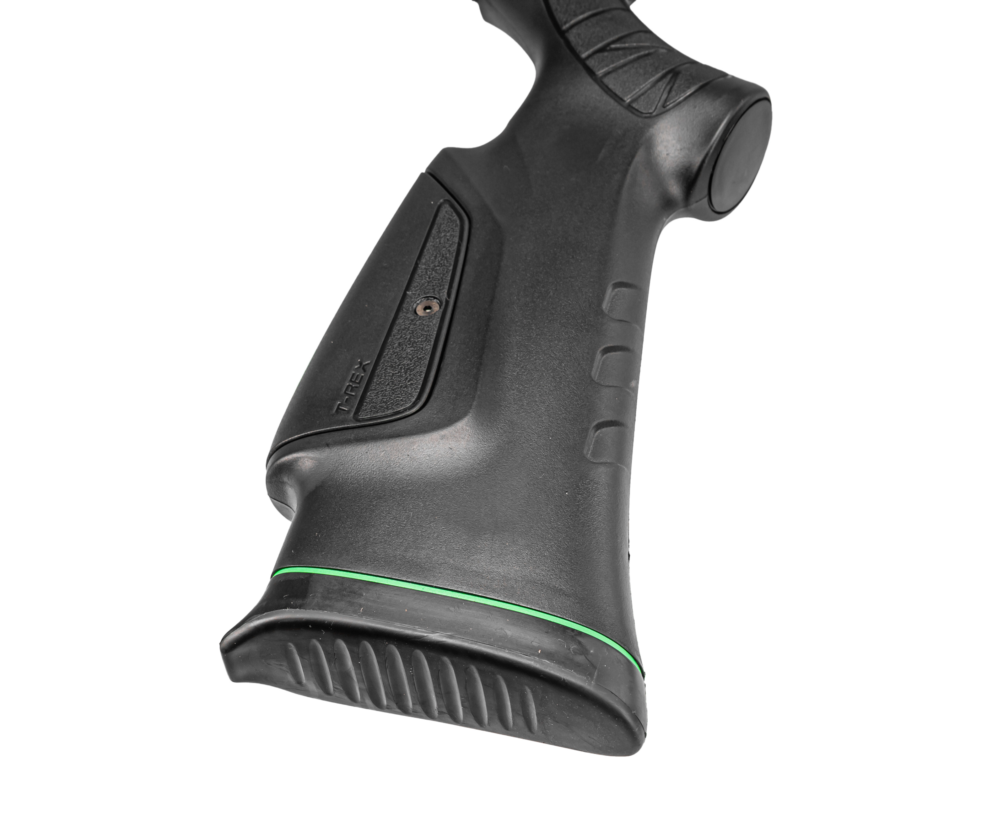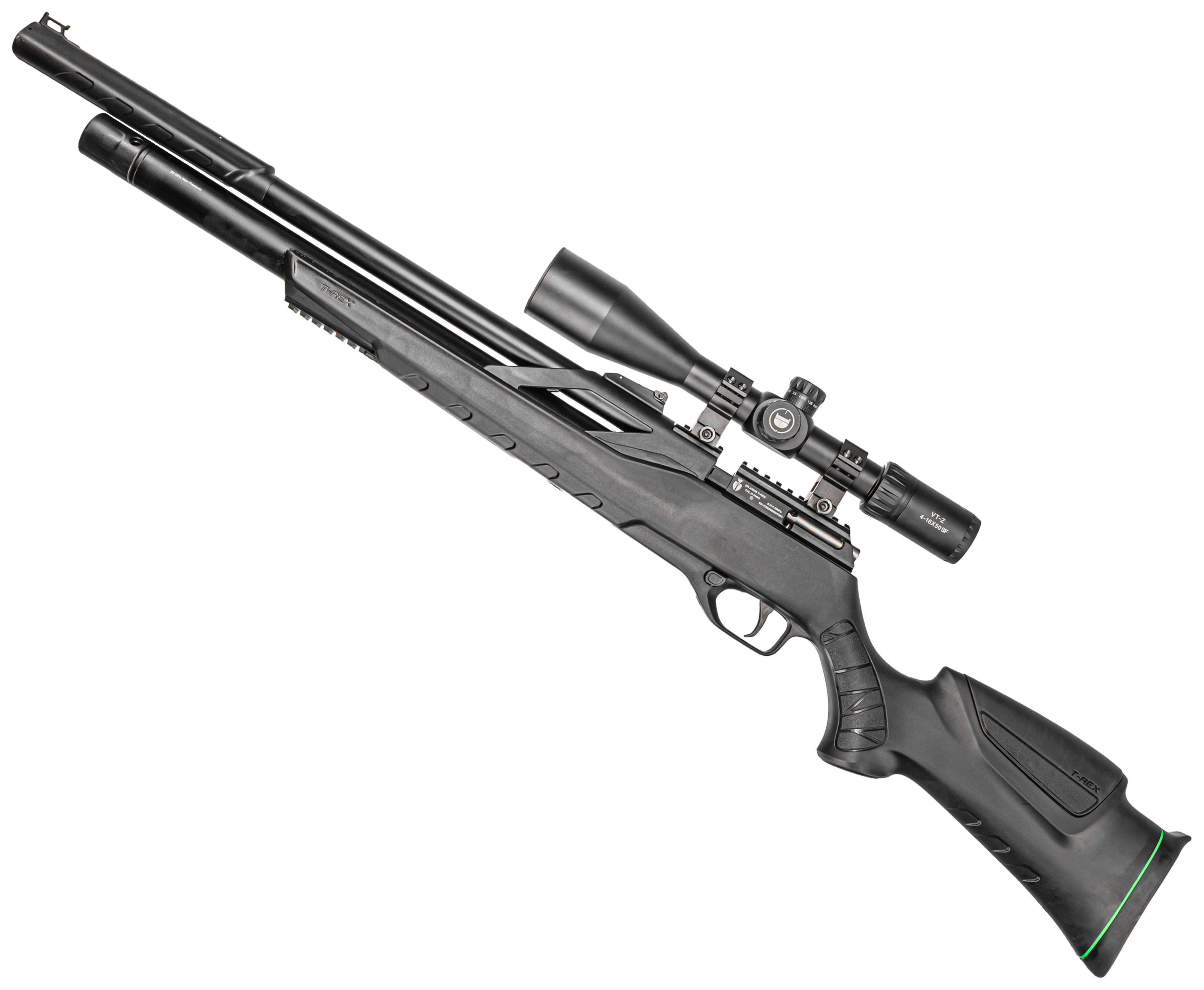 Модельный ряд T-Rex выпускают в двух устоявшихся форм-факторах - в этом случае оружие представили в классической винтовочной компоновке с ложей из полимера, получившей тактический дизайн. Представленная фурнитура благоприятно отражается на комфорте вкладки, вместе с чем позволяет дооснастить пневматику тюнингом - под него в передней части предусмотрели планку. Стандарт последней - Вивер 22 мм, такой же, как и у рельсы для оптических прицелов на ствольной коробке.