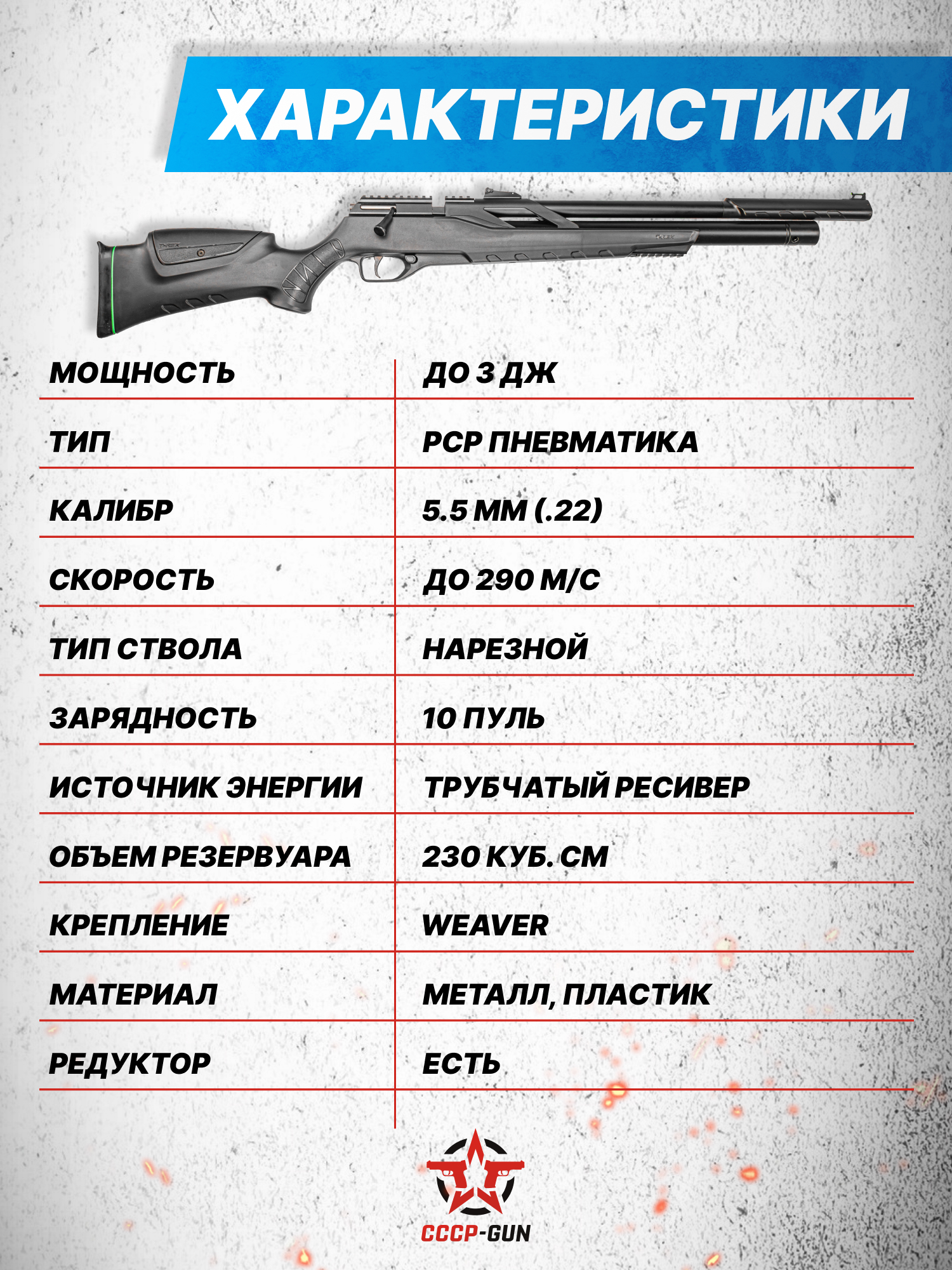 Скорость покидающих ствол снарядов в зарубежных исполнениях ЗР Армс T-Rex обычно достигает 290 метров в секунду, что ставит эту пневматику в один ряд с более тяжелыми и габаритными моделями - в этом же случае масса составила 3180 г при длине 1050 мм. Но здесь следует понимать, что выдает на деле PCP винтовка 3 Дж дульной энергии - производитель приходит к этой мере по требованию законодательства. В этой связи воздушка не потребует обращения в лицензионный отдел для получения разрешения.