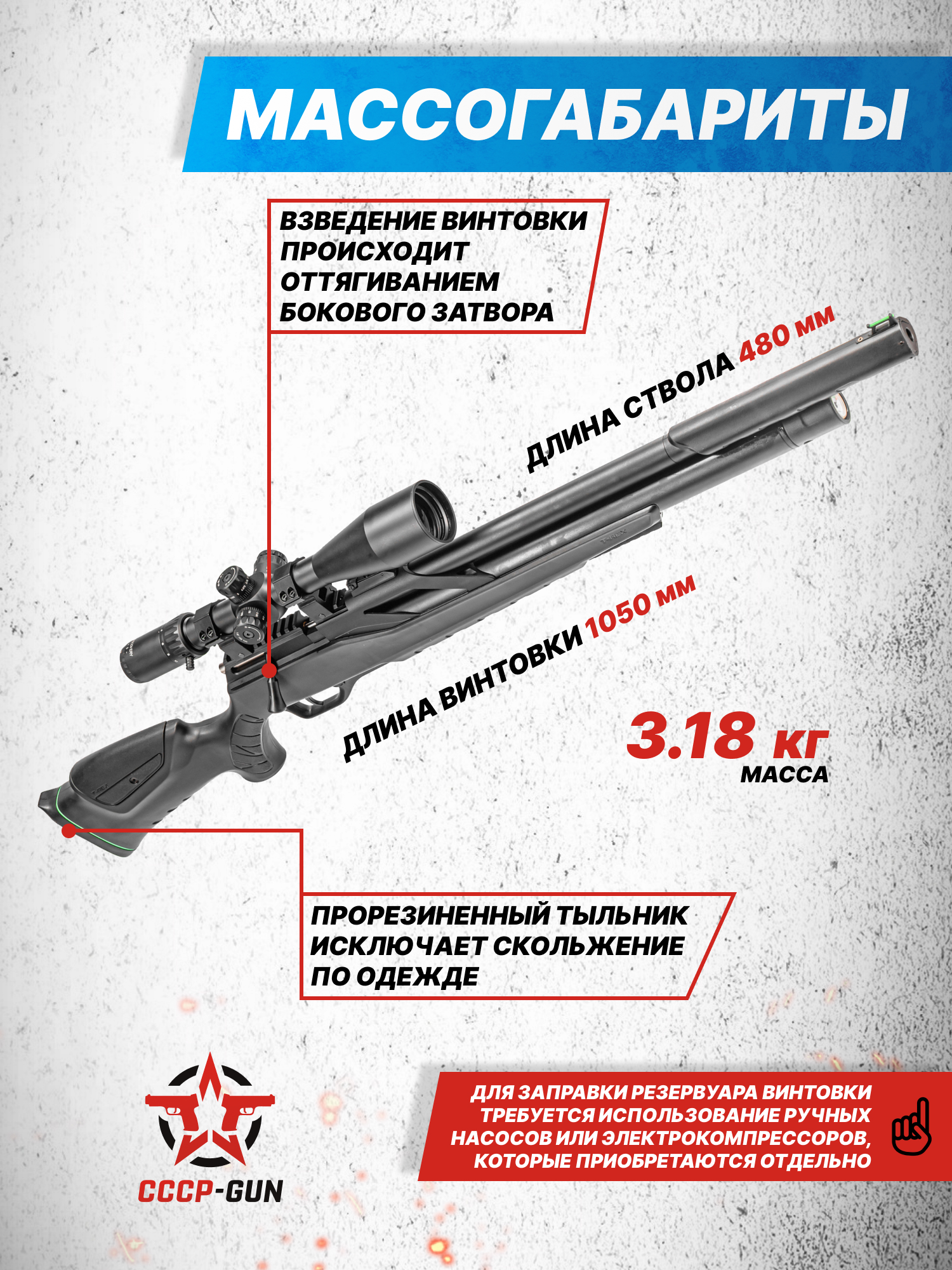 Модель Тирекс выпустили в классическом калибре 5.5 миллиметра - для стрельбы потребуются свинцовые пули. Как и полагается современному оружию, заряды попадают в ствол не с помощью руку, а из предварительно заряженного пользователем магазина на 10 мест - двигать ячейки со снарядами самостоятельно не надо, барабан провернется автоматически. Взвод у модели оставили классический, болтовой, но оформили комфортной полимерной рукояткой.