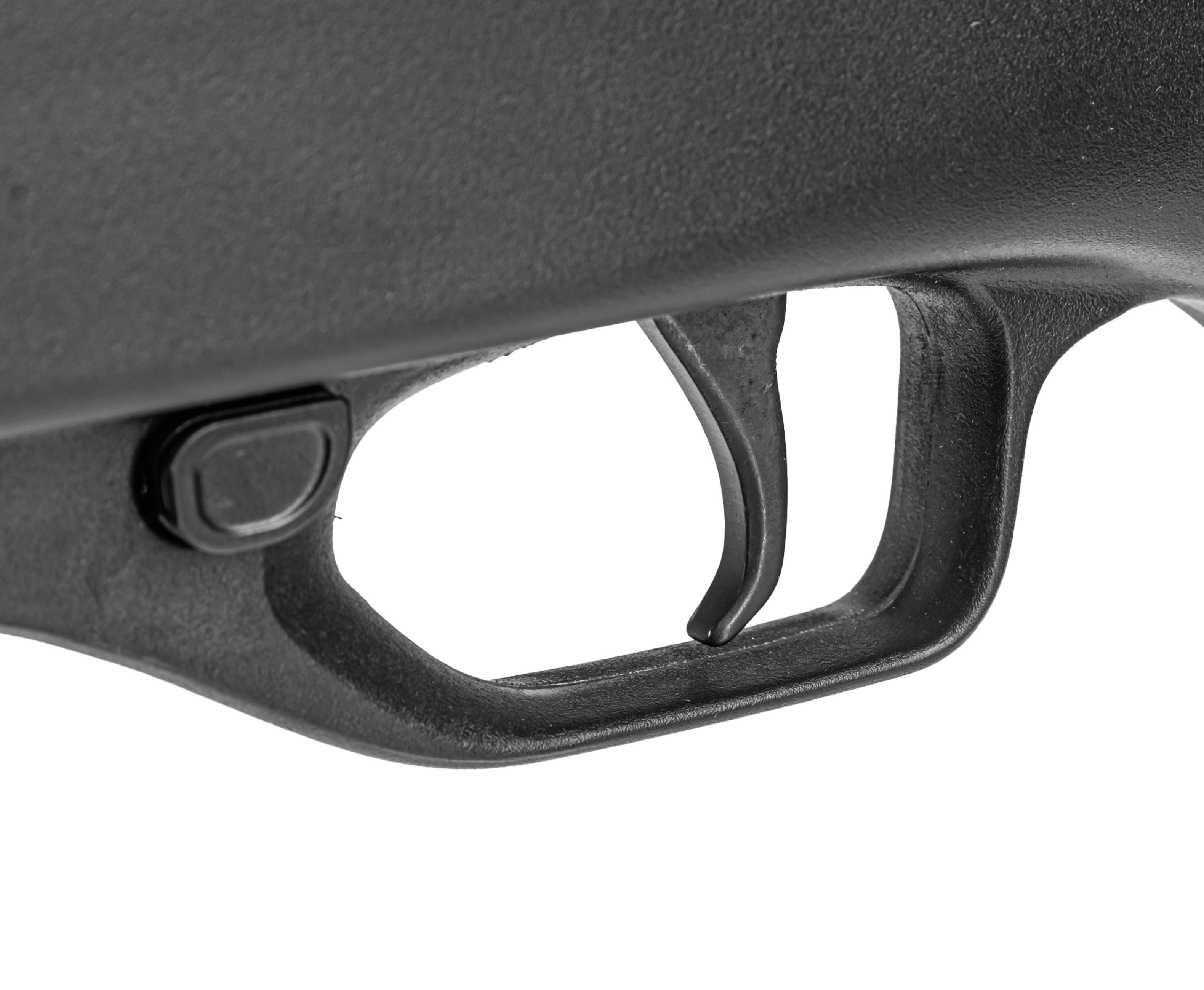 Предохранительный механизм расположен в пределах спусковой скобы, в непосредственной близости от указательного пальца - необходимость отрываться от приклада для перевода оружия в безопасное состояние отсутствует. Для взвода требуется перед каждым выстрелом обращаться к продольно-скользящему затвору.