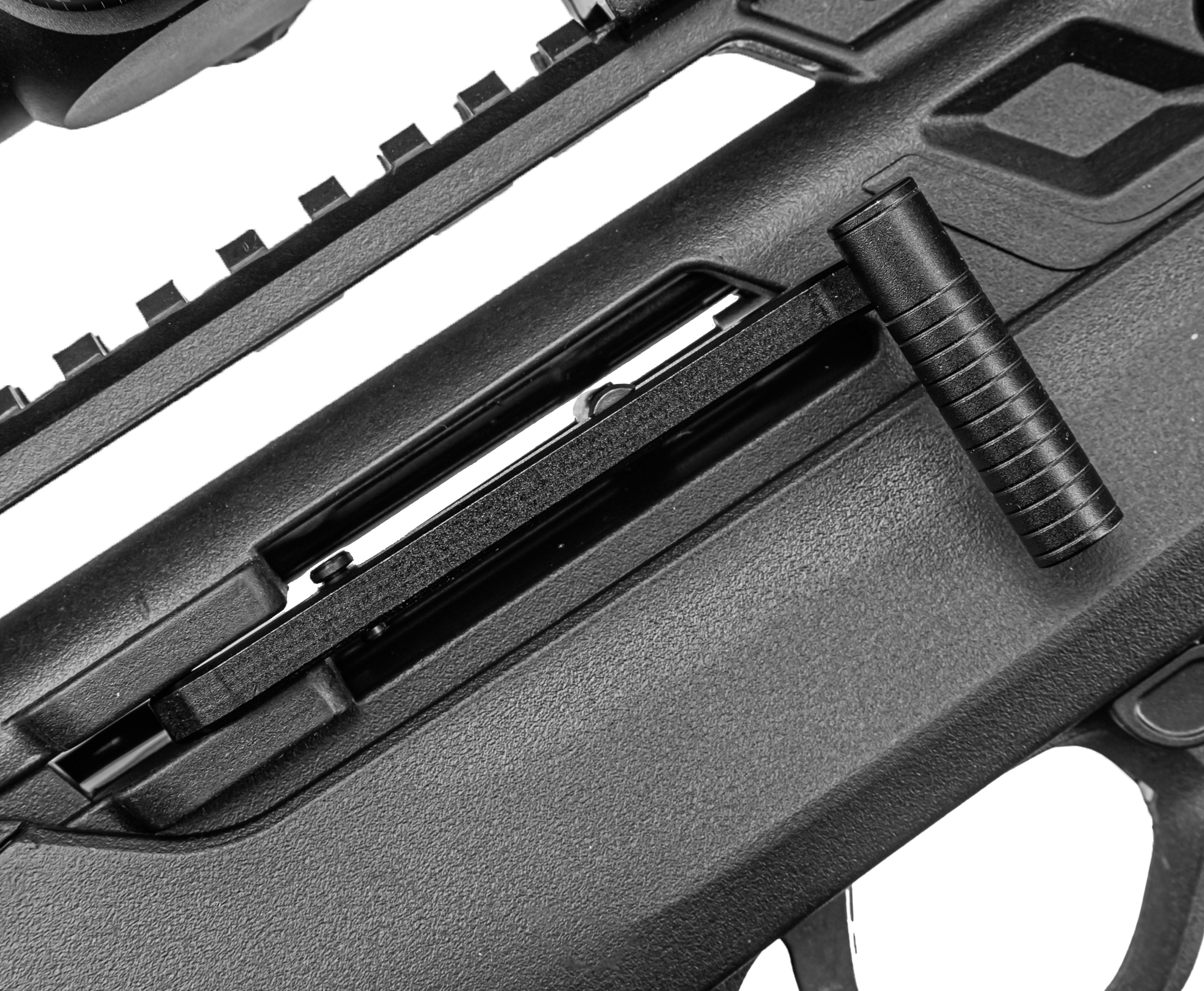 При этом габарит ствола равен 53 сантиметрам - модель предусматривает нарезной бланк со встроенным саундмодератором для понижения звука выстрела, что актуально при эксплуатации образца в помещении. Перед метанием заряда нужно оттянуть затвор, а от непреднамеренного нажатия на спуск предохраняет механизм в виде кнопки, которая размещается непосредственно перед спусковой скобой.