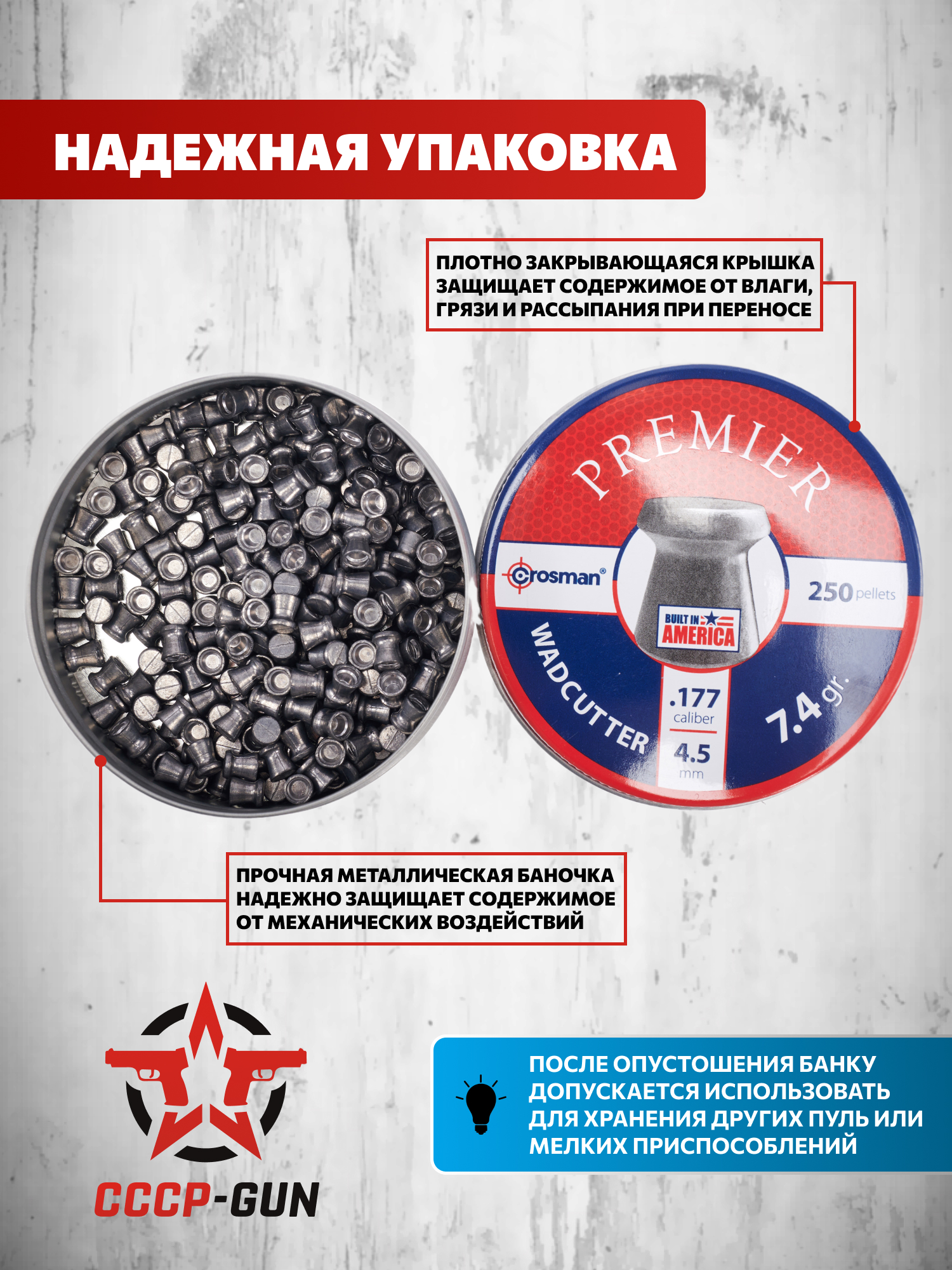 Американский бренд Crosman много лет выпускает боеприпасы для пневматики и пользуется спросом среди стрелков начального и продвинутого уровня. У линейки компании представлены пули разнообразной формы и назначения, включая серию с плоской головной частью для точной работы по бумажным мишеням. Модель Wadсutter 4.5 мм рассчитана на тиры, тренировочную и развлекательную стрельбу.