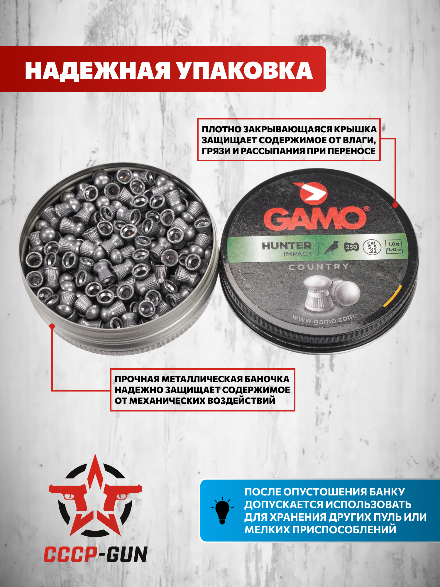 В одной упаковке - 250 штук. Такой объем подходит для регулярной практики, настройки прицела или охотничьего выезда. Компактная жестяная банка надежно защищает пули при защите от влаги и механических повреждений при транспортировке и хранении.