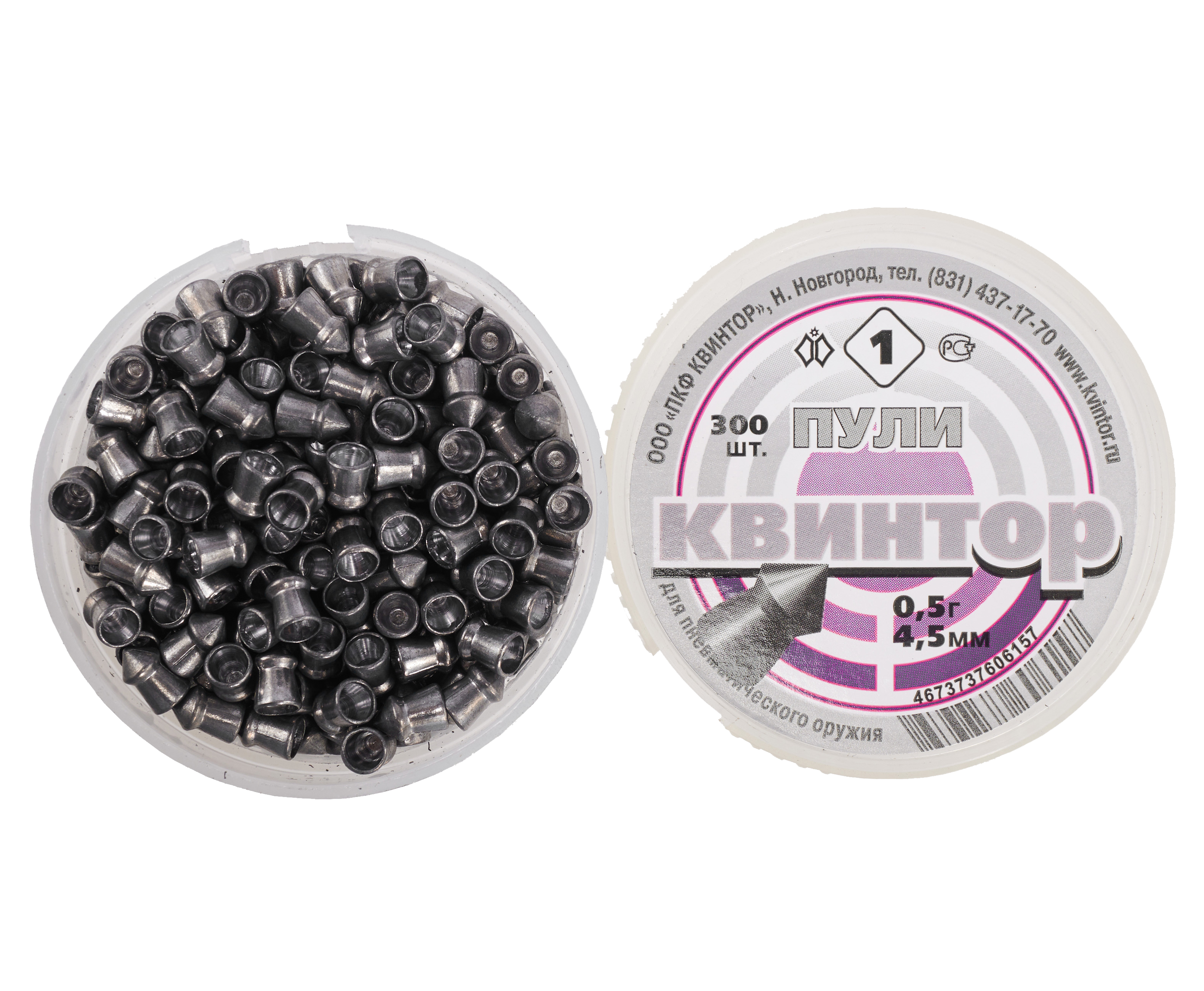 Упаковка Квинтор 1 включает 300 штук. Такой объем подходит для регулярных тренировок - стрелку не придется часто пополнять запас. Контейнер можно комфортно хранить и перевозить, он плотно закрывается и защищает пули от внешних угроз.