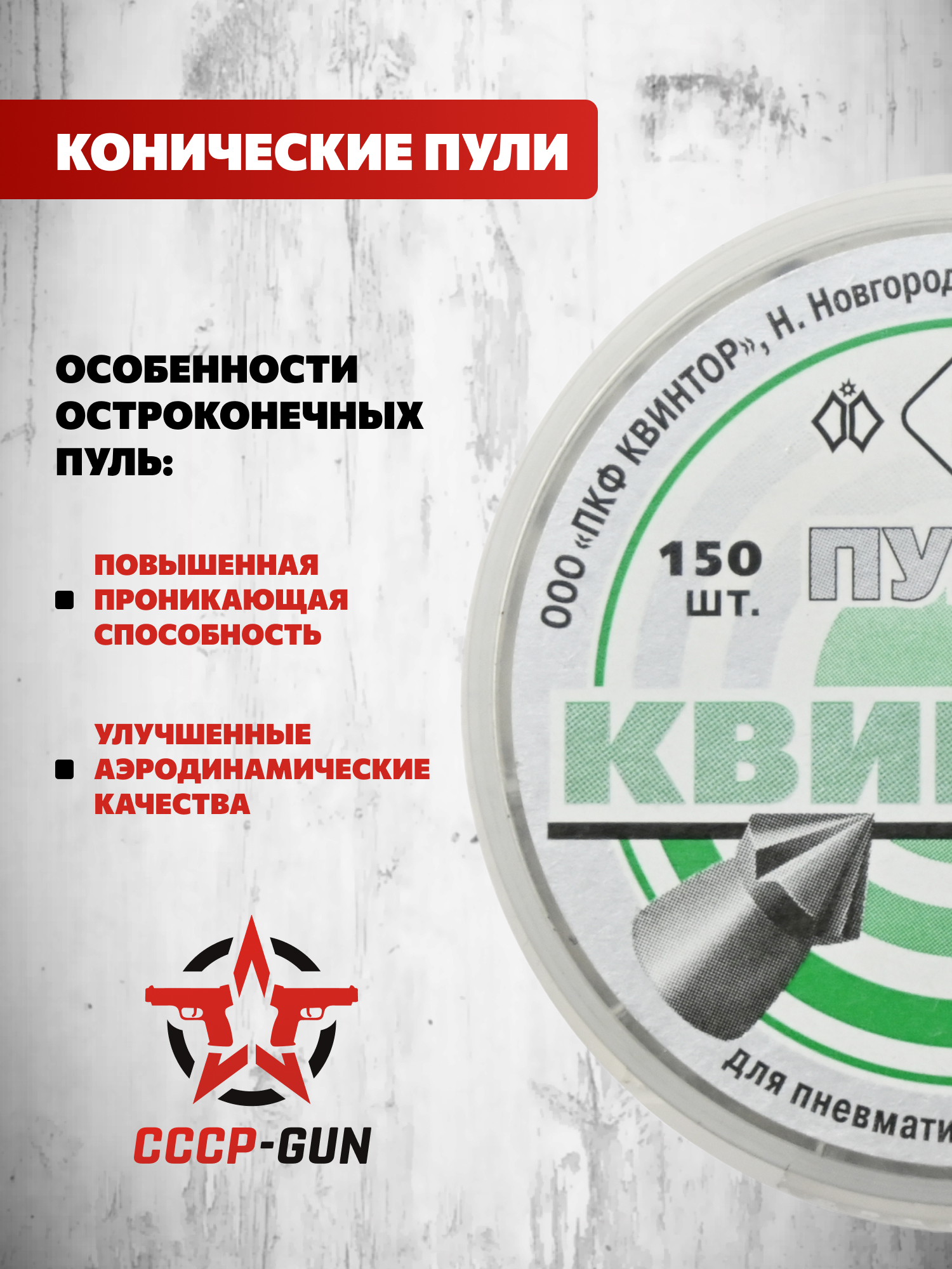 Конический силуэт пули для пневматики Квинтор усиливает проникающую способность, а насечки предназначены для улучшения стабилизации в полете. Заостренный профиль, оптимизирующий траекторию, эффективен против твердых мишеней. Это свойство выгодно для стрельбы по деревянным или пластиковым целям.